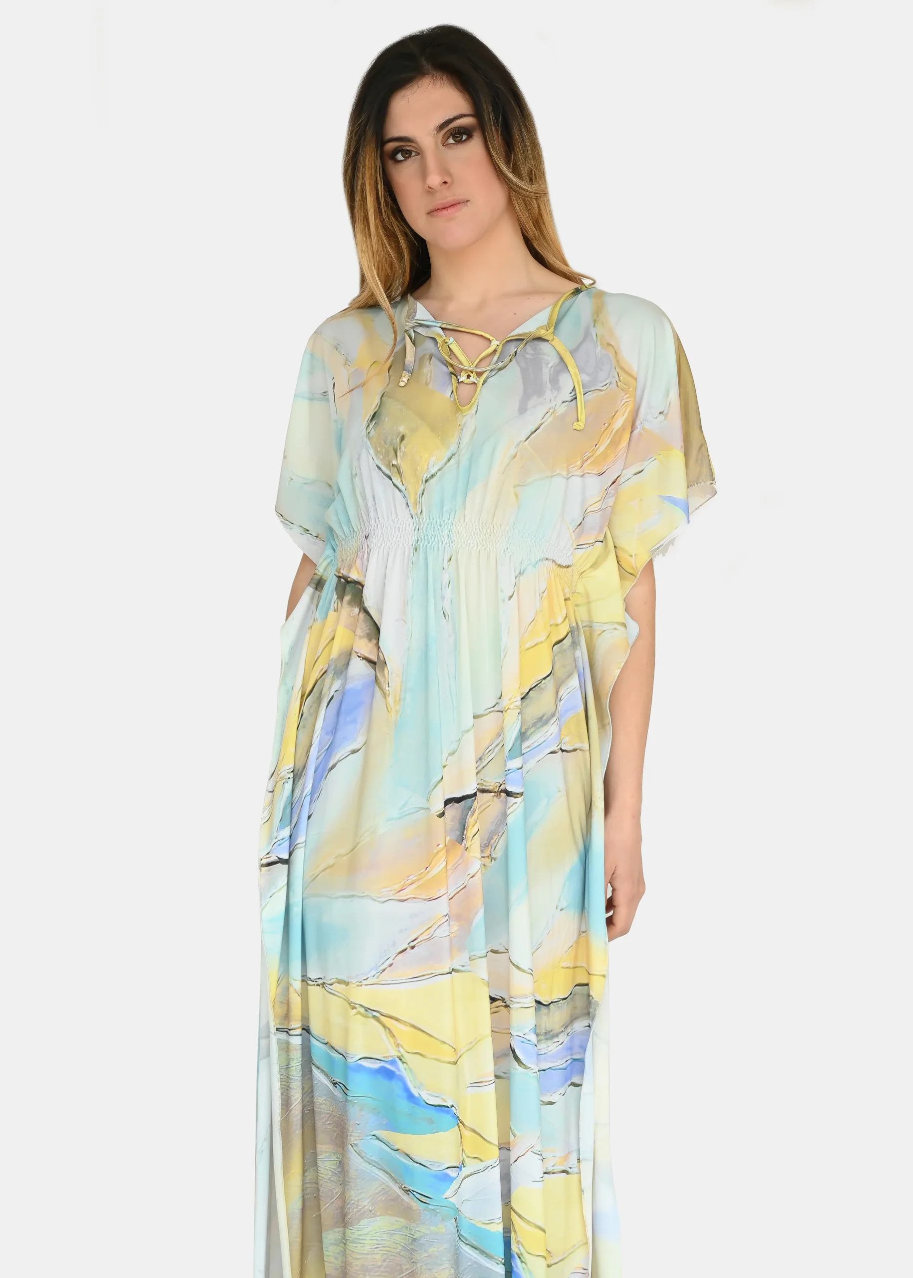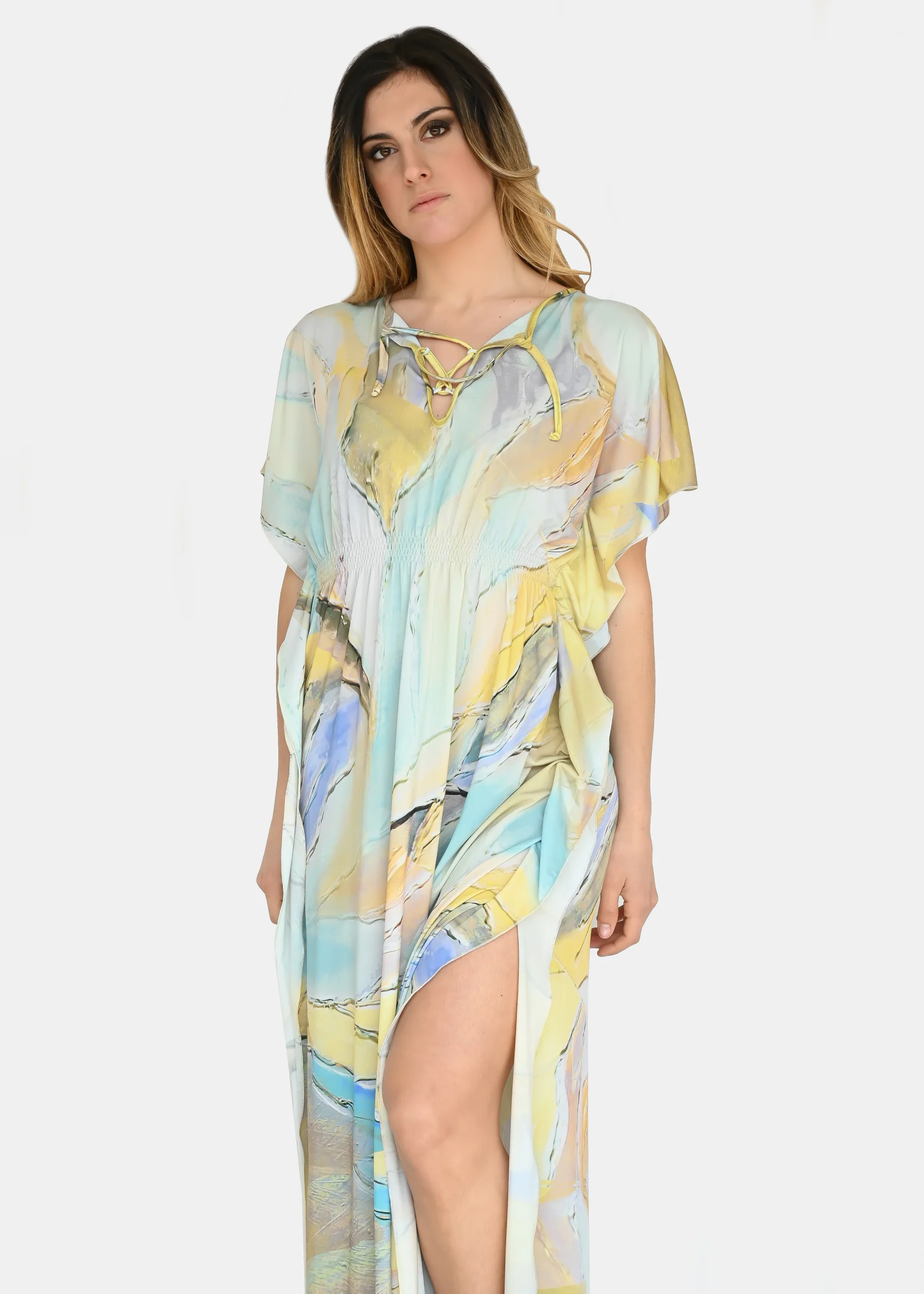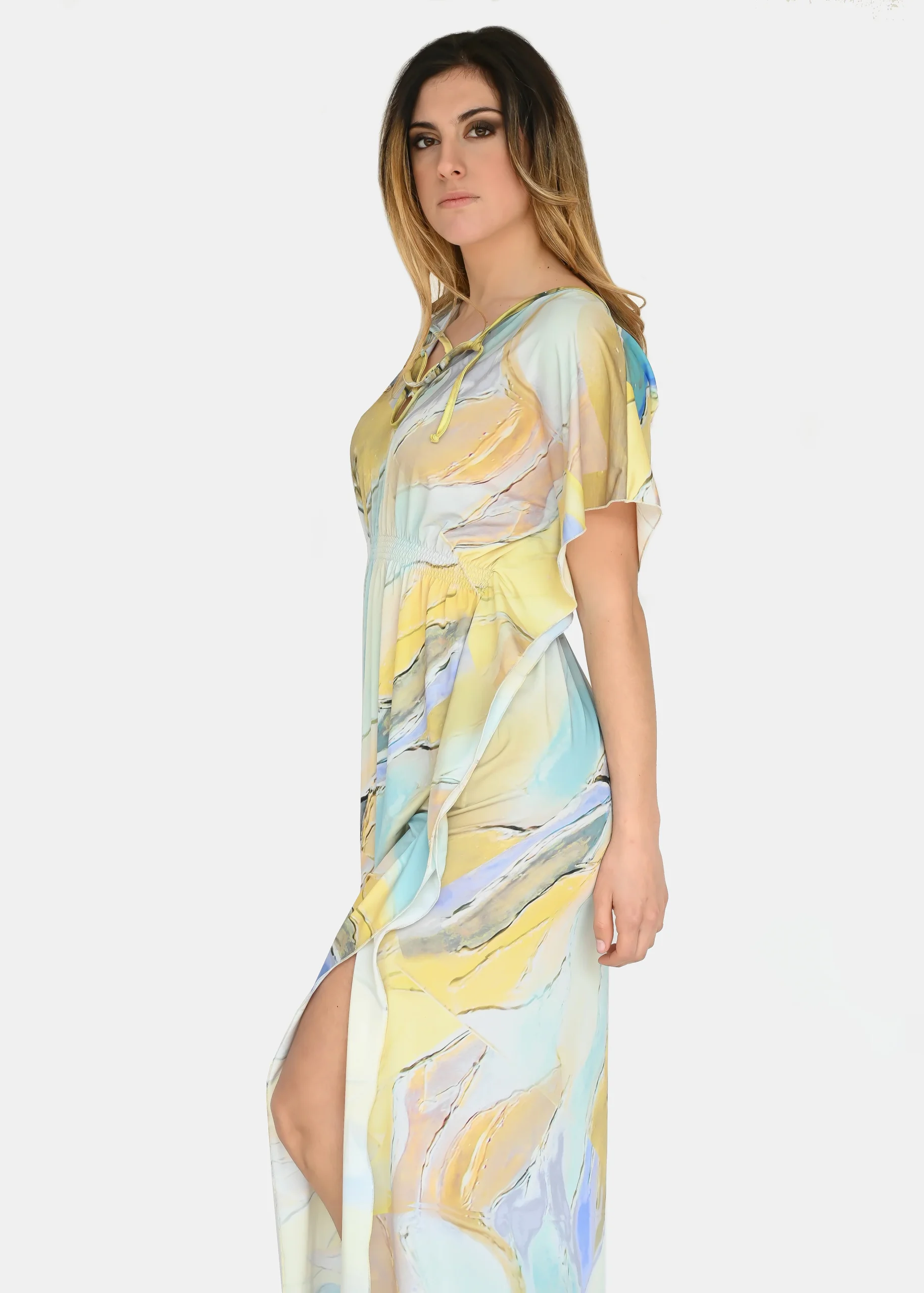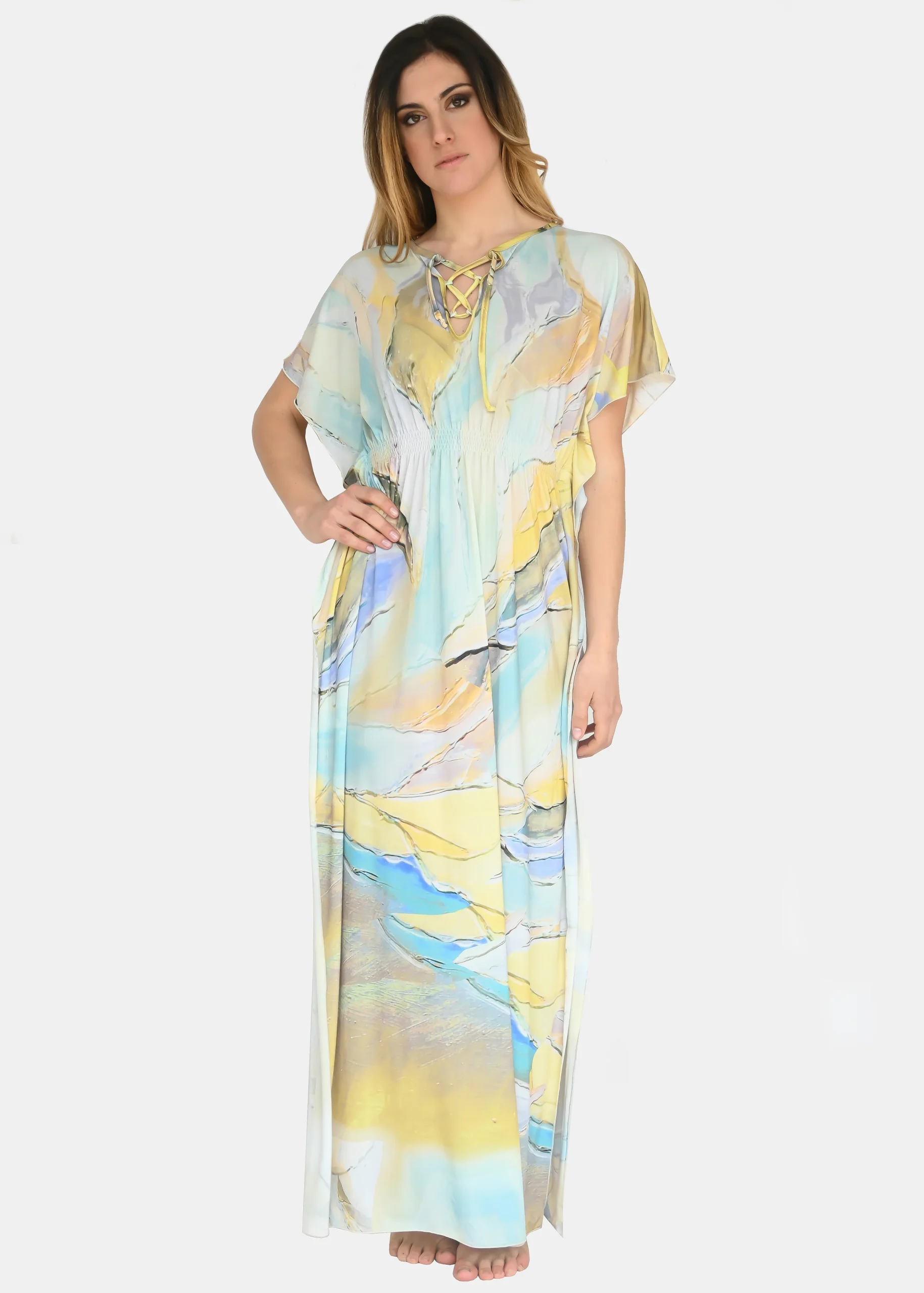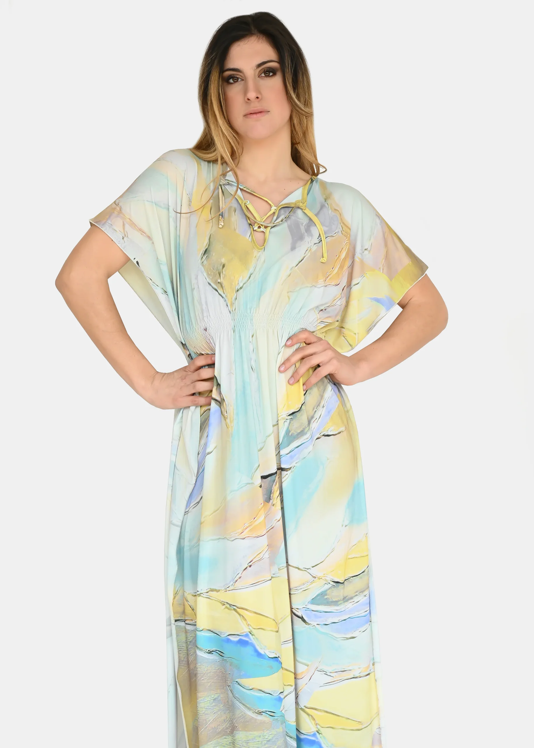 jersey “Incendio Giallo”, riporta uno dei tanti dipinti di Millyblu. Confortevole, fresco e morbido. Ha un profondo spacco laterale con incrocio sulla scollatura ed elastico in vita. Comodo per le lunghe giornate estive come caftano elegante, copricostume mare o fuori acqua. Taglia unica.