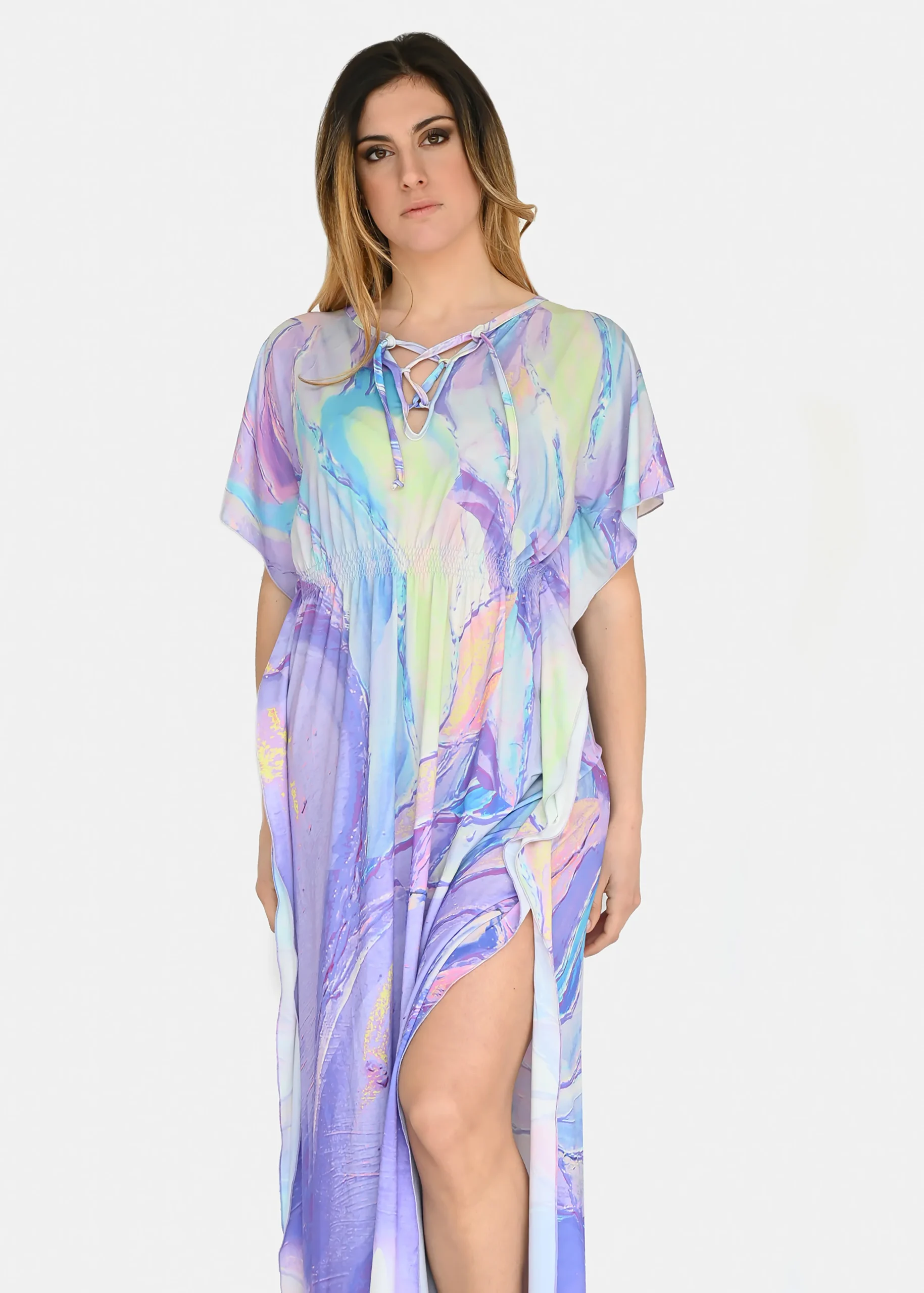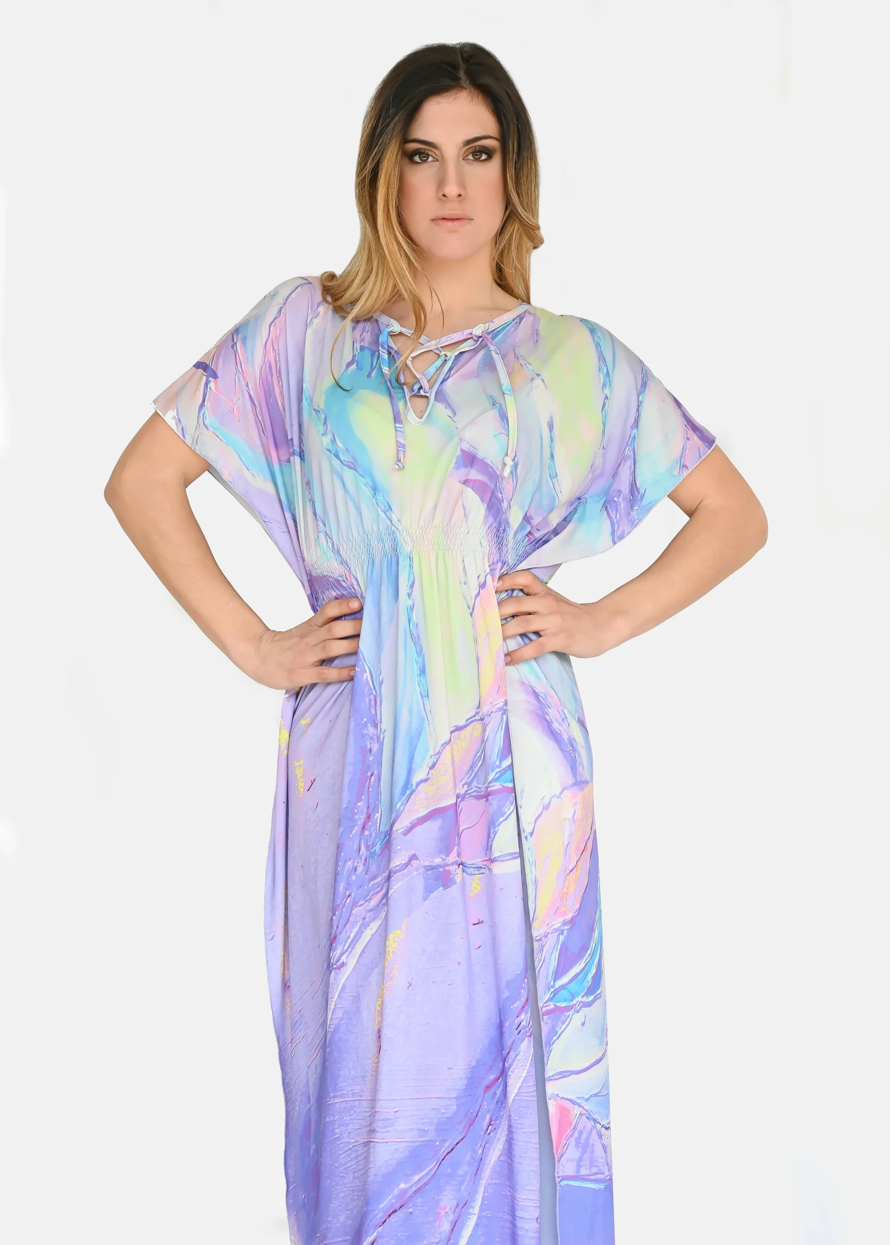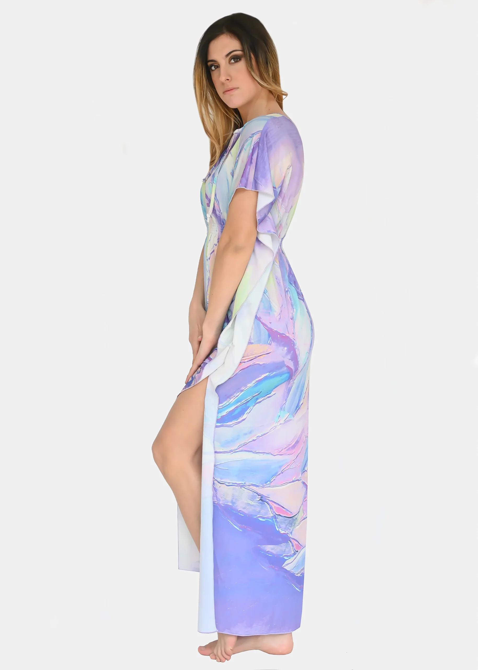jersey “Incendio Viola”, riporta uno dei tanti dipinti di Millyblu. Confortevole, fresco e morbido. Ha un profondo spacco laterale con incrocio sulla scollatura ed elastico in vita. Comodo per le lunghe giornate estive come caftano elegante, copricostume mare o fuori acqua. Taglia unica.