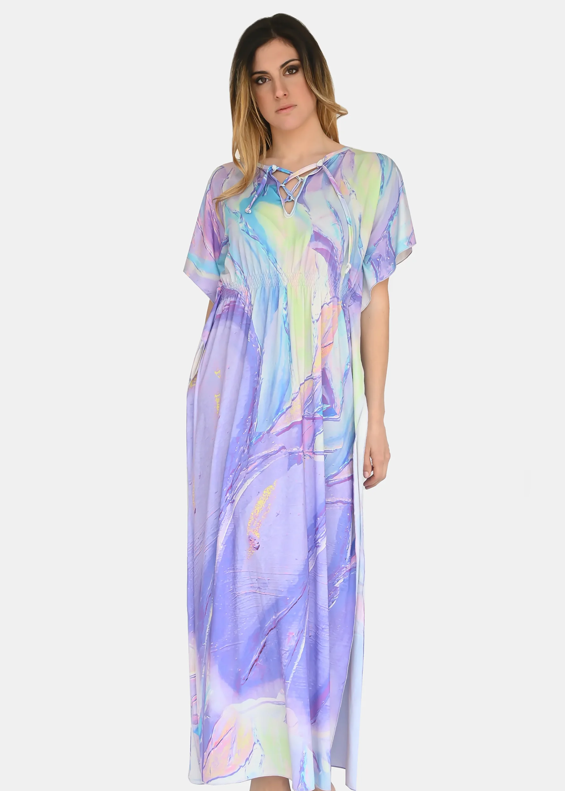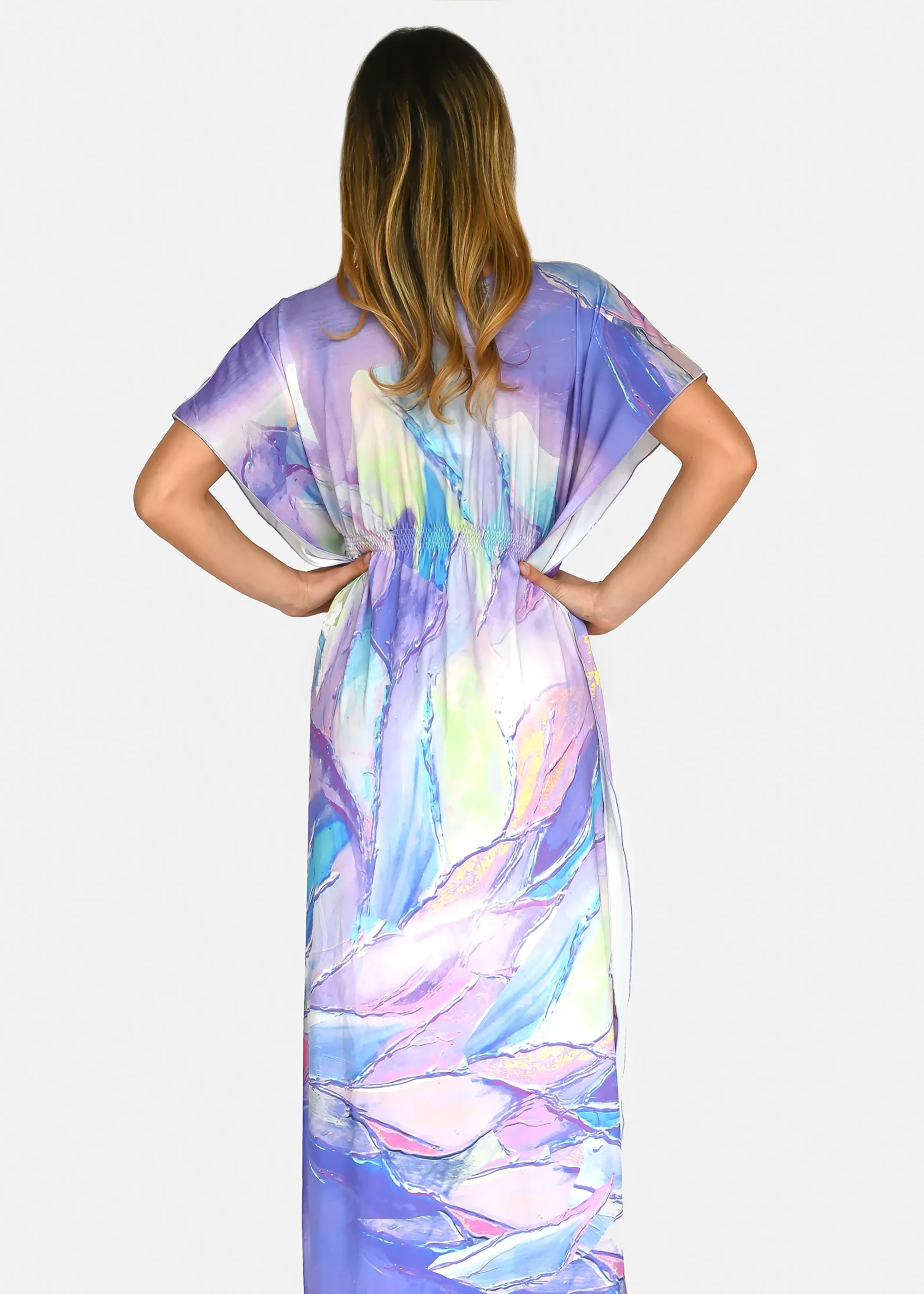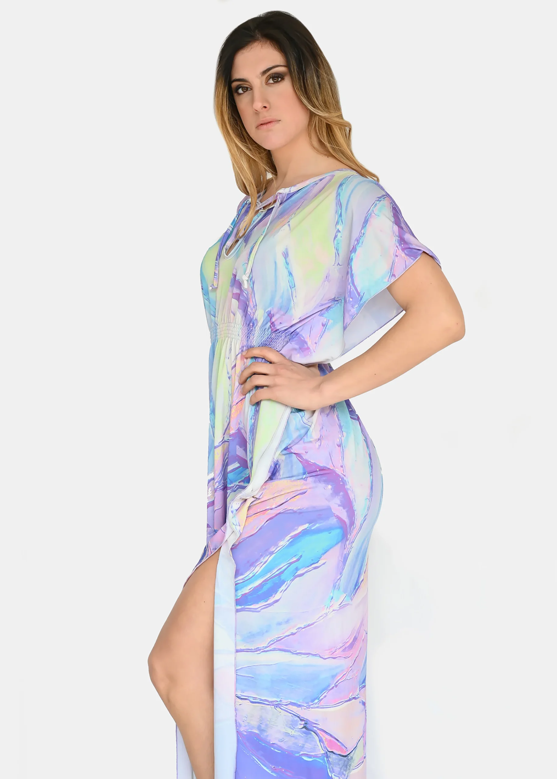 jersey “Incendio Viola”, riporta uno dei tanti dipinti di Millyblu. Confortevole, fresco e morbido. Ha un profondo spacco laterale con incrocio sulla scollatura ed elastico in vita. Comodo per le lunghe giornate estive come caftano elegante, copricostume mare o fuori acqua. Taglia unica.