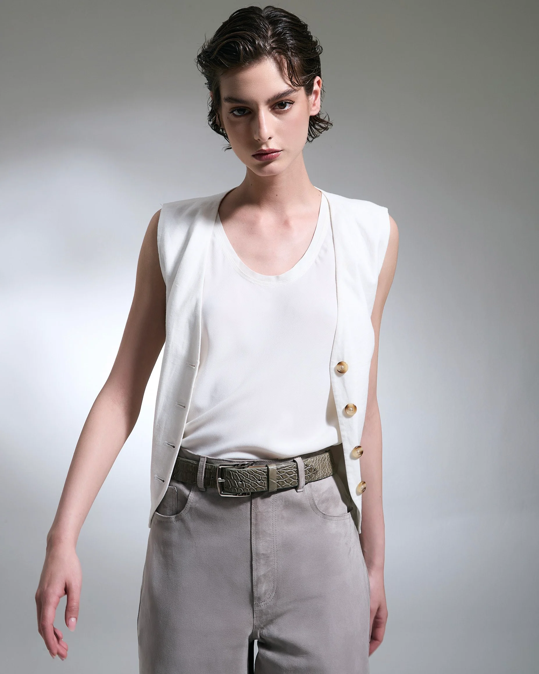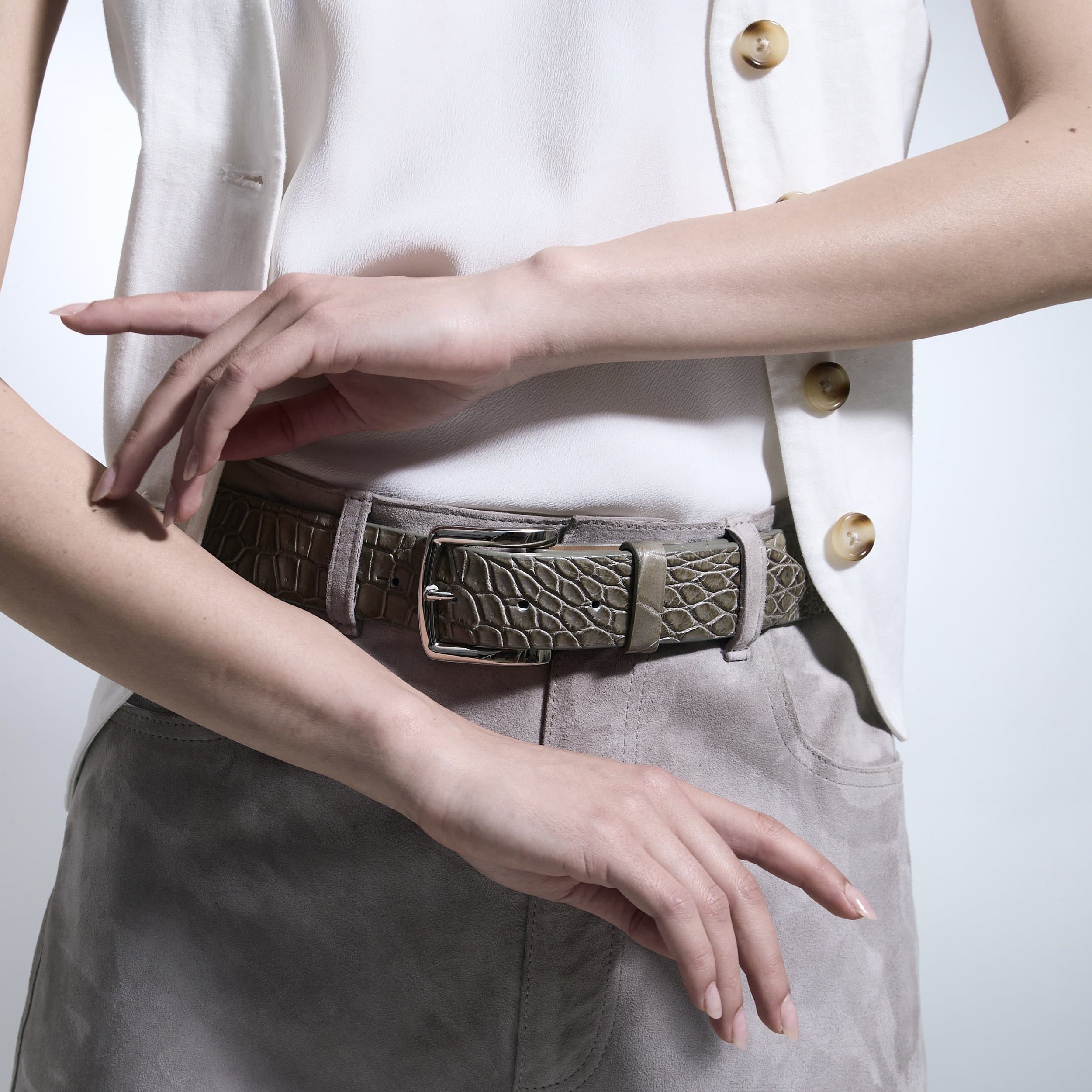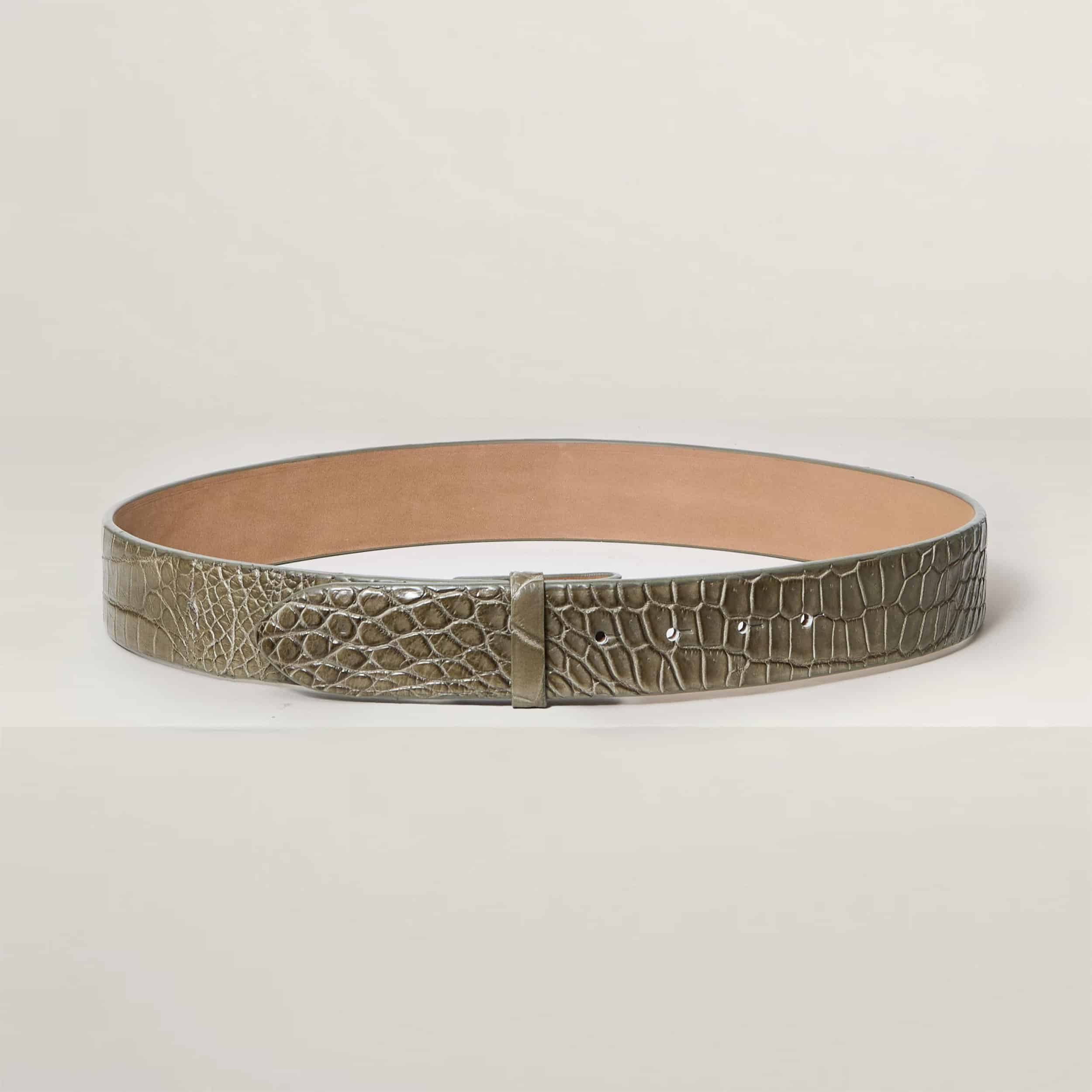 Altezza: 4 cm Origine: Made in Italy Materiale: Pelle di Coccodrillo Americano Chiusura: Chiusura bottoni, consente di personalizzare la tua cintura cambiando la fibbia. La cintura in coccodrillo americano Altea è l’accessorio perfetto per chi cerca un tocco di audacia e stile. Con la sua pelle unica, caratterizzata da una texture sofisticata, questa cintura aggiunge carattere a […]