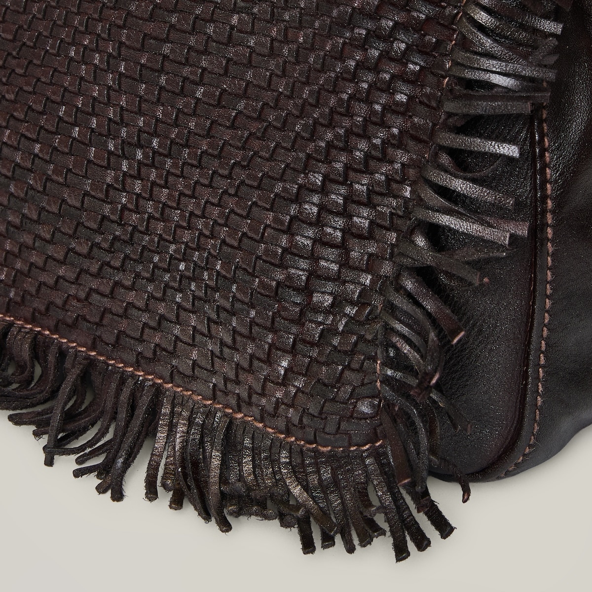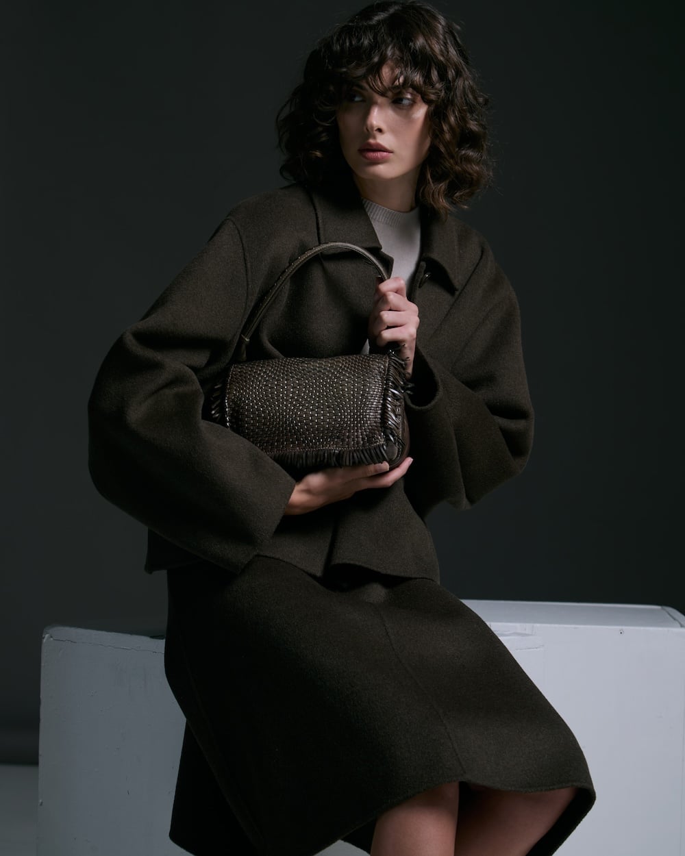 - Manico: In pelle con dettagli intrecciati, lungo 35 cm