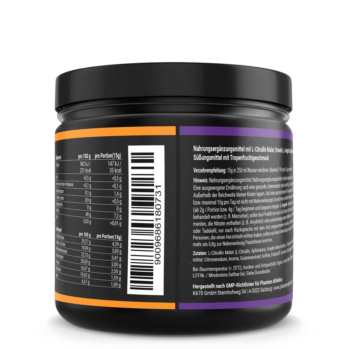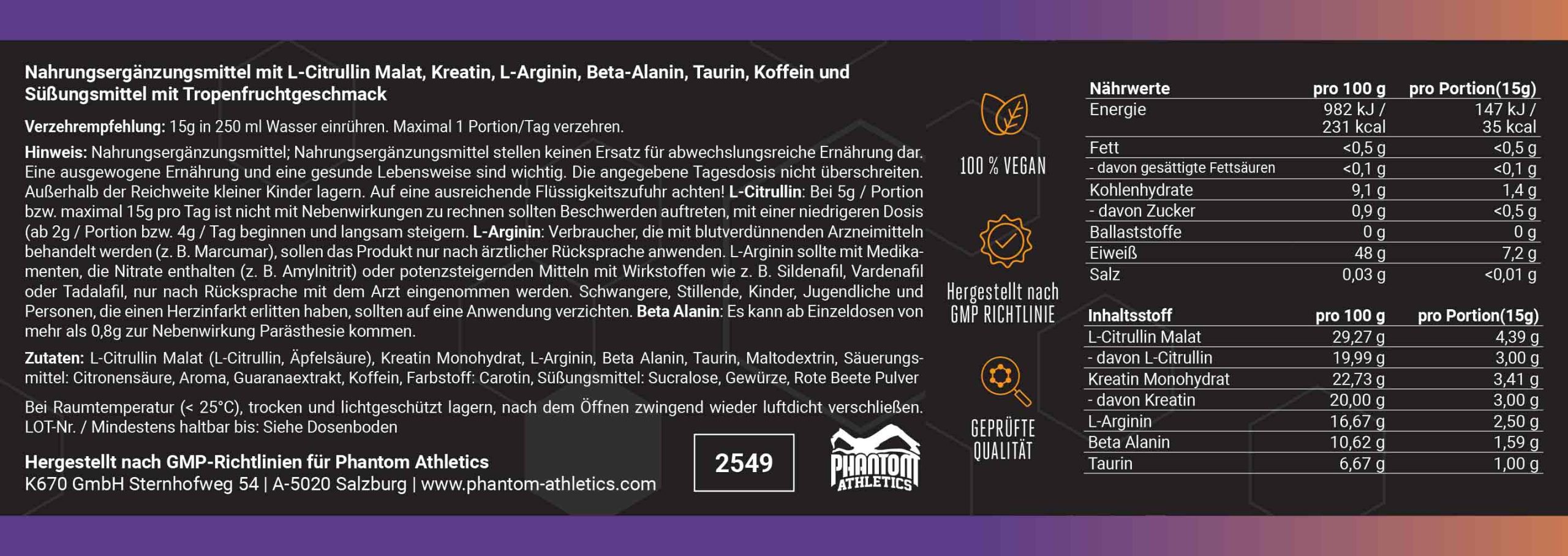 L-Citrullin Malat (L-Citrullin, Äpfelsäure), Kreatin Monohydrat, L-Arginin, Beta Alanin, Taurin, Maltodextrin, Säuerungsmittel: Citronensäure, Aroma, Guaranaextrakt, Koffein, Farbstoff: Carotin, Süßungsmittel: Sucralose, Gewürze, Rote Beete Pulver