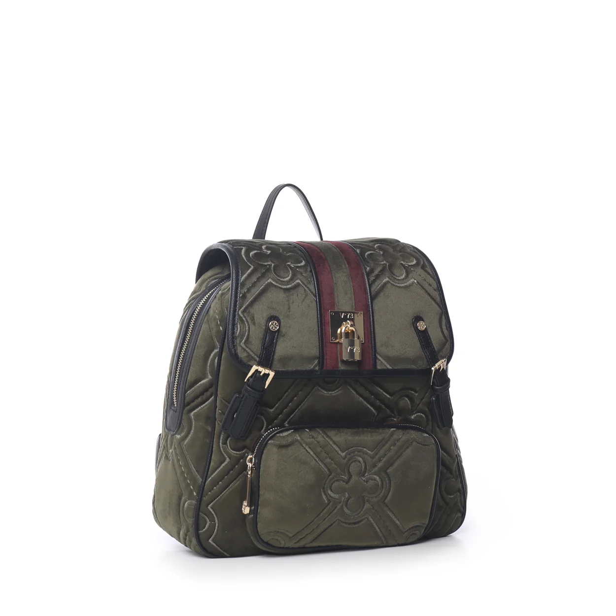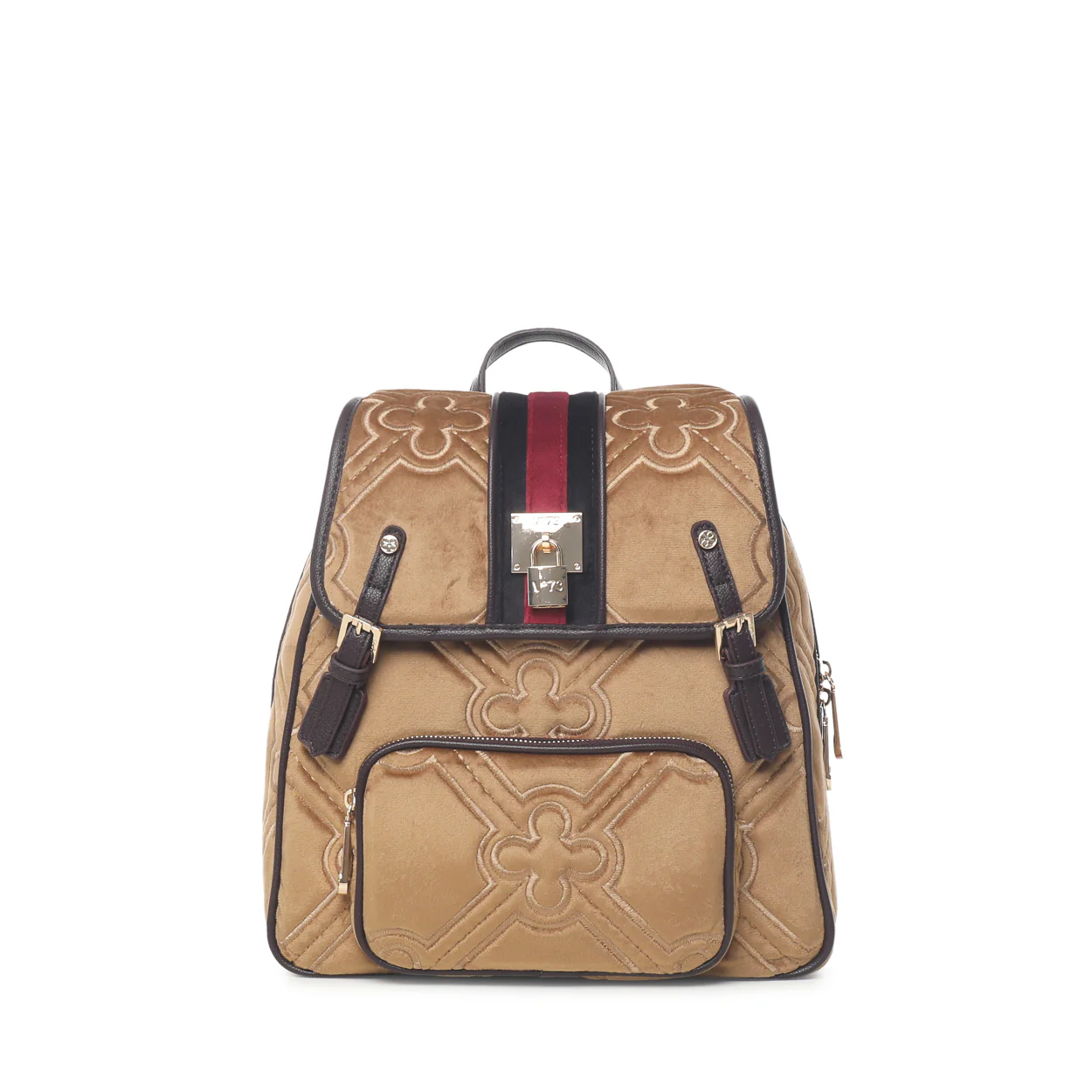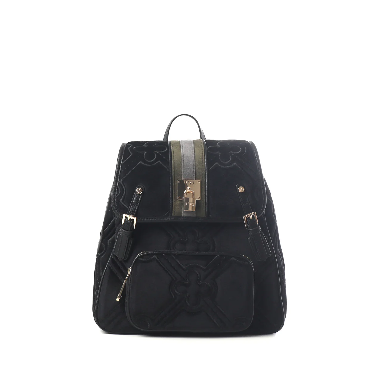 Zaino con maxi matelassé logato con nastro centrale in tono. Realizzata in velluto con riporti in grana sintetica e padlock personalizzato.