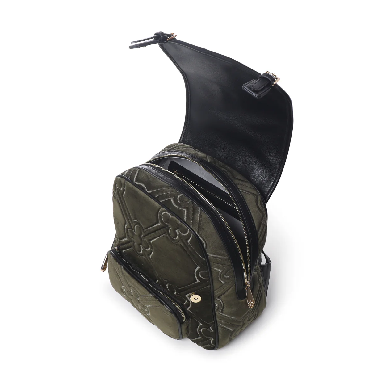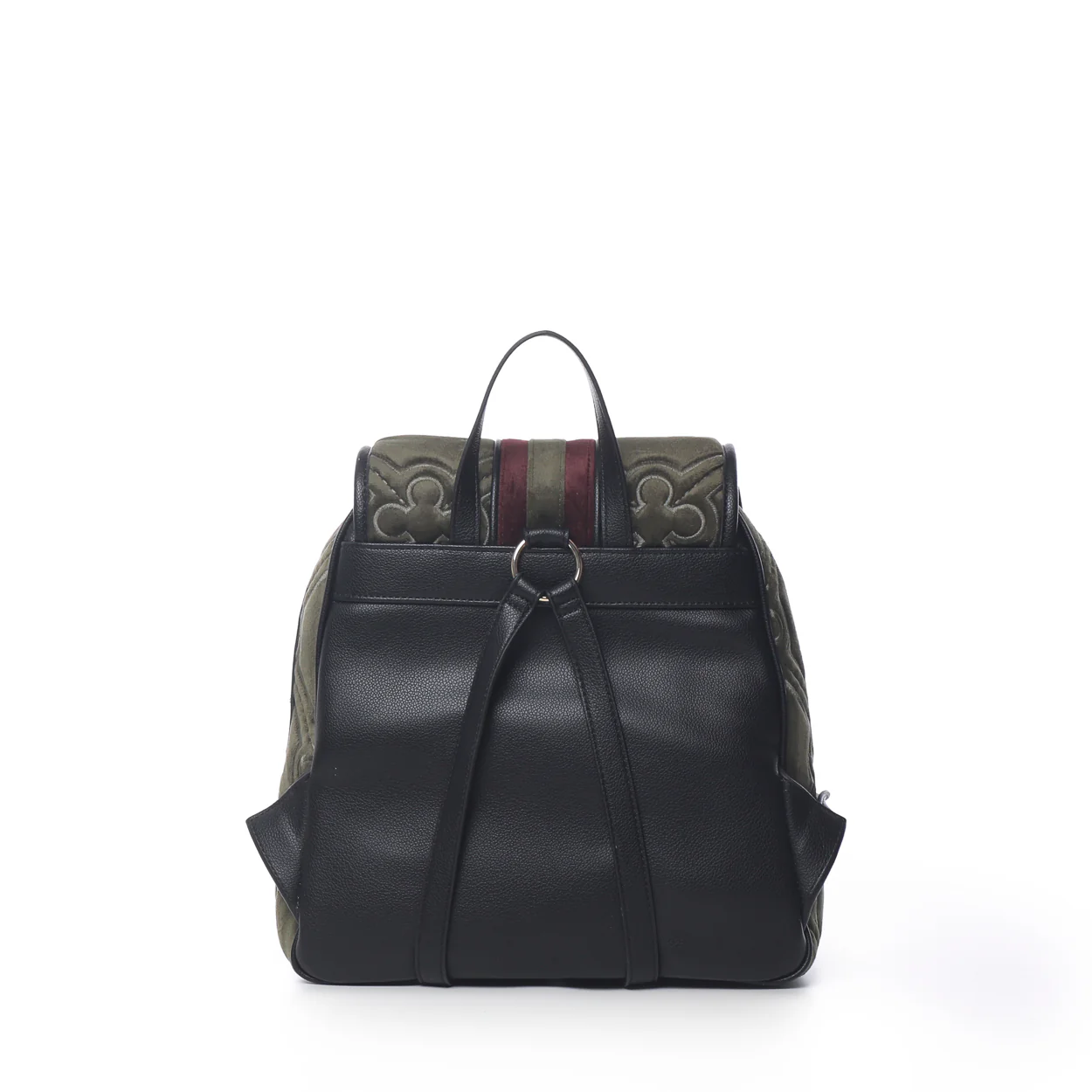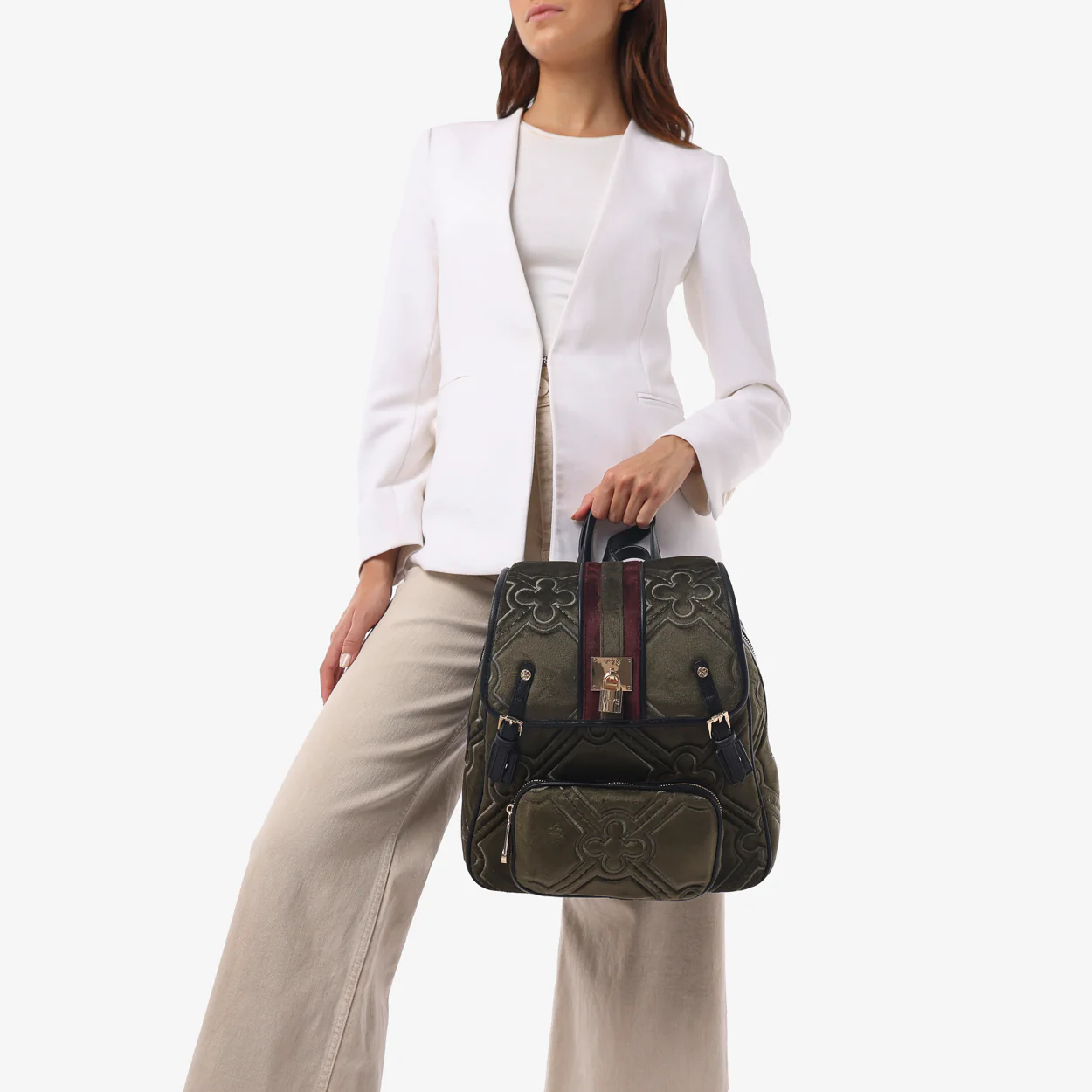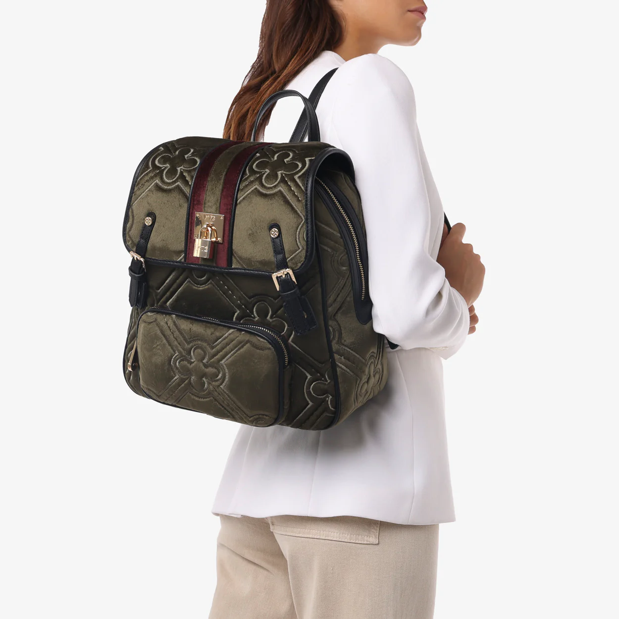 Zaino con maxi matelassé logato con nastro centrale in tono. Realizzata in velluto con riporti in grana sintetica e padlock personalizzato.