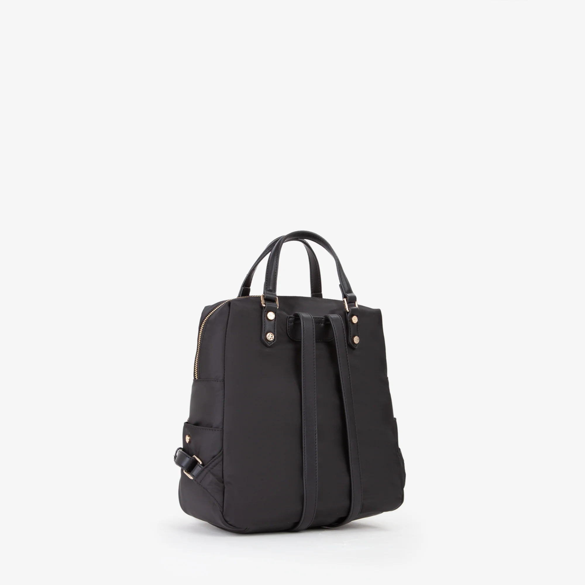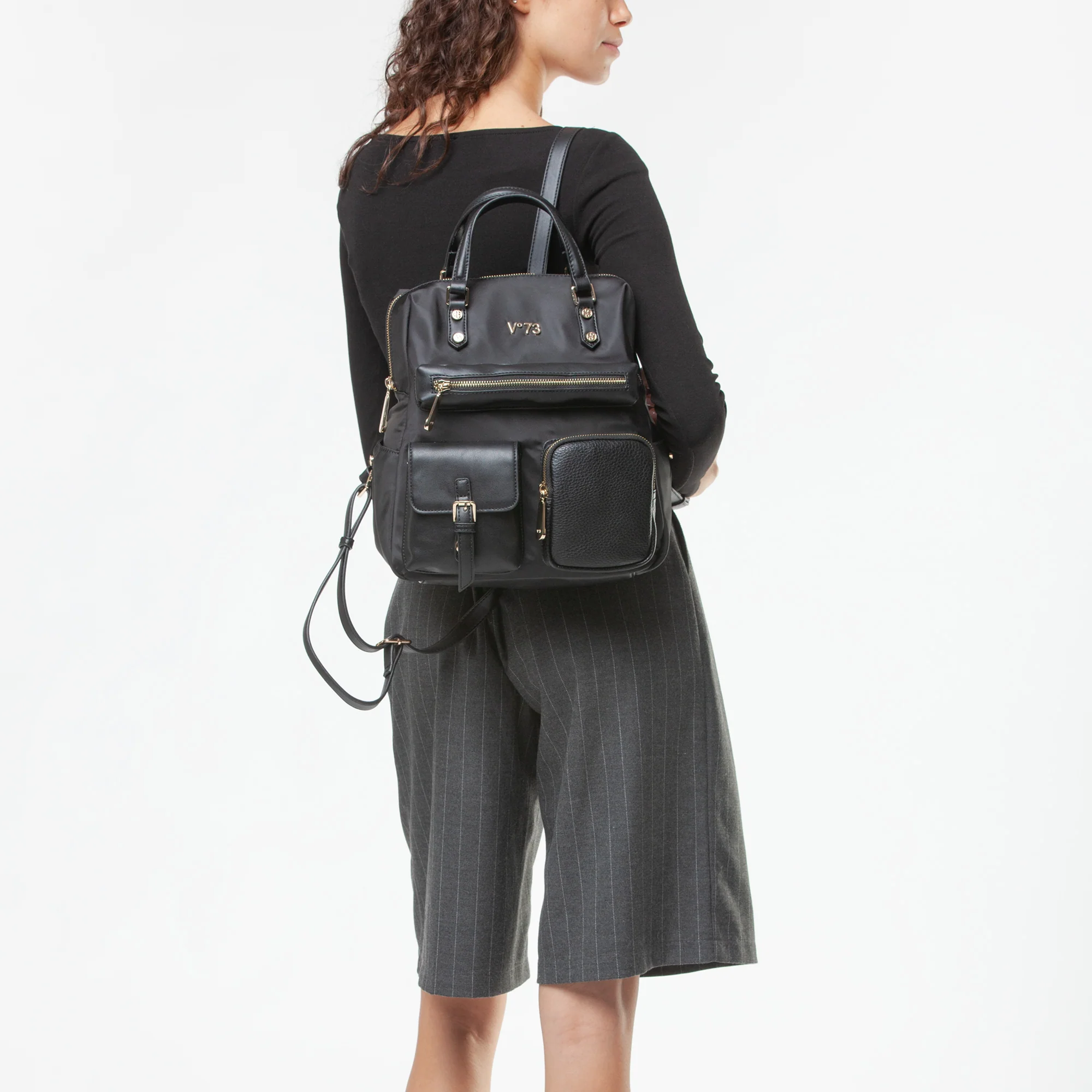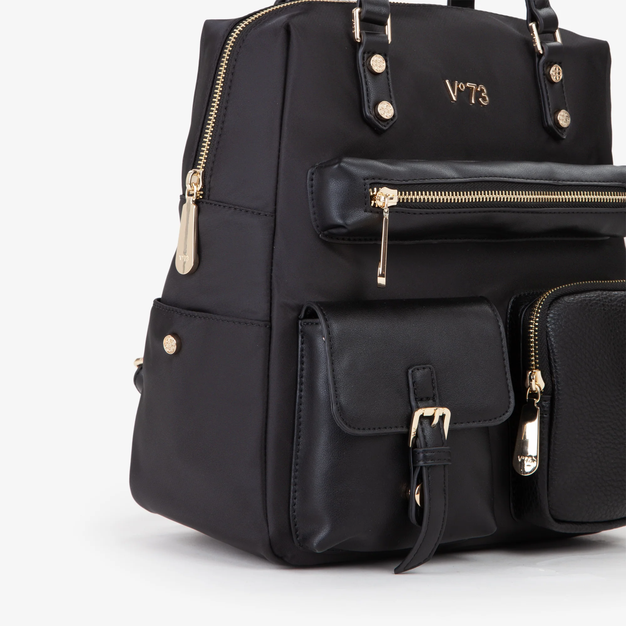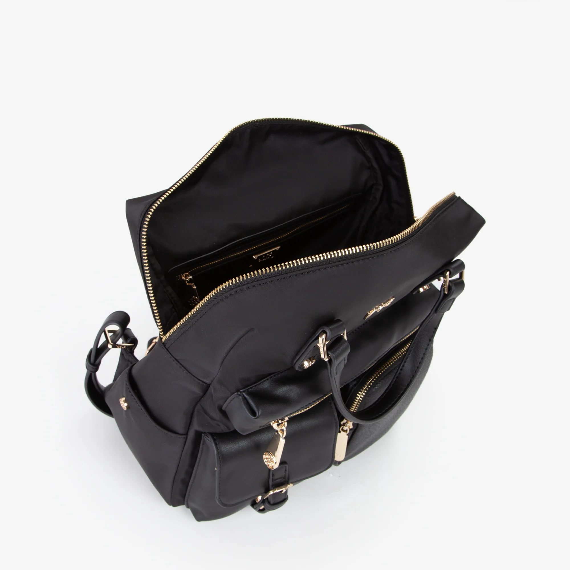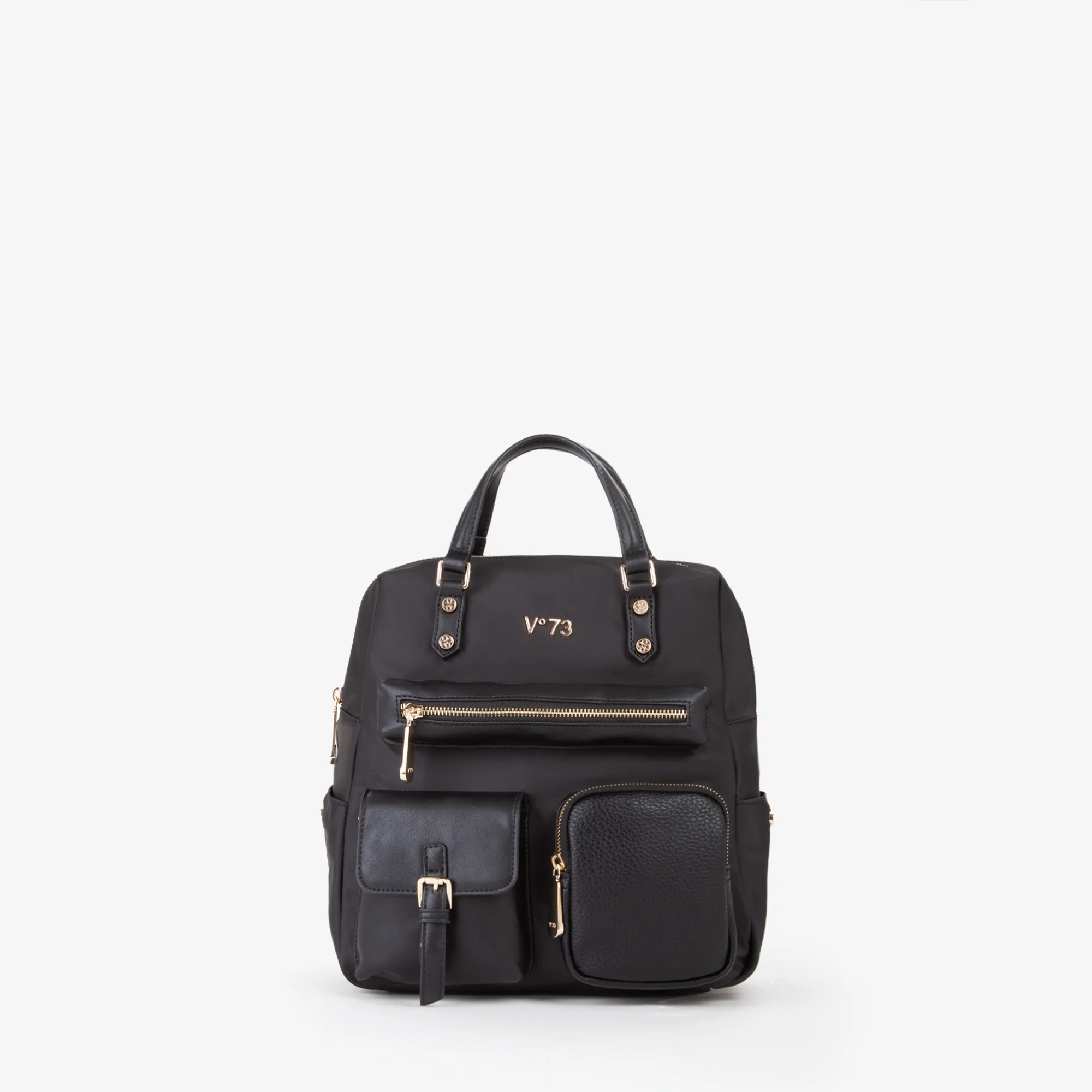 Zaino in nylon, con riporti e tasche realizzati in diversi materiali.