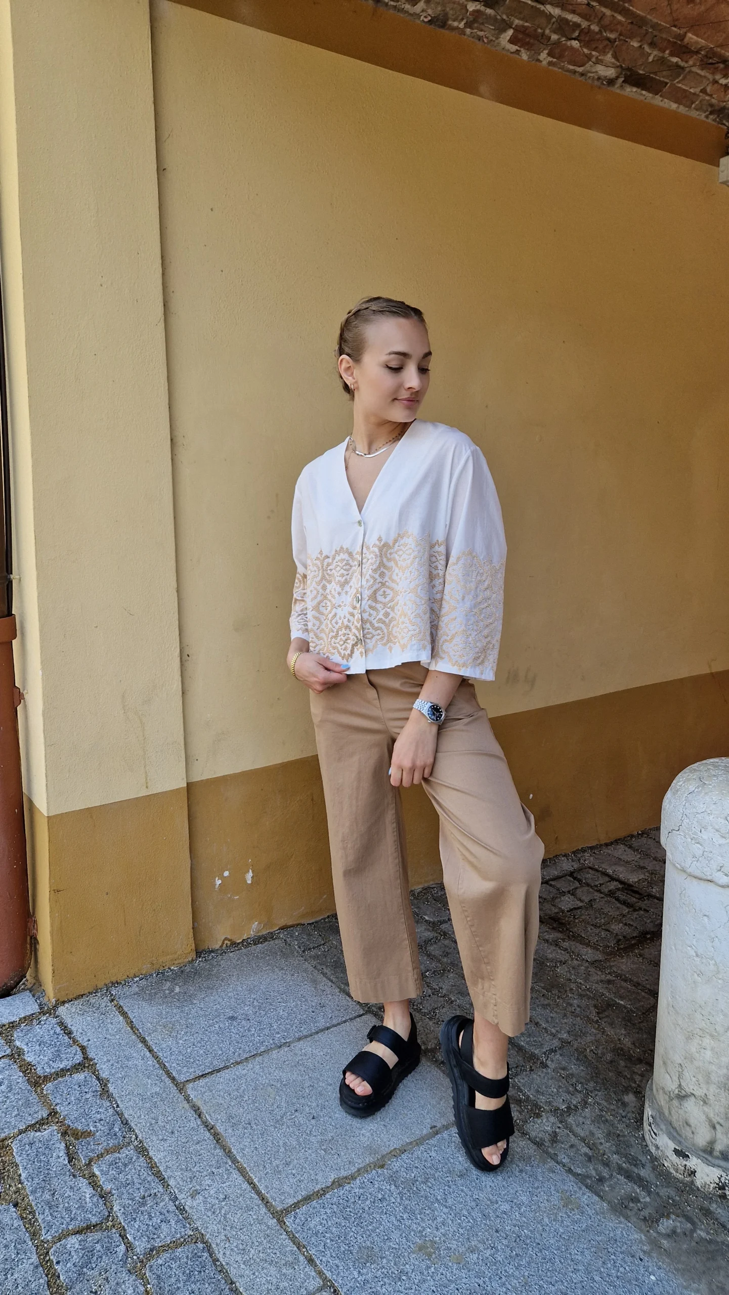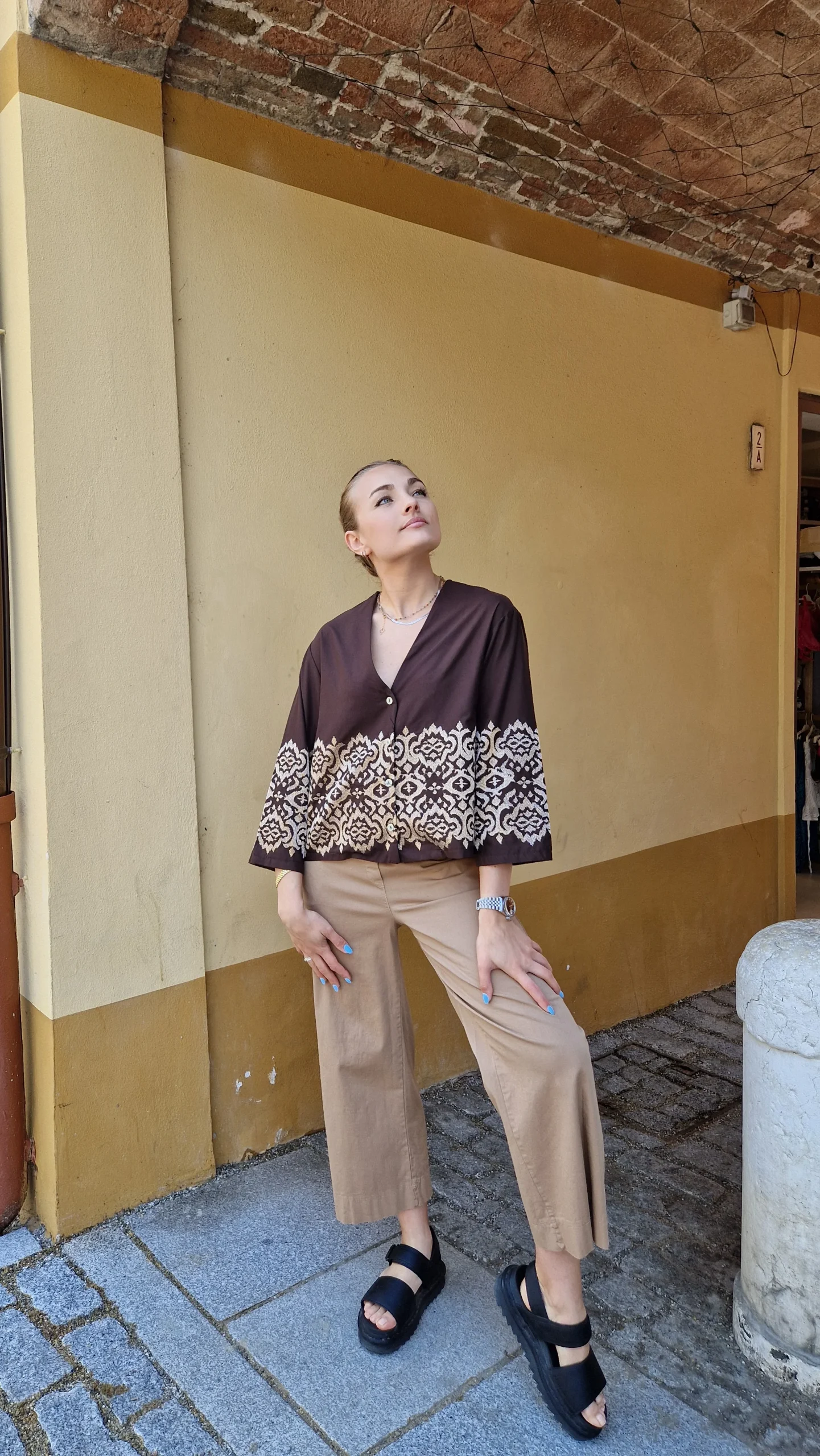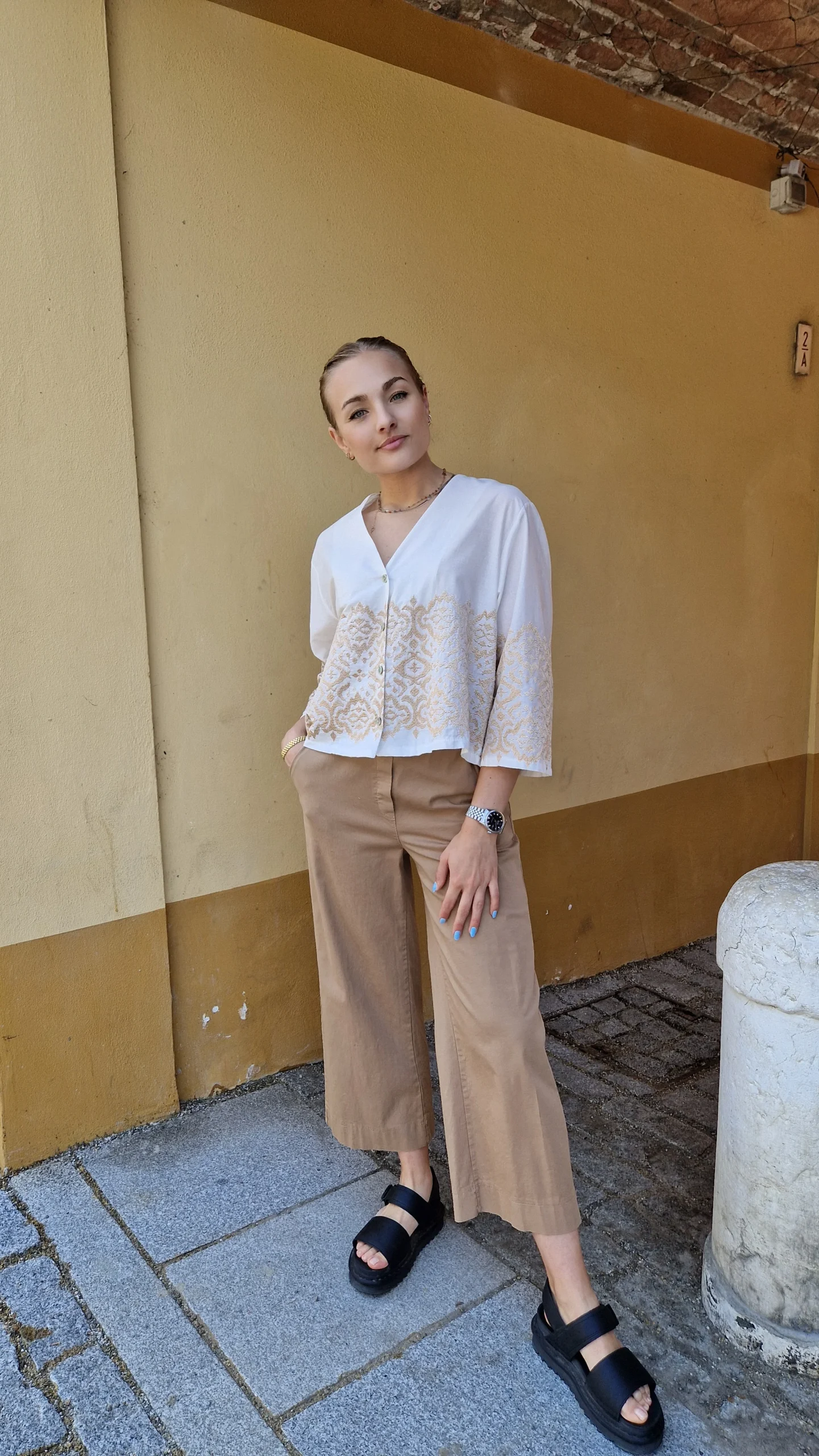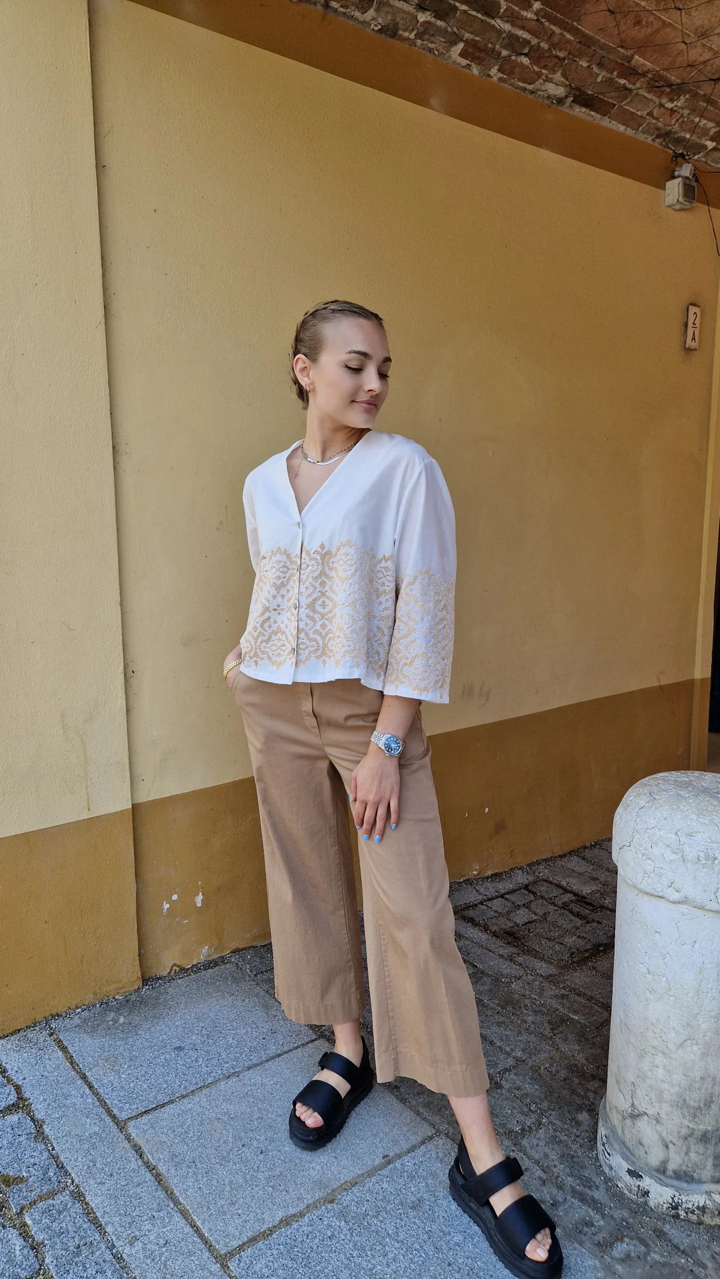 Una camicetta leggerissima in cotone Manica 3/4, quadrata cortina Con ricami d’orati