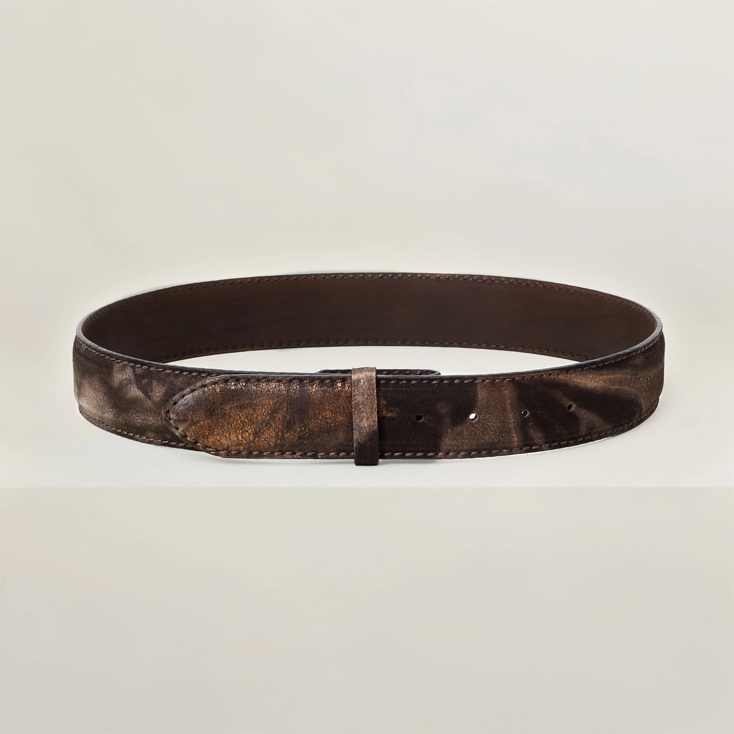 • Cintura artigianale in pelle, realizzata con una raffinata tecnica metal tie-dye che crea sfumature uniche su ogni pezzo.
