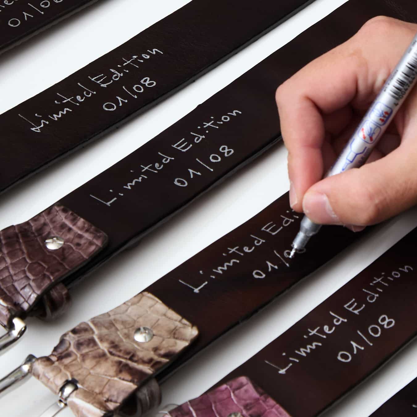 - Ogni cintura della collezione Limited Edition è un pezzo irripetibile: realizzata con pelle di coccodrillo americano e tinta a mano con spugne, che donano sfumature uniche e non replicabili.