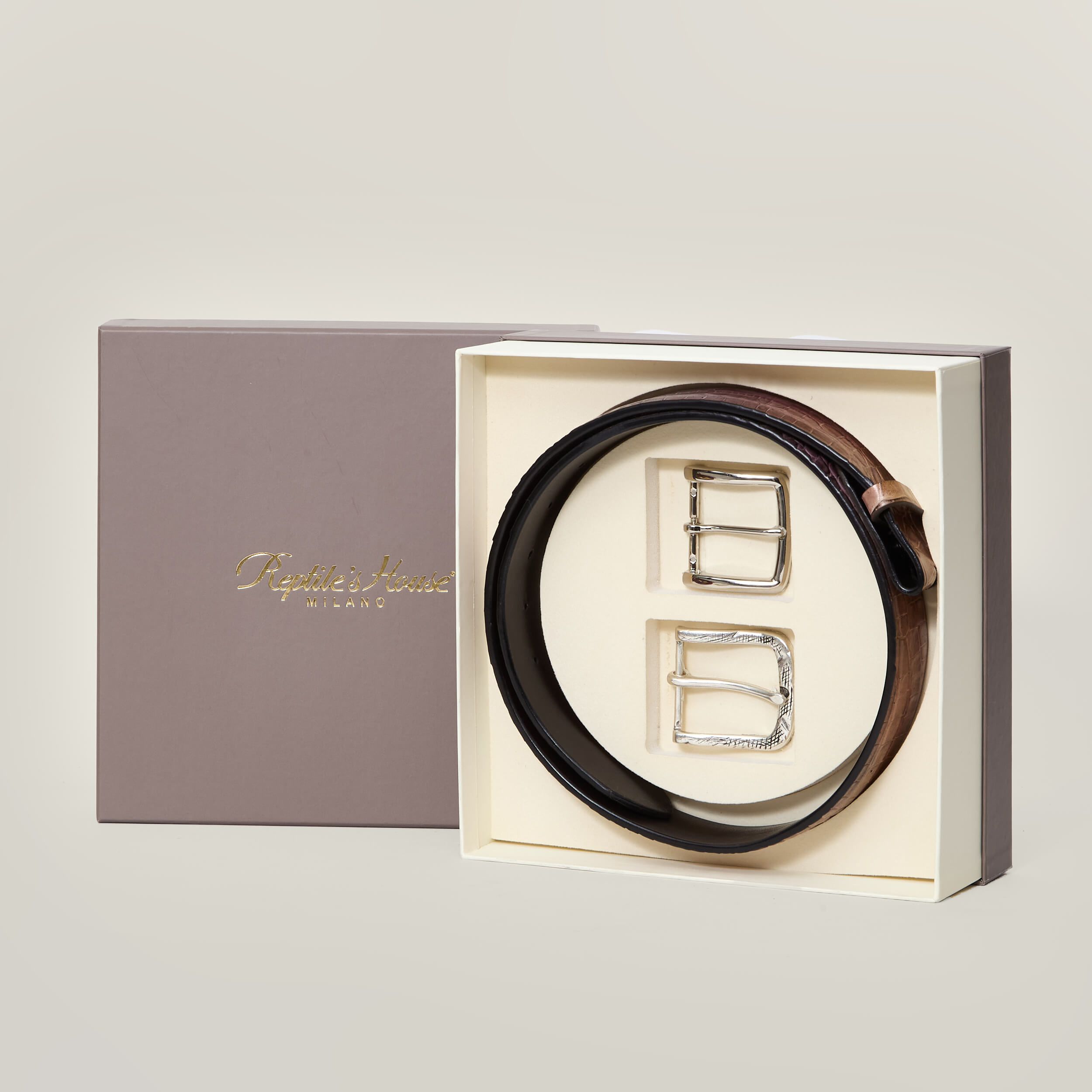 - La cintura è consegnata in una gift box esclusiva, completa di due fibbie intercambiabili in argento che consentono di trasformare l’accessorio in base all’occasione e al proprio stile.
