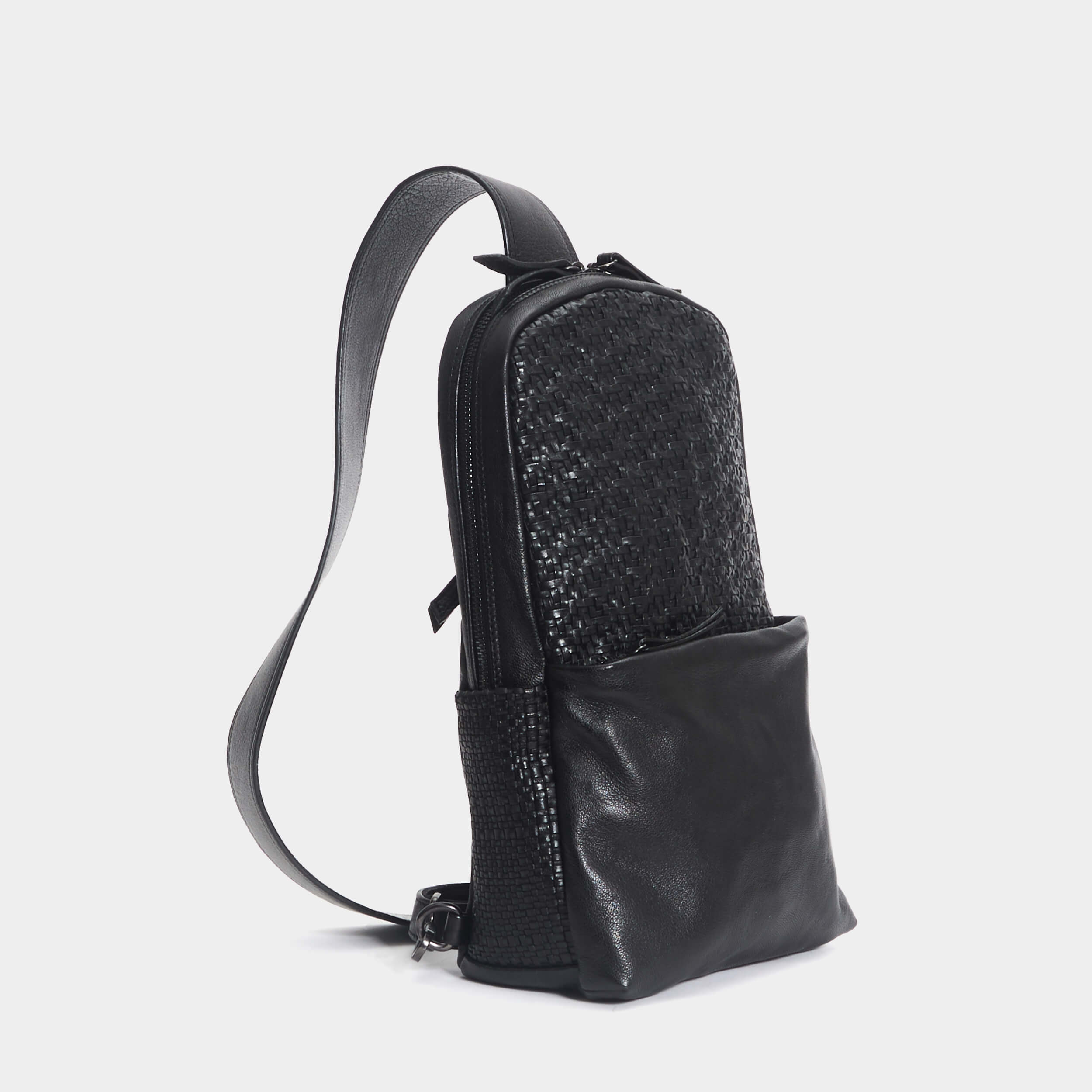 Altezza 34 cm Larghezza 40 cm Profondità 12 cm Composizione: Vitello. Borsa marsupio a tracolla. Fronte in pelle intrecciata. Chiusura con zip doppio scorrimento. Tasca frontale con zip. All’interno ampio scomparto con due taschine applicate su fodera. Made in Italy.