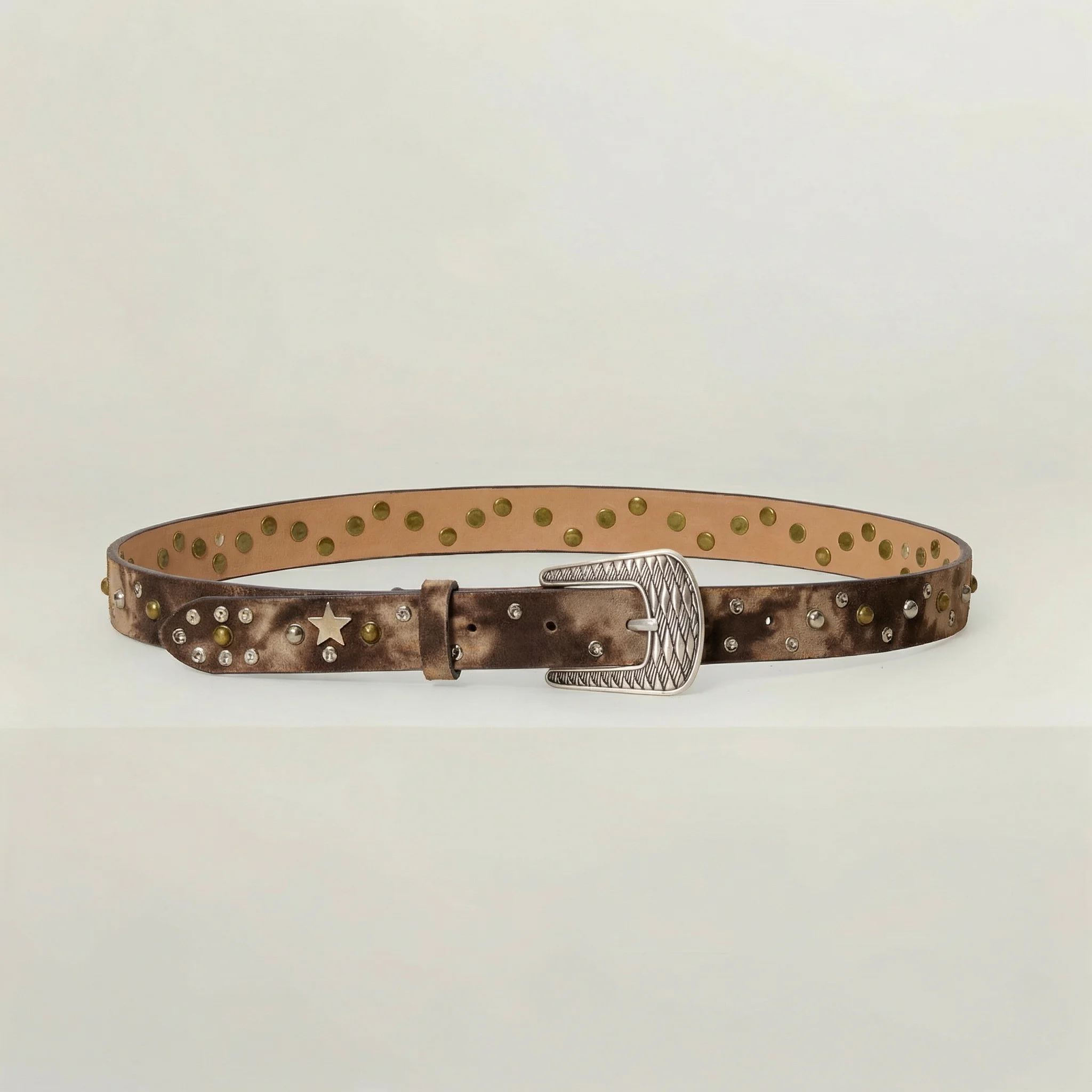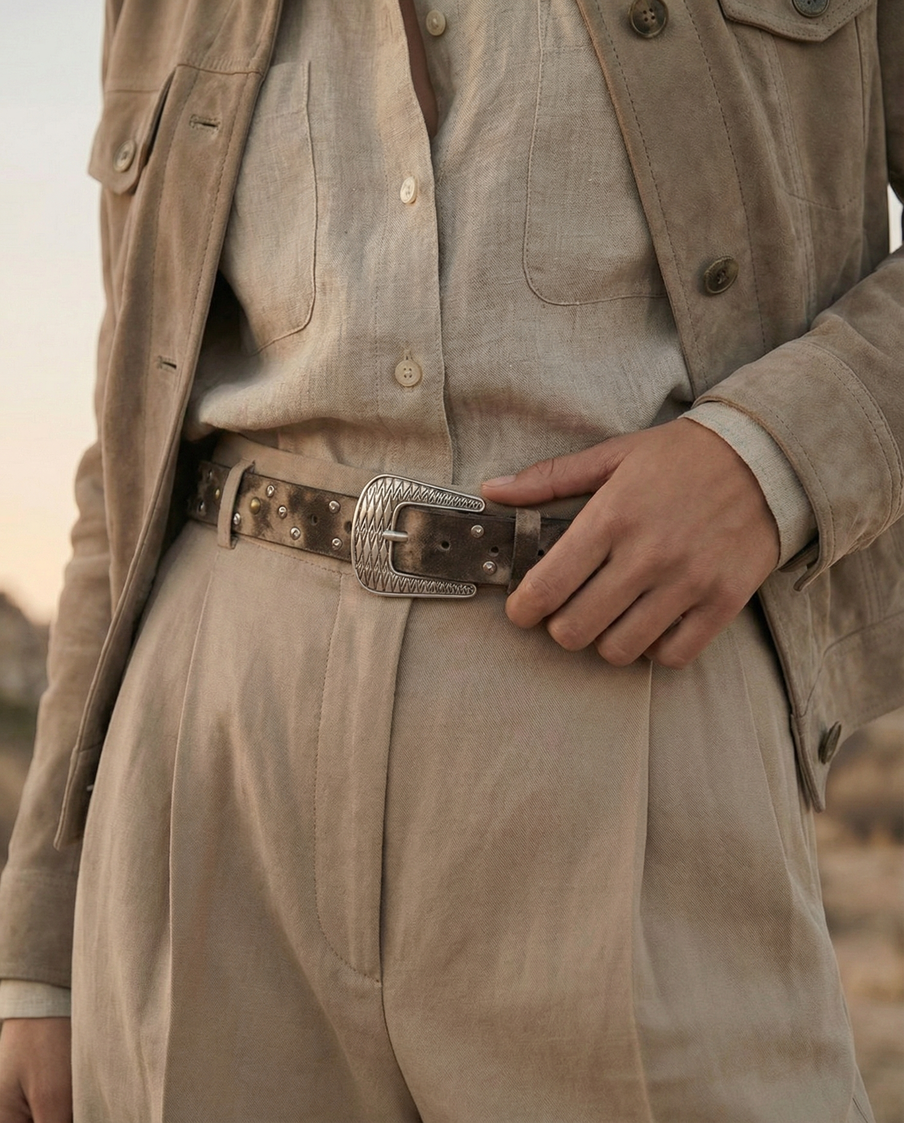 • Stile: Western contemporaneo dal carattere deciso. Le sfumature irregolari della pelle e le borchie metalliche creano un’estetica autentica e vissuta, bilanciata dall’eleganza della fibbia Nevada.