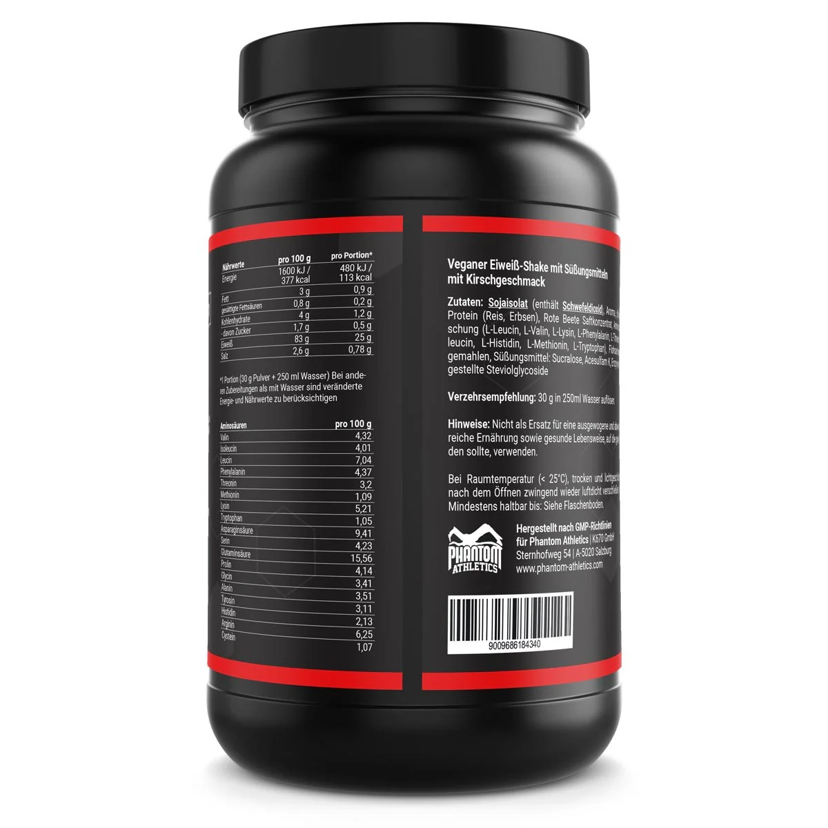 Zutaten: Sojaisolat (enthält Schwefeldioxid), Aroma, 5% Kakaopulver, pflanzliches Protein (Reis, Erbsen), Aminosäuremischung (L-Leucin, Valin, L-Lysin, L-Phenylalanin, L-Threonin, L-Isoleucin, L-Histidin, L-Methionin, L-Tryptophan), Flohsamenschalen