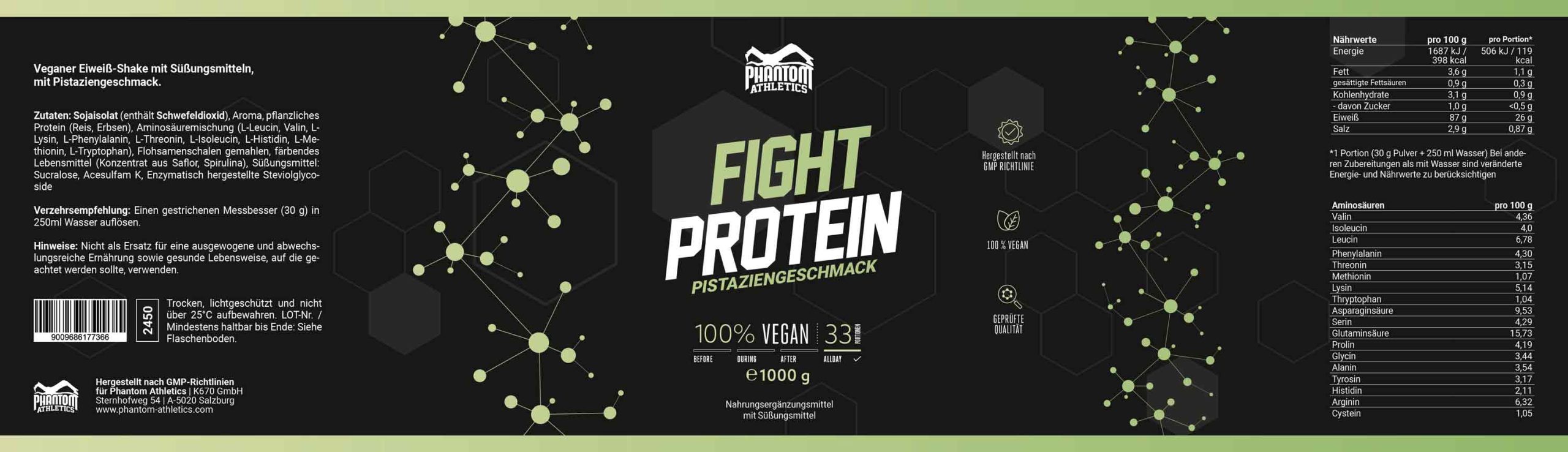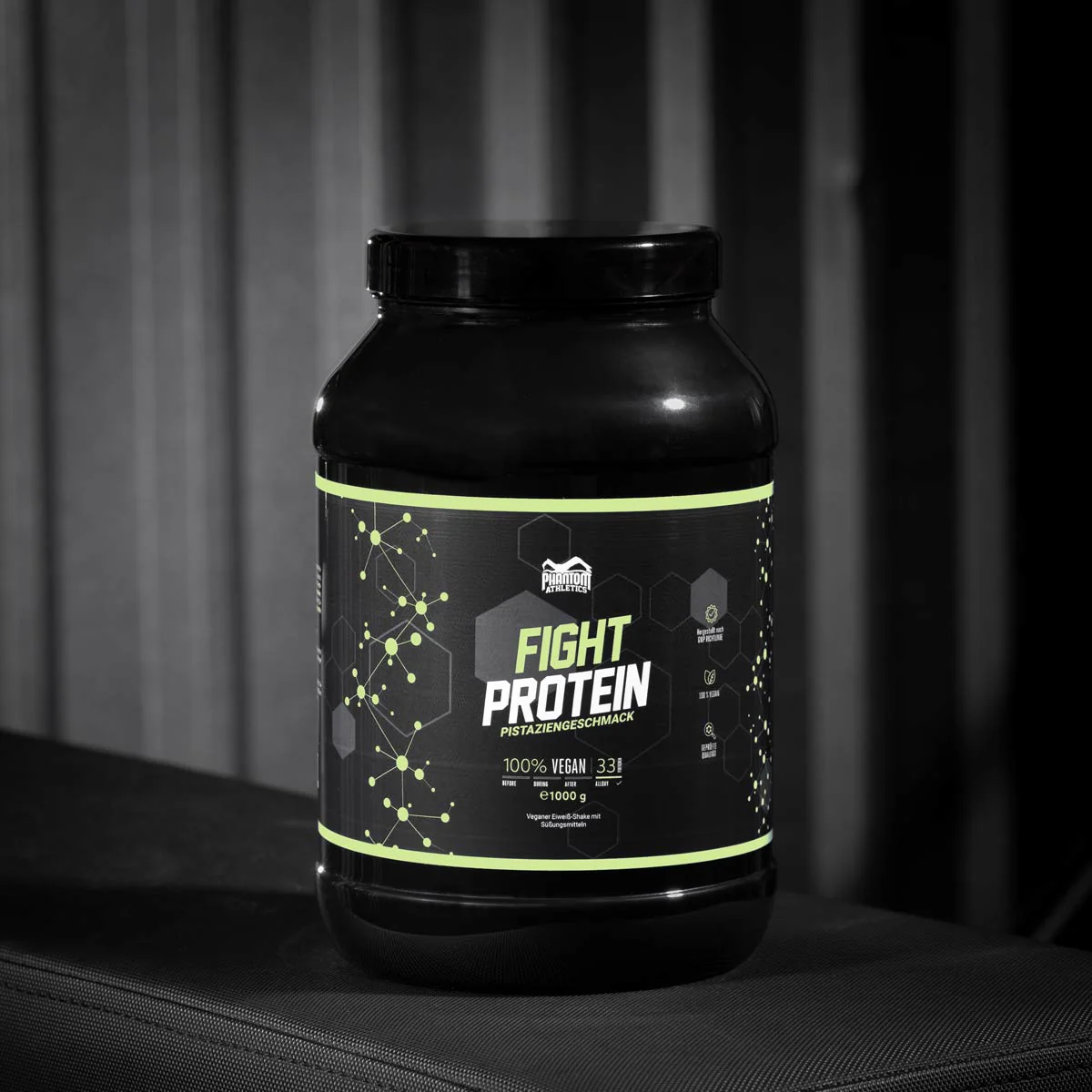 Eine gute Proteinversorgung ist essentiell bei intensivem sportlichen Training. Nur wenn der Muskulatur die notwendigen Bausteine zur Verfügung stehen, kann sie optimal regenerieren und ihre volle Leistung abrufen. Unser veganes FIGHT Protein Pulver wurde in Zusammenarbeit mit Kampfsportlern entwickelt und kommt in der Geschmacksrichtung “Pistazie”.