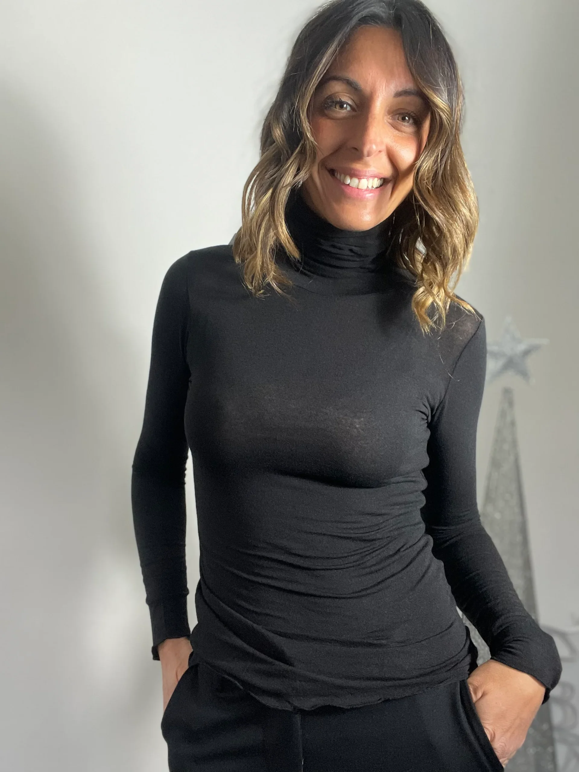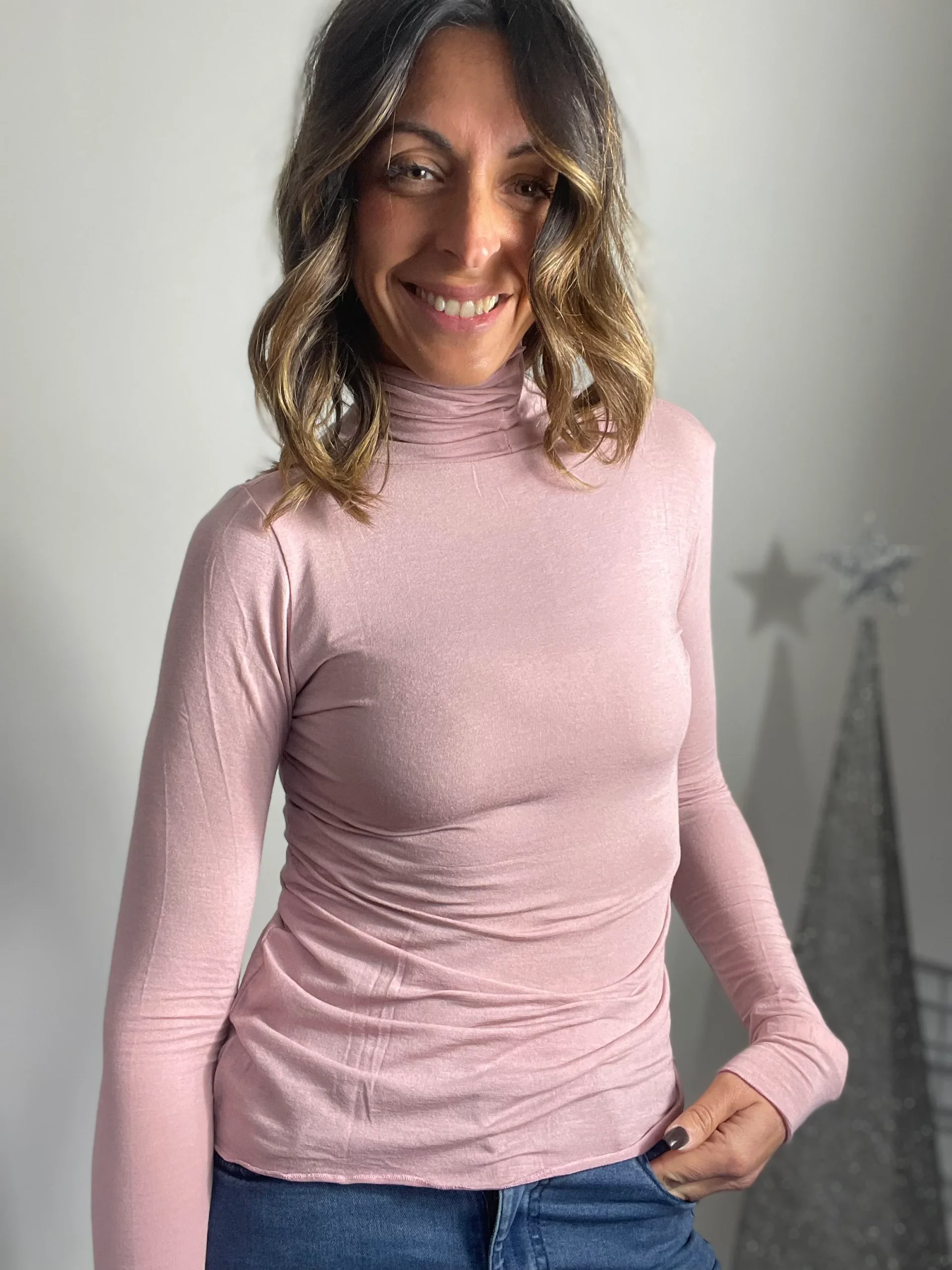 Maglia fine la cui composizione è modal cachemire ed elastan, collo alto . Disponibile anche collo tondo. Essendo taglia unica veste fino alla 46. Disponibile in 15 colori.