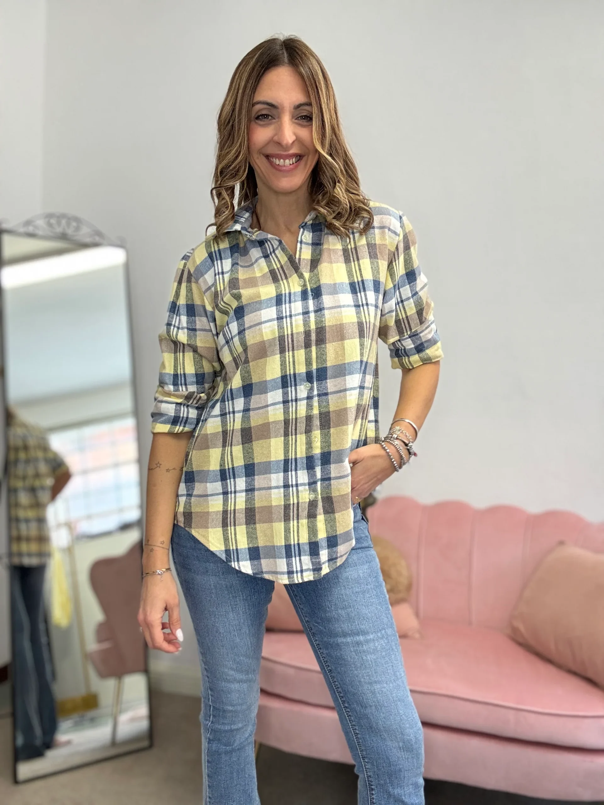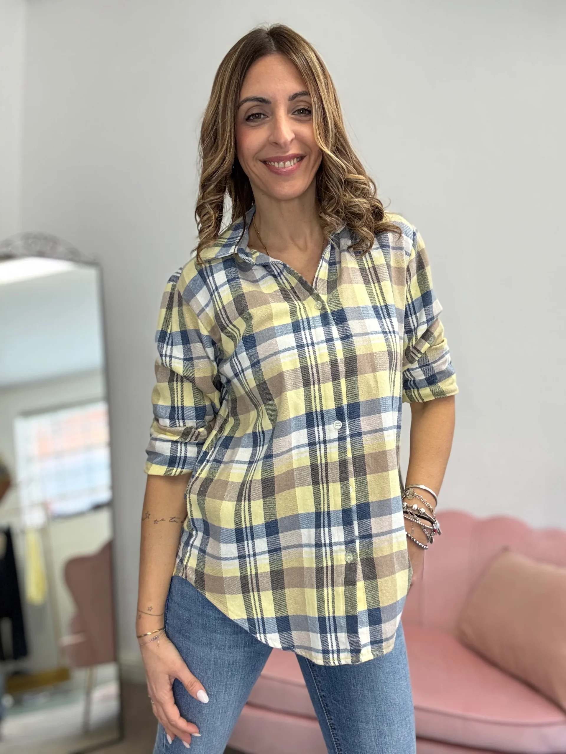 Camicia flanella leggera, ideale allo stacco con l’ingresso della primavera, perfetta nelle giornate di fresco ma già col sole, da indossare con un paio di jeans. È una camicia colorata e facile, veste fino a taglia 44,46.