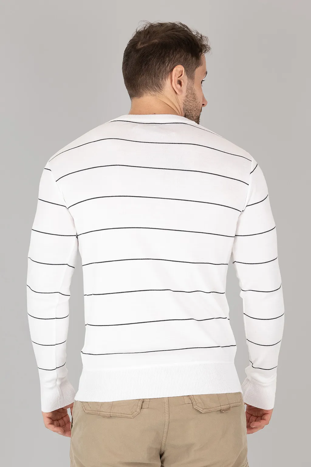 Maglia uomo in filato soffice, leggero e confortevole, disegno a righe. con scollo arrotondato.
