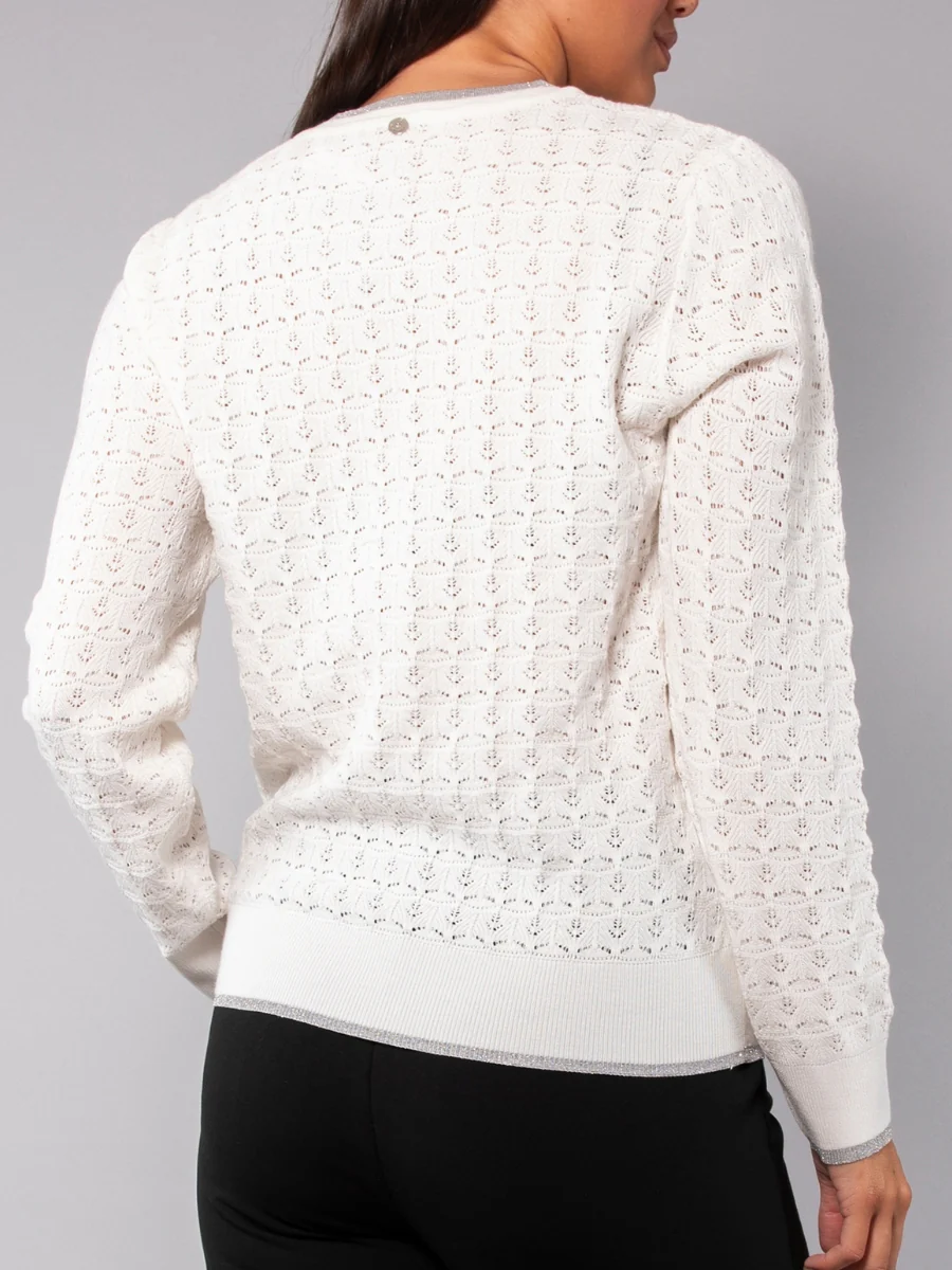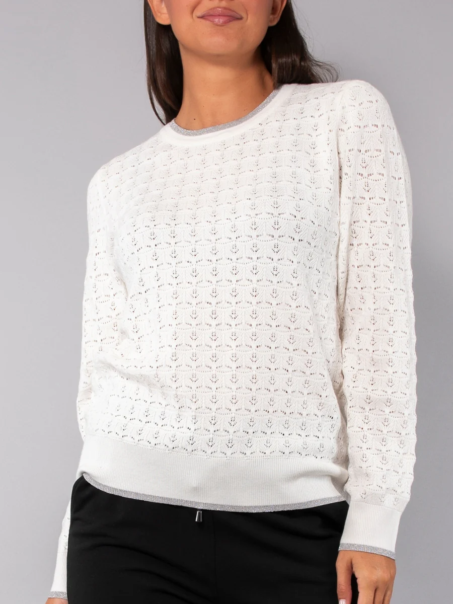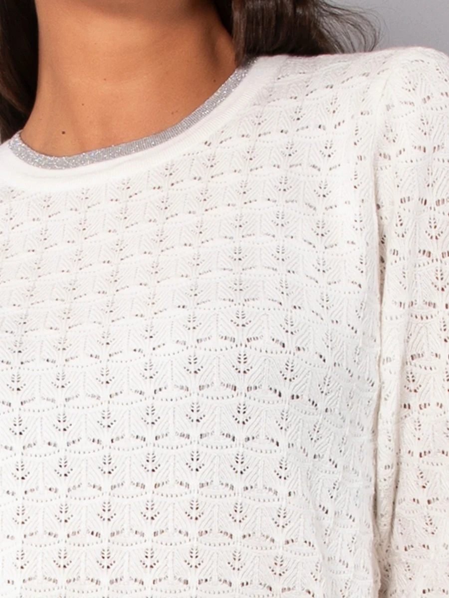 La maglia a maniche lunghe in morbida viscosa operata si distingue per il collo removibile, che permette di modulare il look a seconda delle esigenze. Le bordature lurex aggiungono un tocco prezioso e sofisticato, rendendo il capo ideale per outfit chic e femminili.