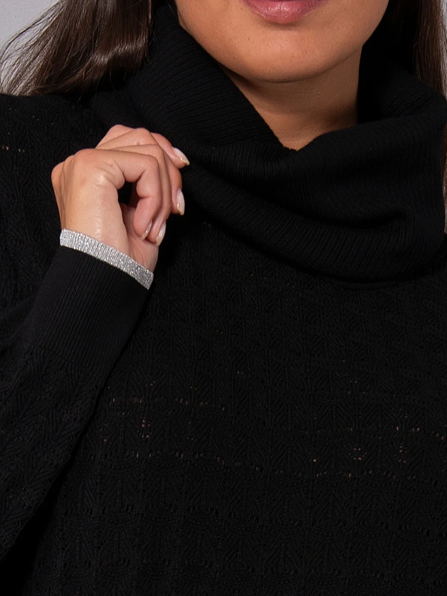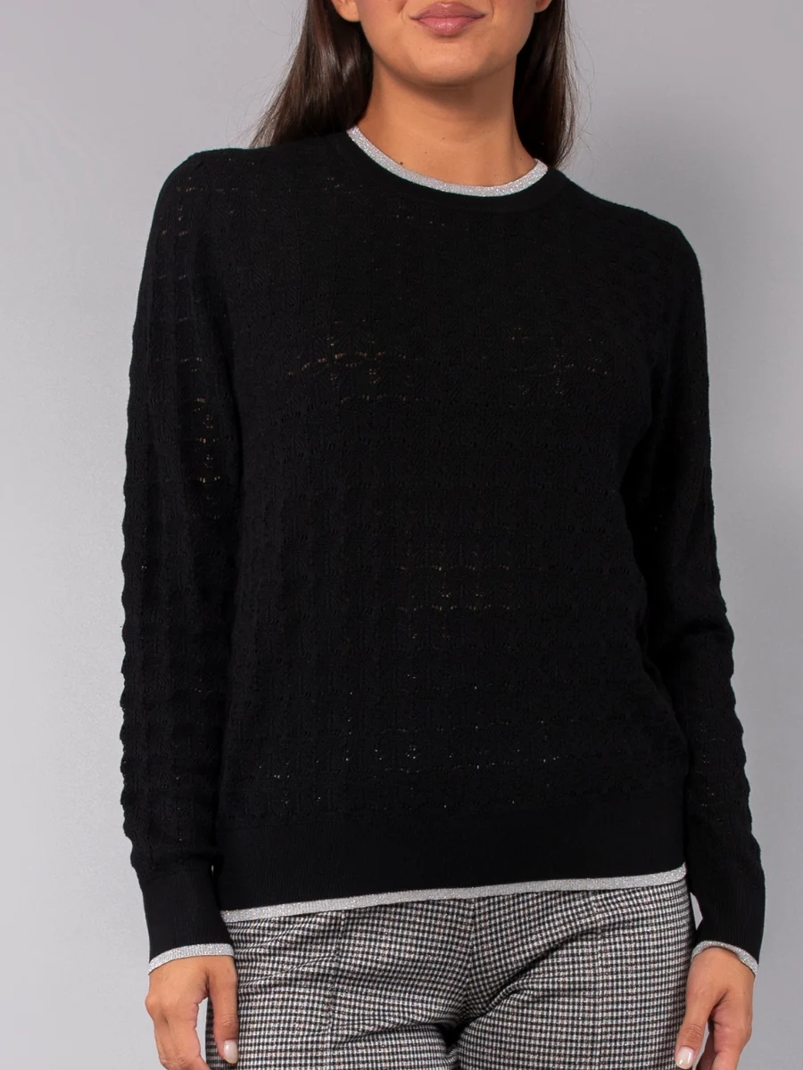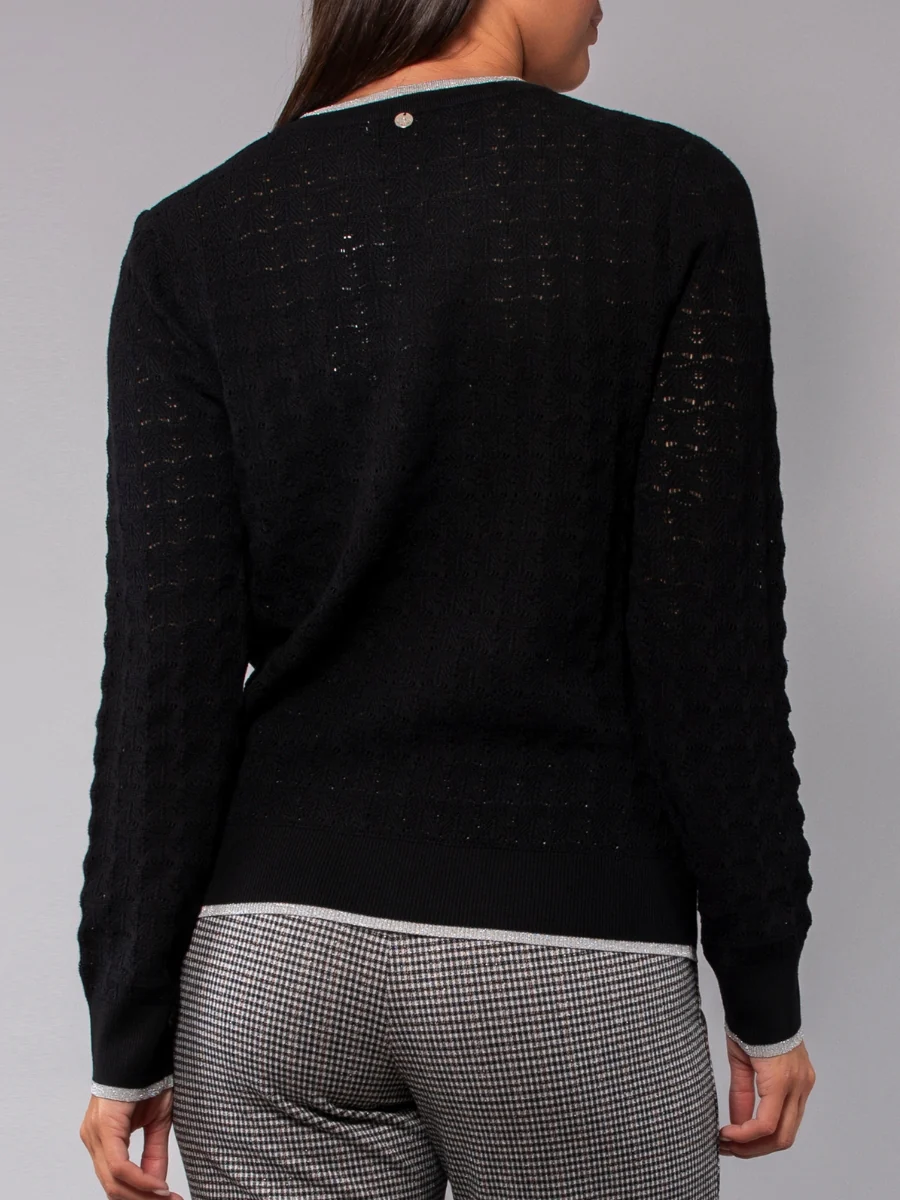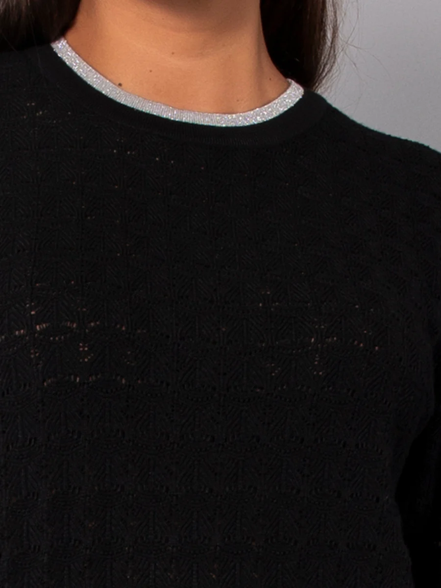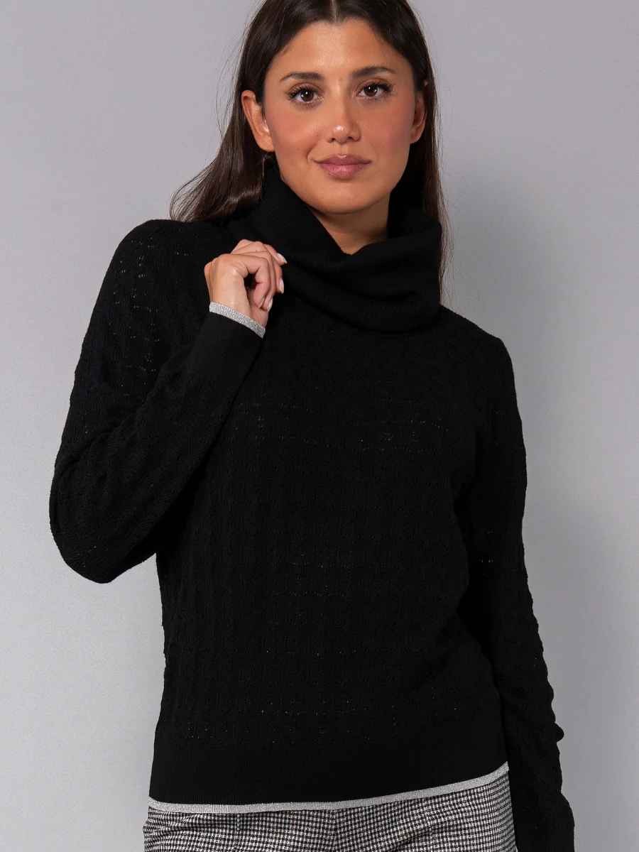 La maglia a maniche lunghe in morbida viscosa operata si distingue per il collo removibile, che permette di modulare il look a seconda delle esigenze. Le bordature lurex aggiungono un tocco prezioso e sofisticato, rendendo il capo ideale per outfit chic e femminili.