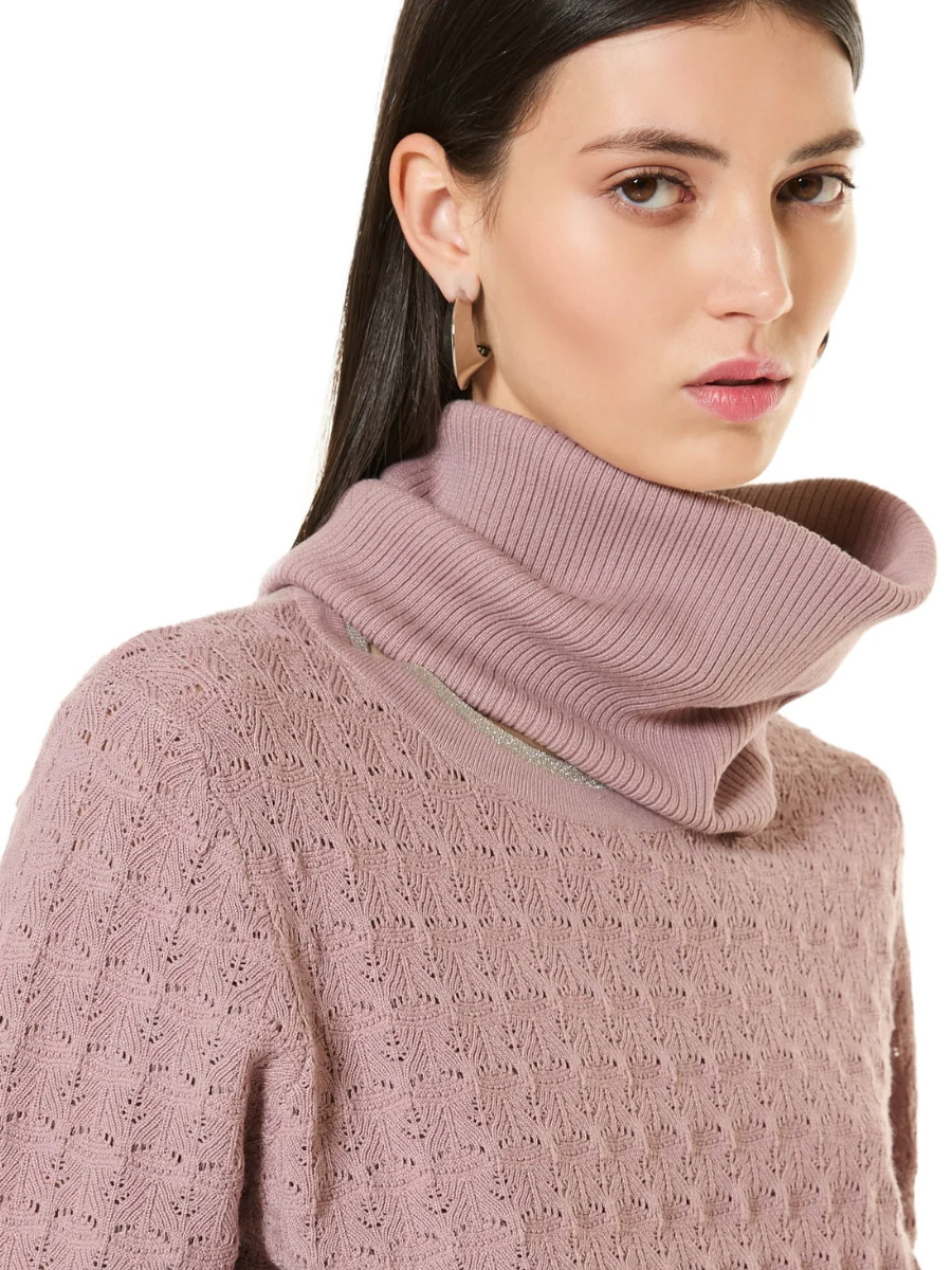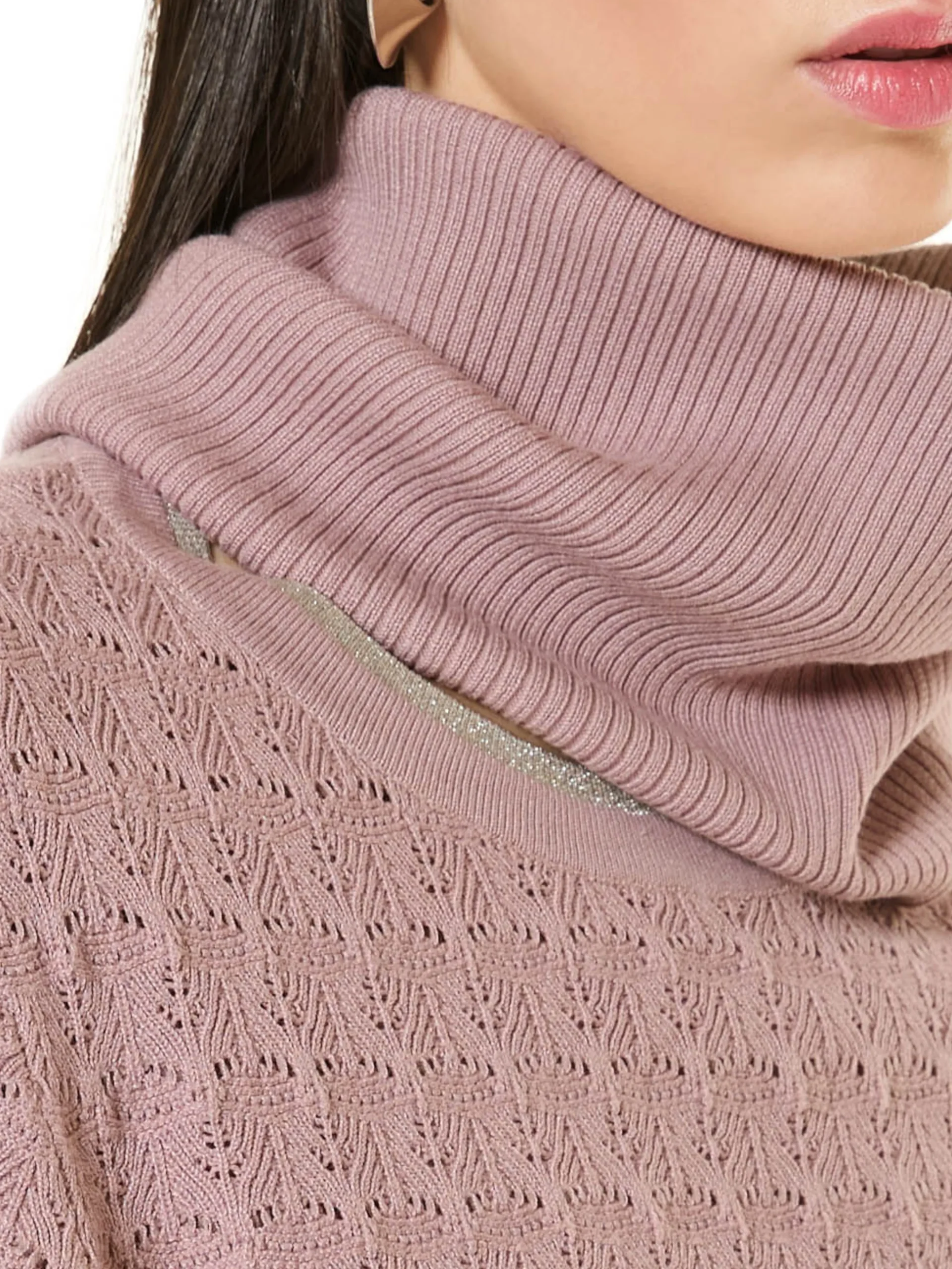 La maglia a maniche lunghe in morbida viscosa operata si distingue per il collo removibile, che permette di modulare il look a seconda delle esigenze. Le bordature lurex aggiungono un tocco prezioso e sofisticato, rendendo il capo ideale per outfit chic e femminili.