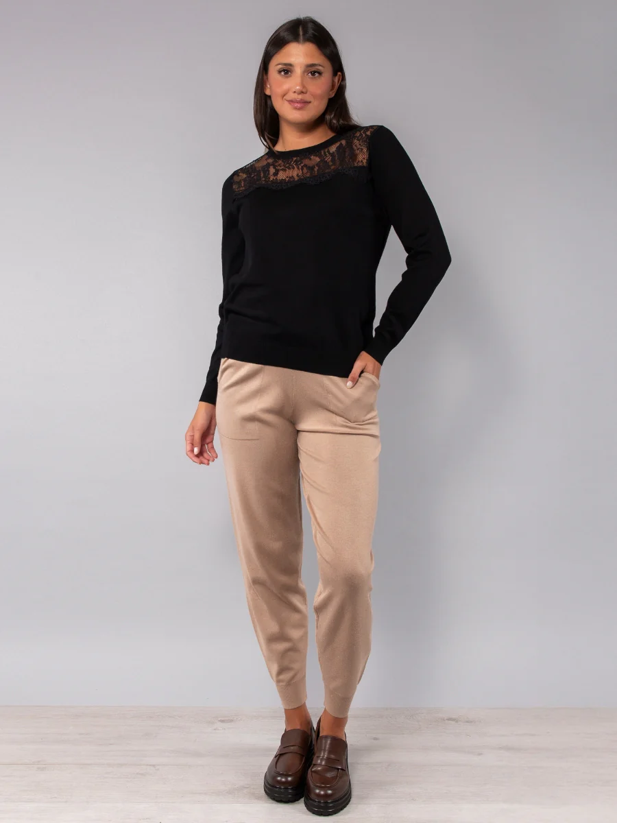 La maglia girocollo si distingue per i dettagli in pizzo tono su tono, che impreziosiscono il design con eleganza discreta. Realizzata in morbida viscosa, è il capo ideale per look femminili e sofisticati.