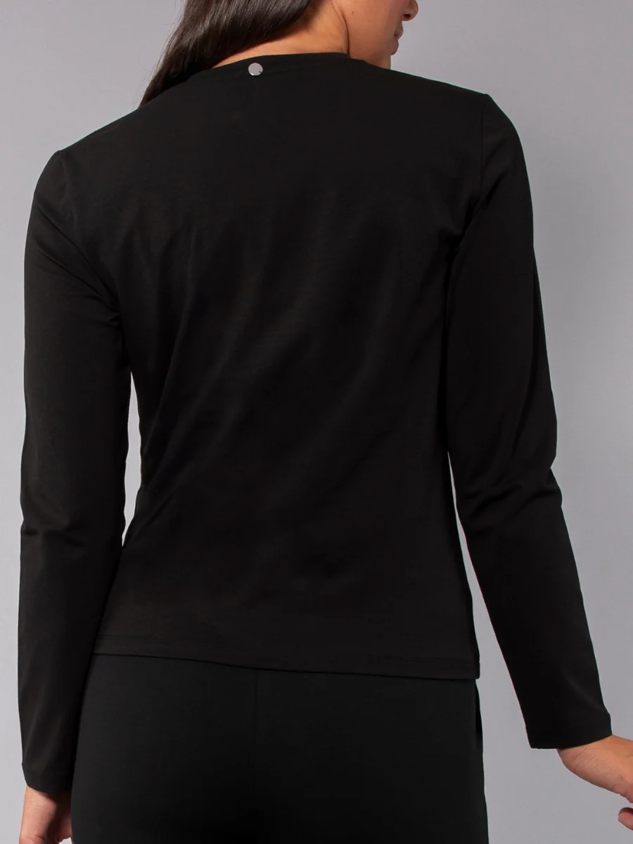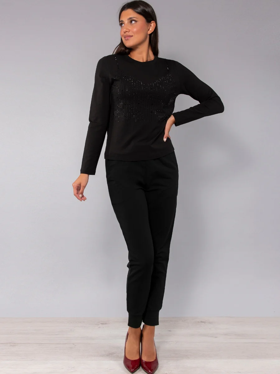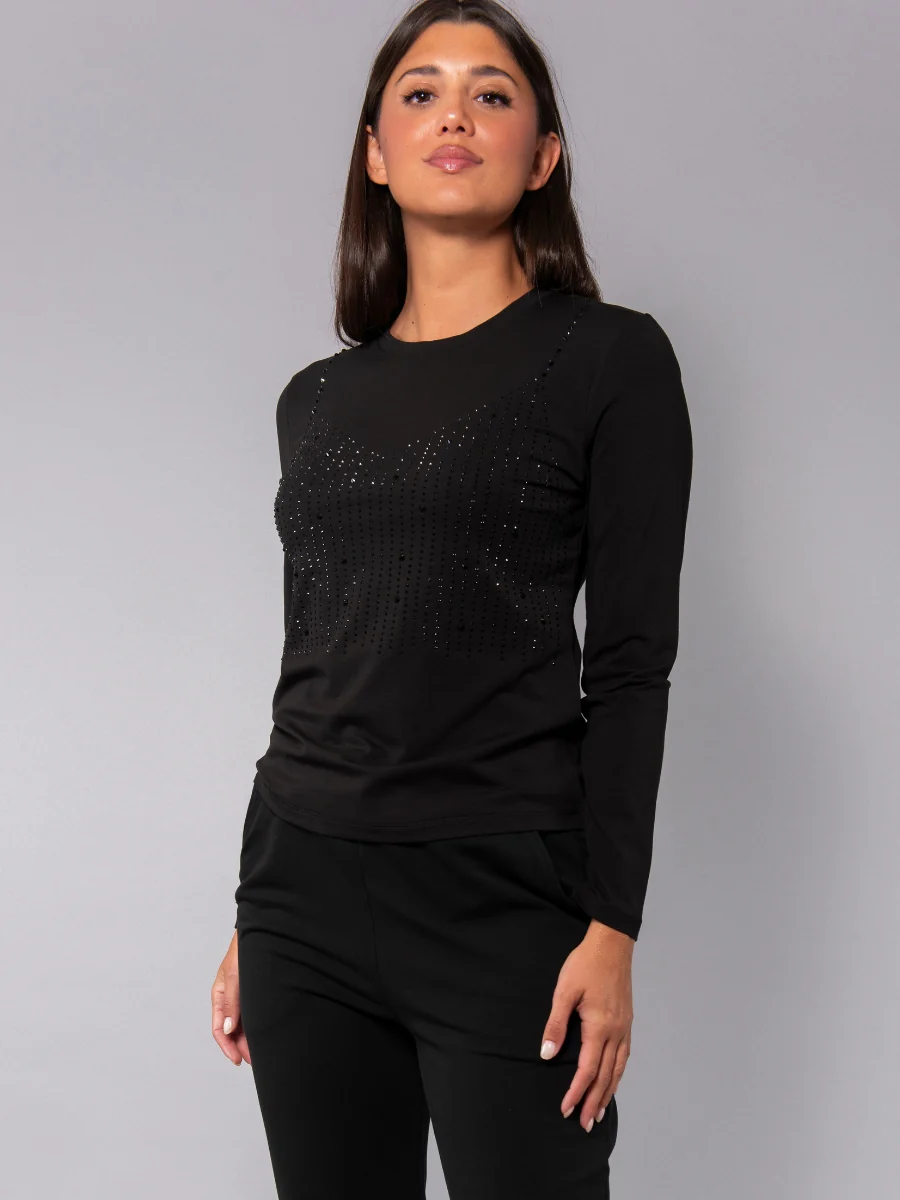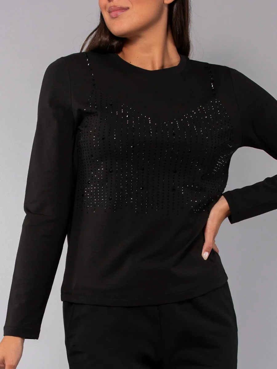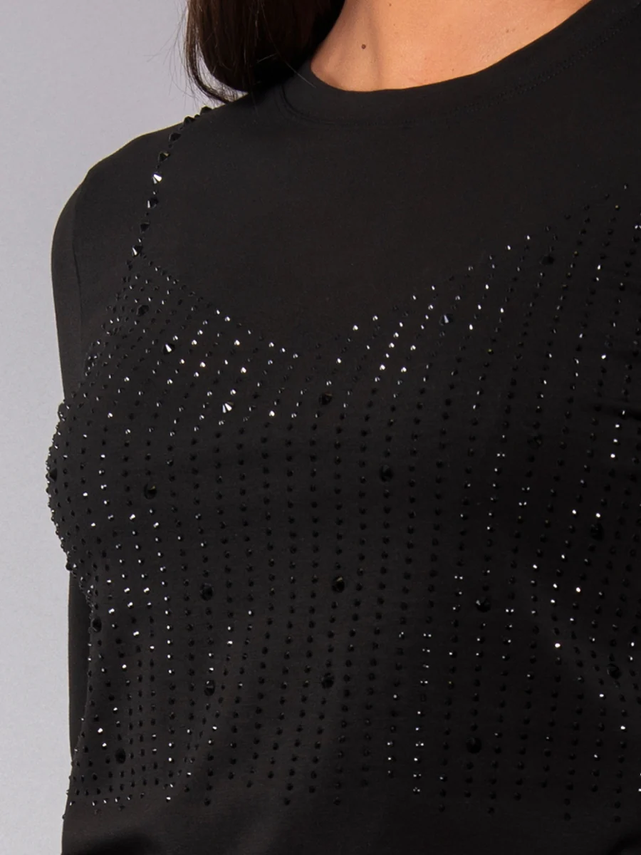 La maglia a manica lunga è caratterizzata dall’applicazione di strass che disegnano un top sul davanti, creando un gioco originale e sofisticato.Il tessuto in morbido cotone elasticizzato assicura comfort e una vestibilità piacevole.