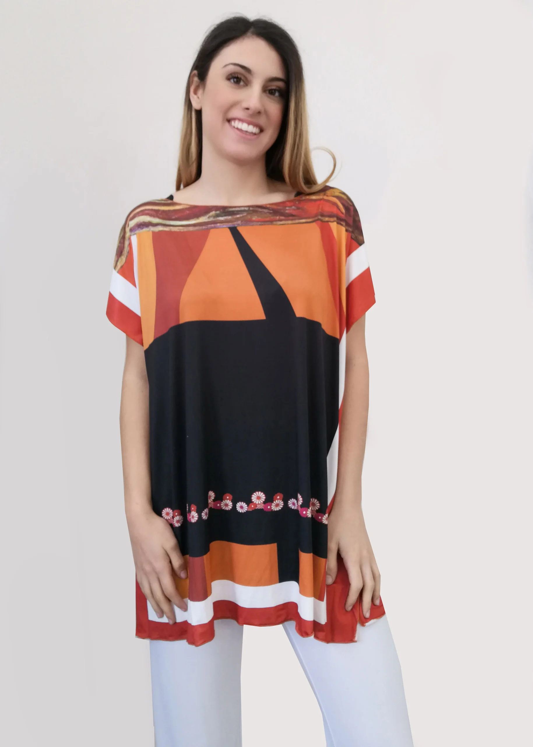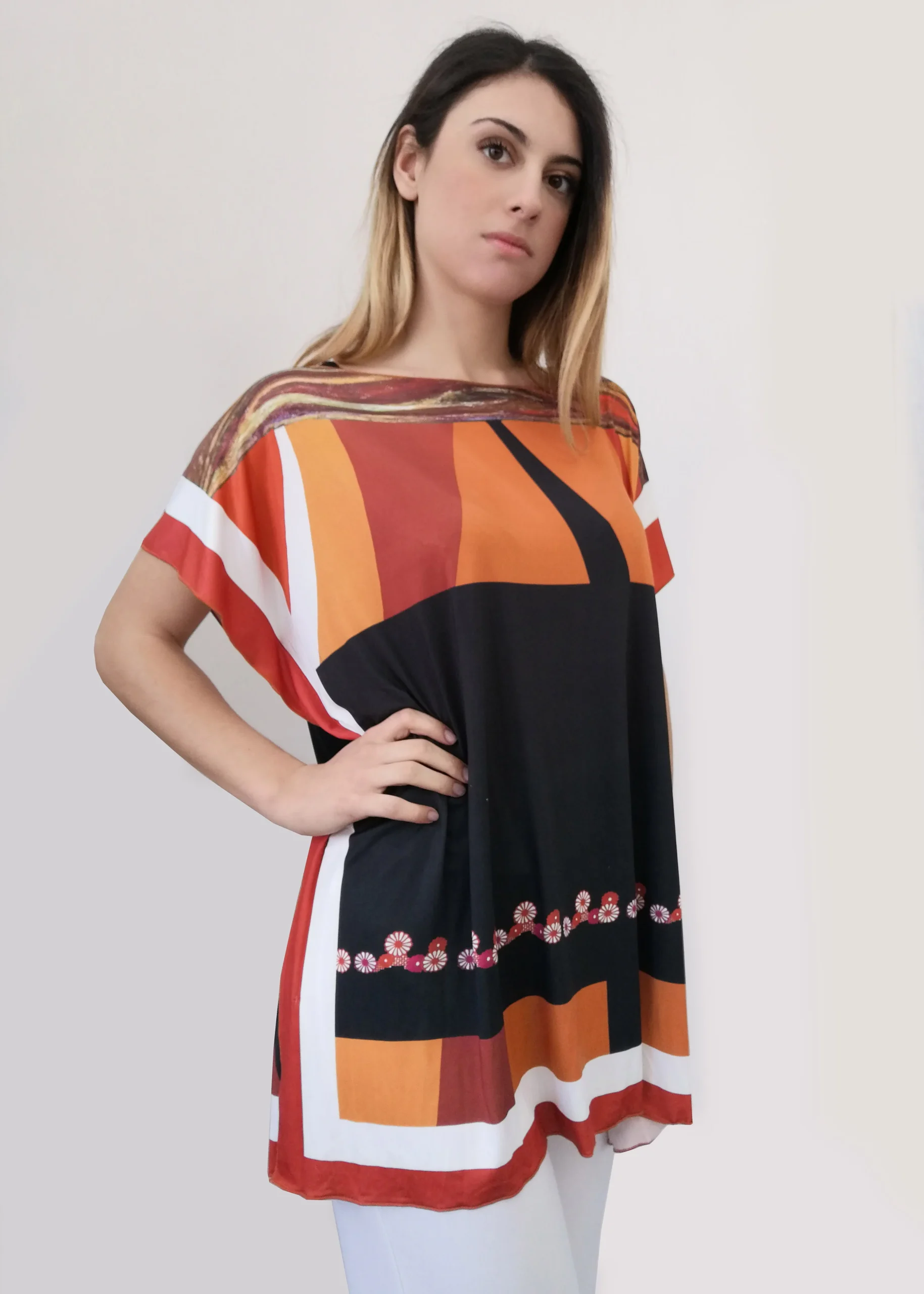 • 100% Made in Italy • colore disponibile: arancio • stampa “Geometrie” Millyblu • materiale: jersey • 94% PL, 6% EA |