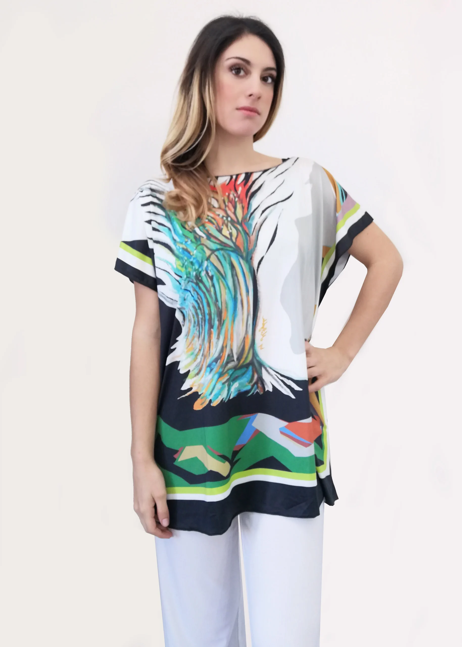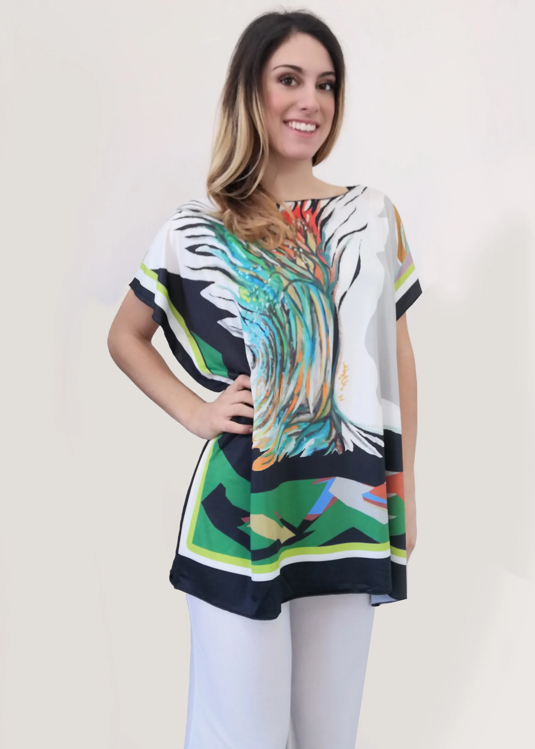 Maxi maglia in jersey dal dipinto “Bosco”, morbida e confortevole. Mettibile come copricostume o maglia over con dei pantaloni a palazzo. Le maxi maglie estive danno un tocco di classe e sono comode e sempre di tendenza. Non si stirano e sono perfette per chi viaggia. Taglia unica.