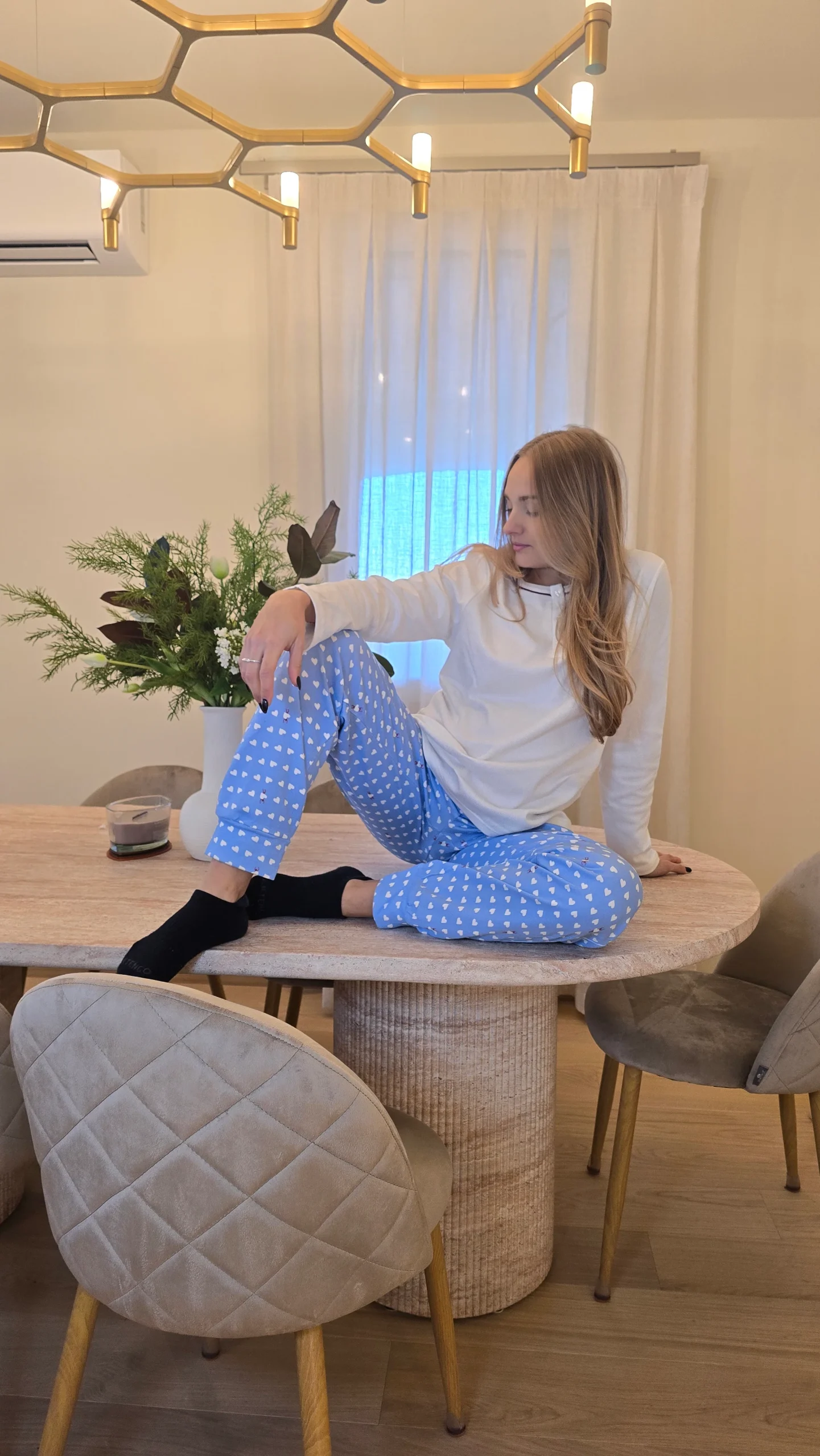 Pantalone a fantasia a base azzurro con cuori bianchi e maglia pulita tinta unita bianca