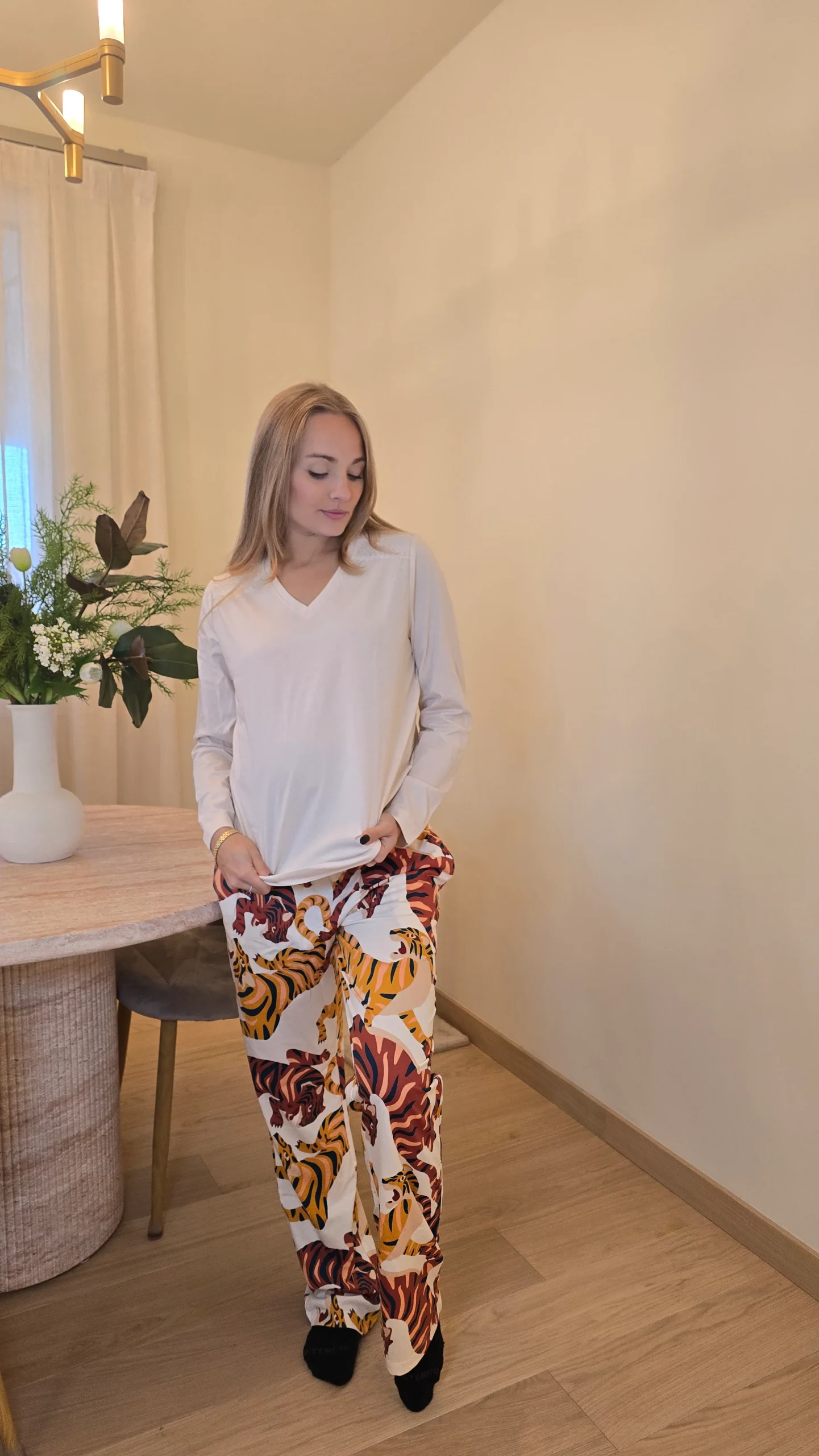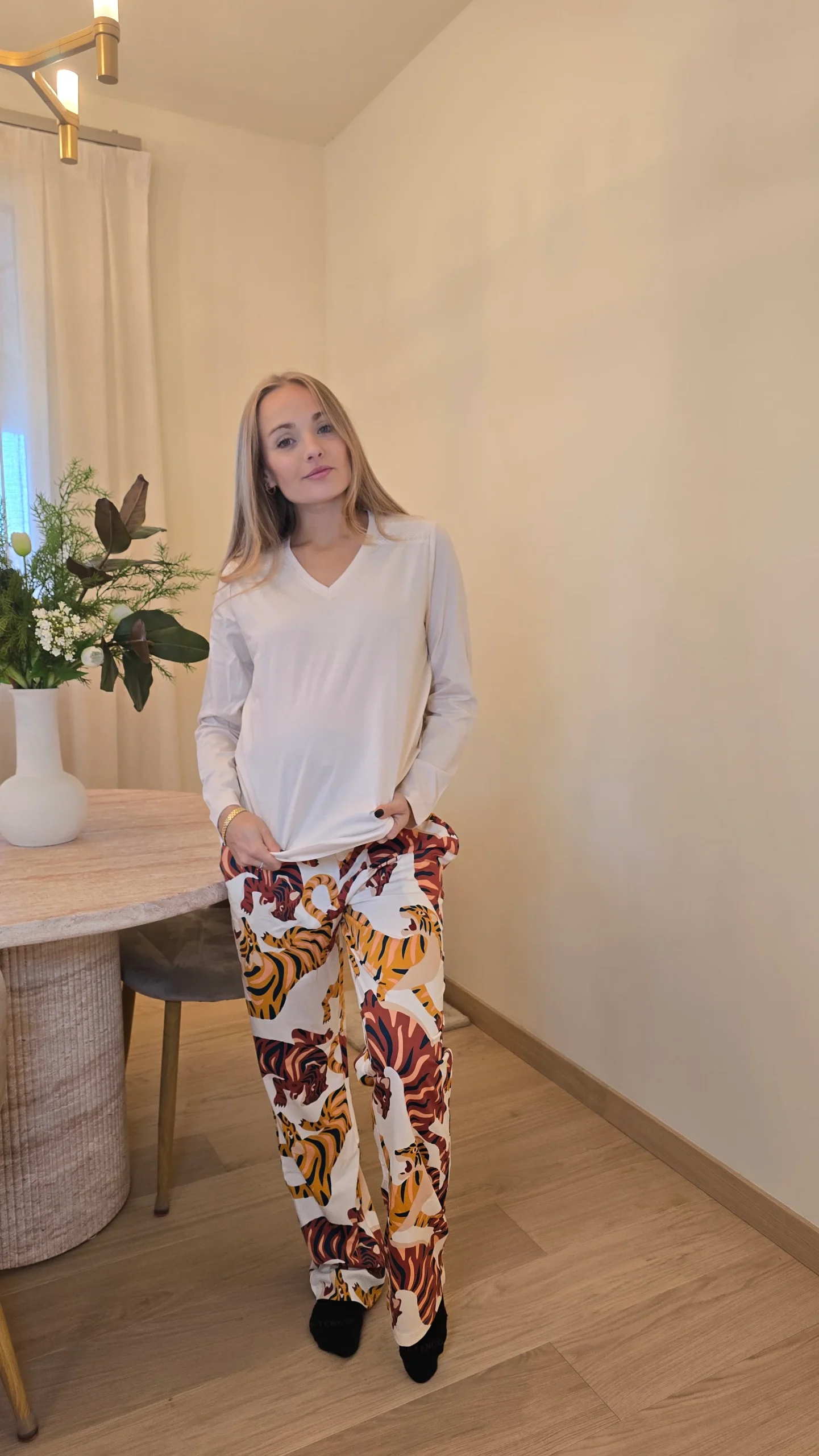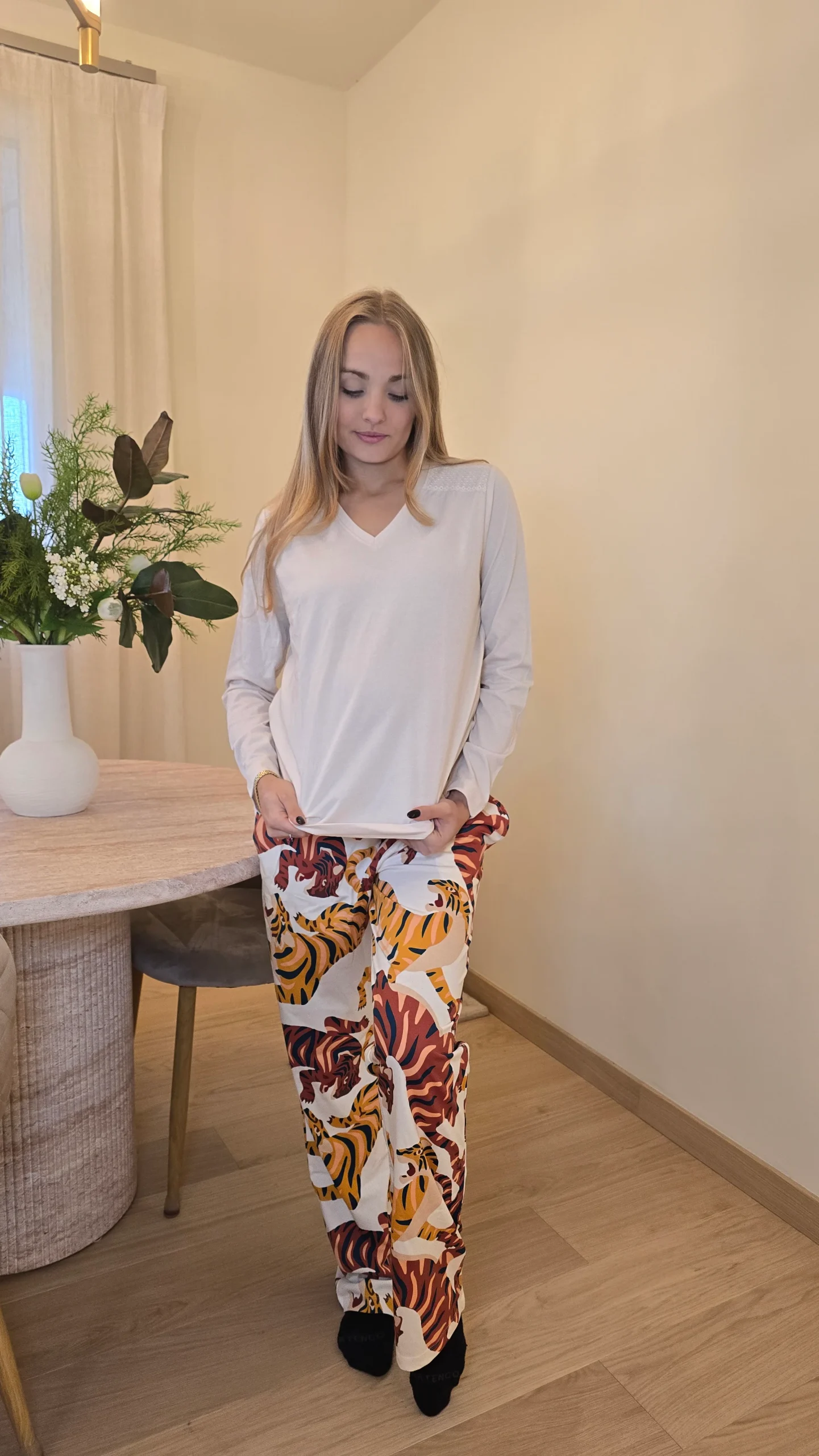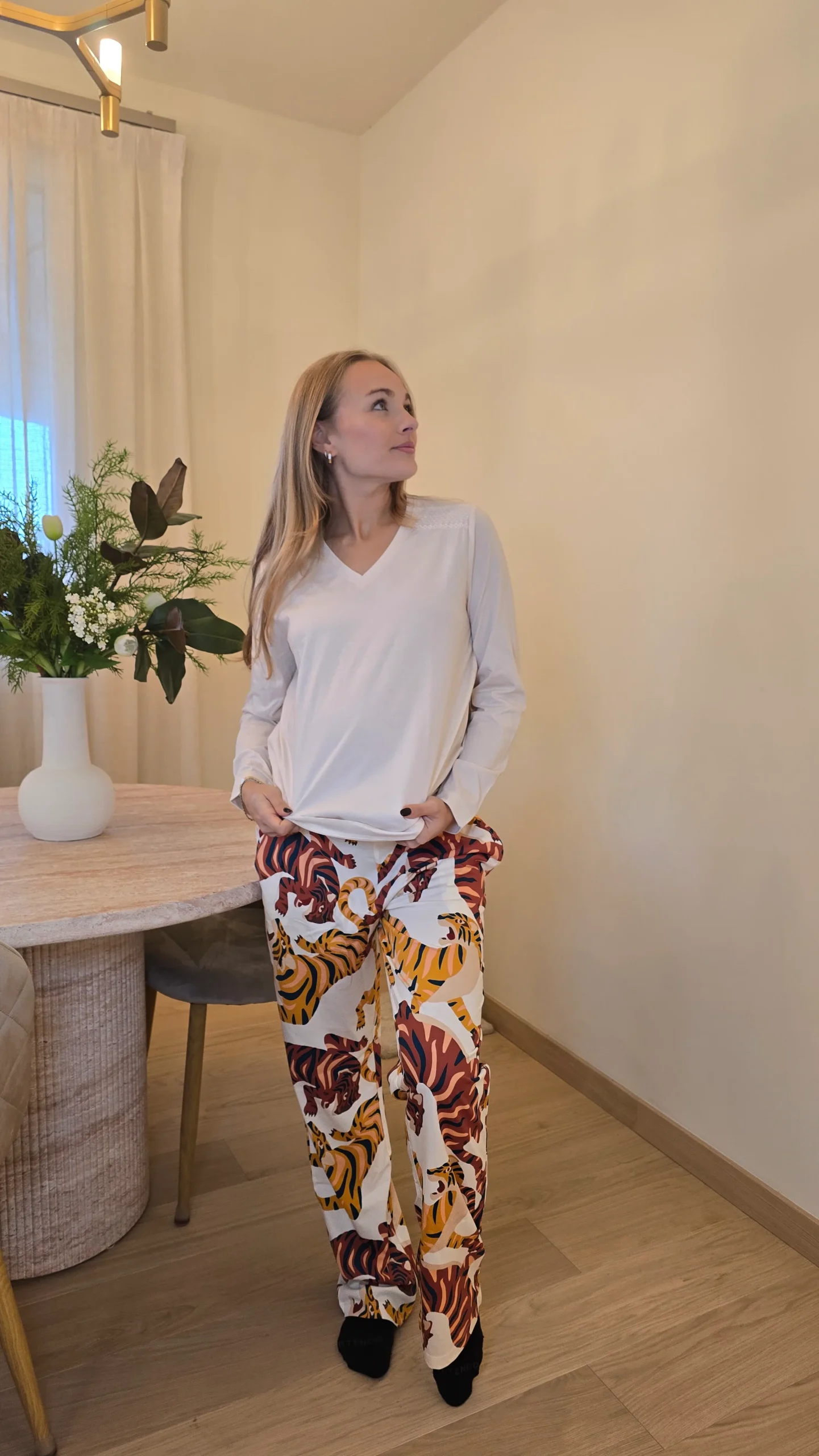 Pantalone a fantasia con tigri e maglia tinta unita con scollo leggero V