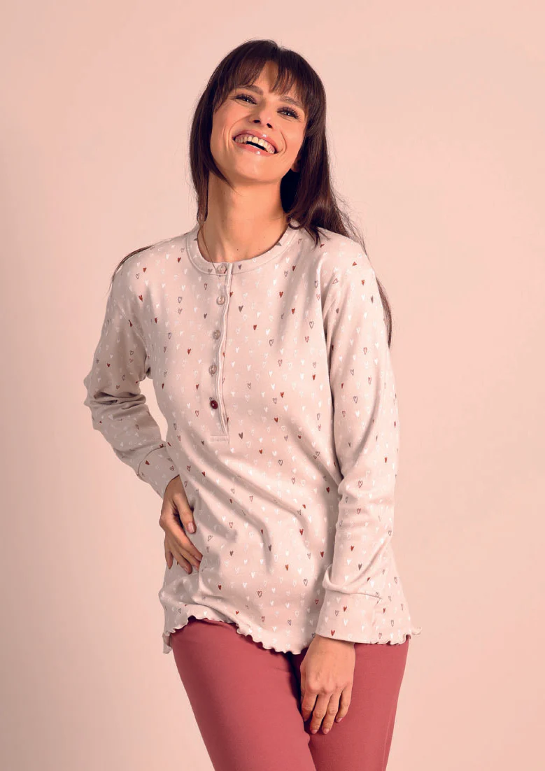 Grazie al tessuto caldo e morbido, questo pigiama assicura comfort e libertà di movimento, rendendolo ideale sia per rilassarsi in casa che per dormire serenamente. Un capo pratico, elegante e facile da indossare ogni giorno.