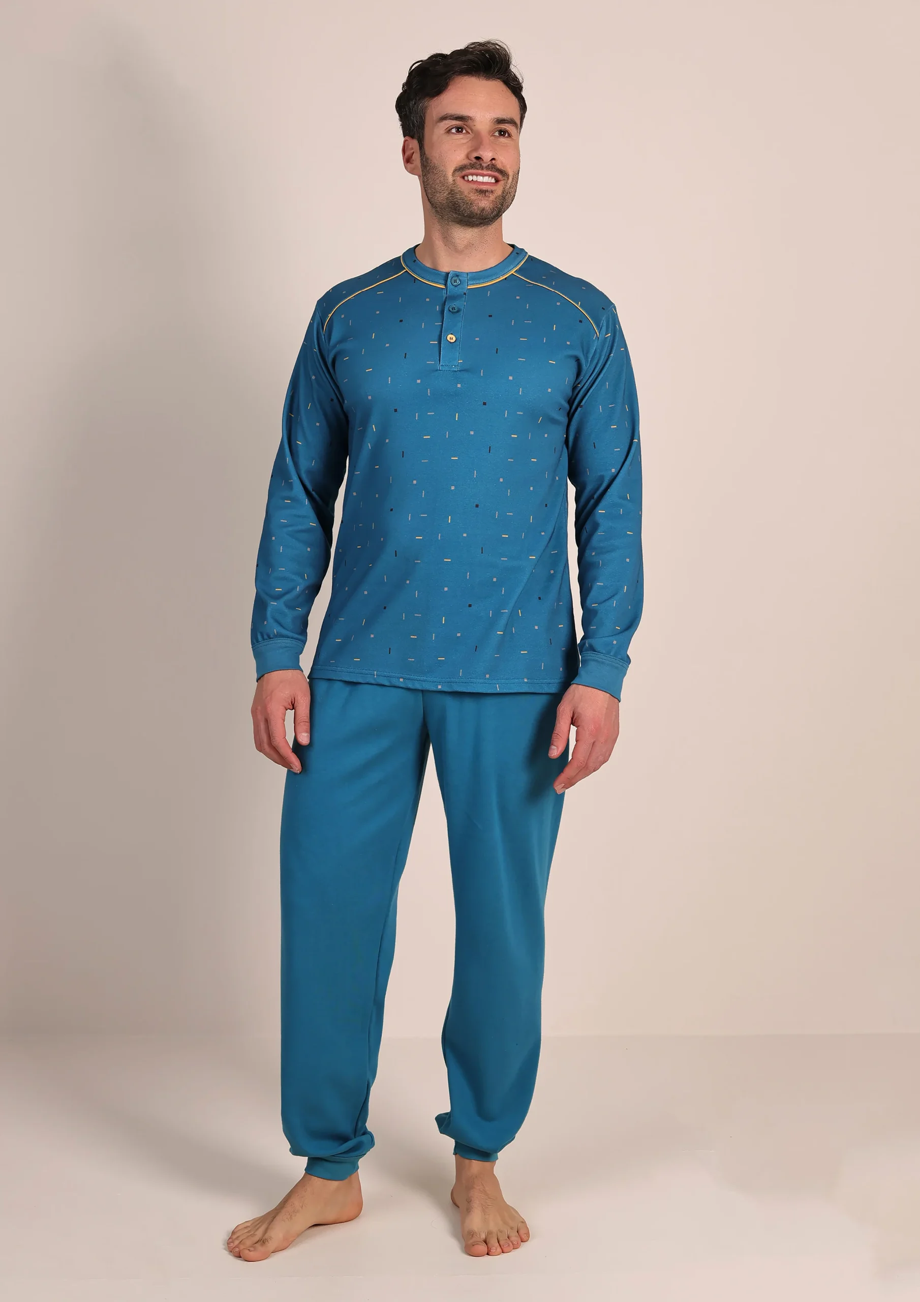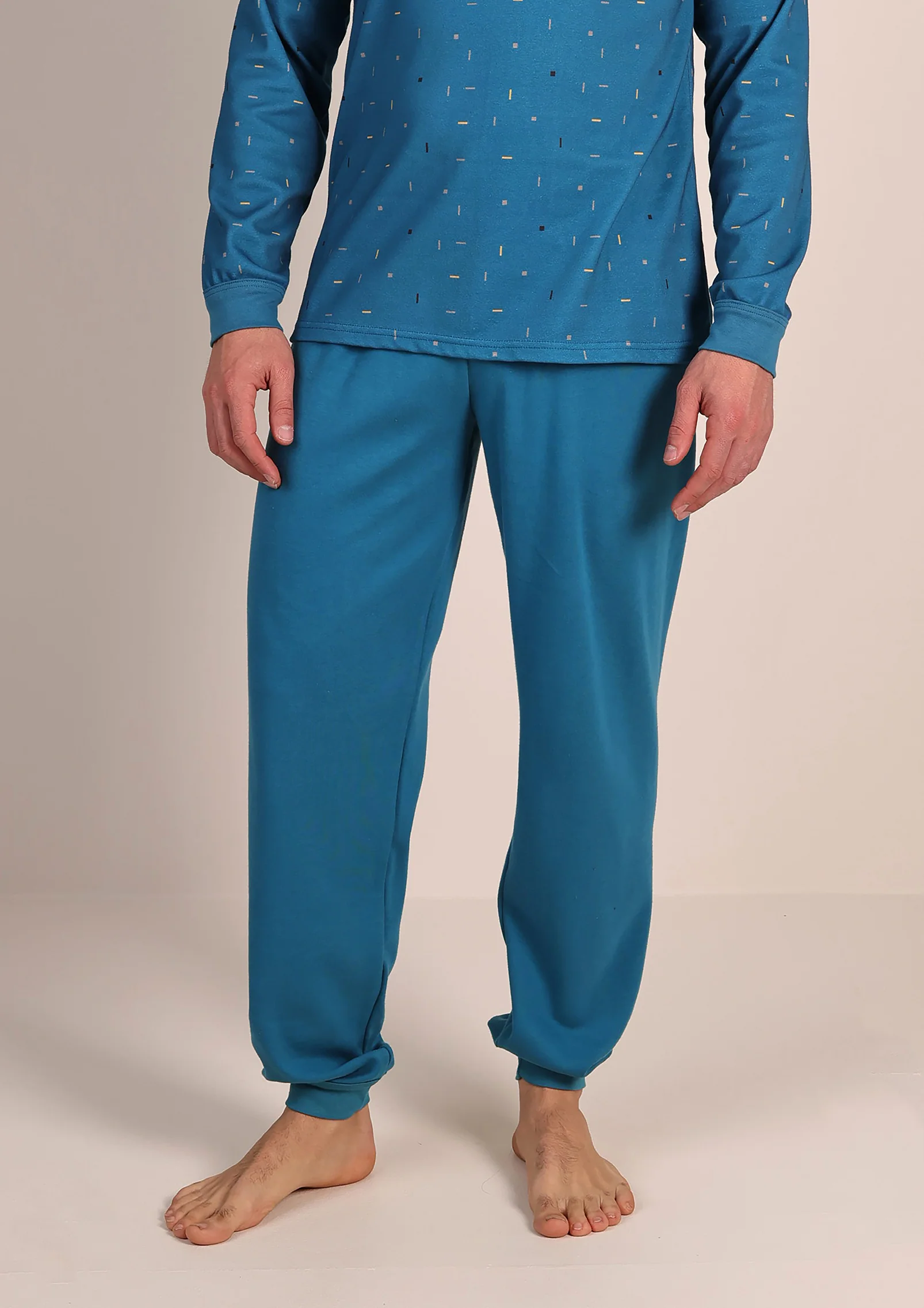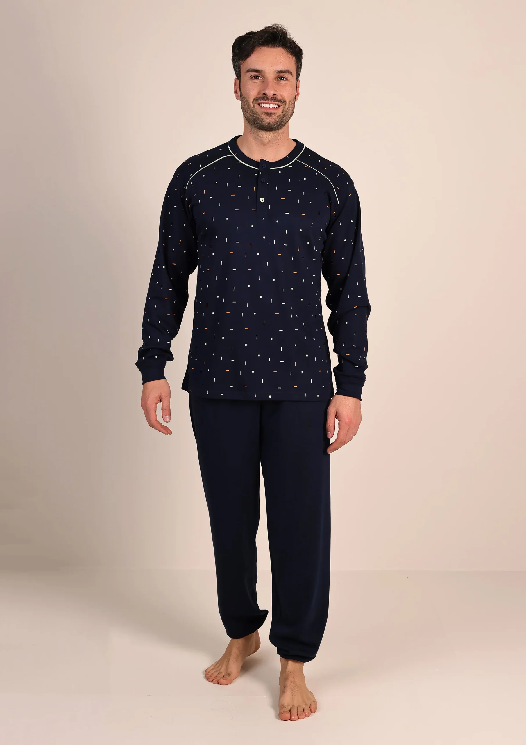 Comodo, pratico e ideale per le notti più fredde, questo pigiama da uomo in caldo cotone è pensato per offrire massimo comfort e stile. La maglia in fantasia aggiunge un tocco moderno e originale, mentre il pantalone tinta unita con polsino alla caviglia garantisce una vestibilità stabile, evitando che salga durante il sonno.