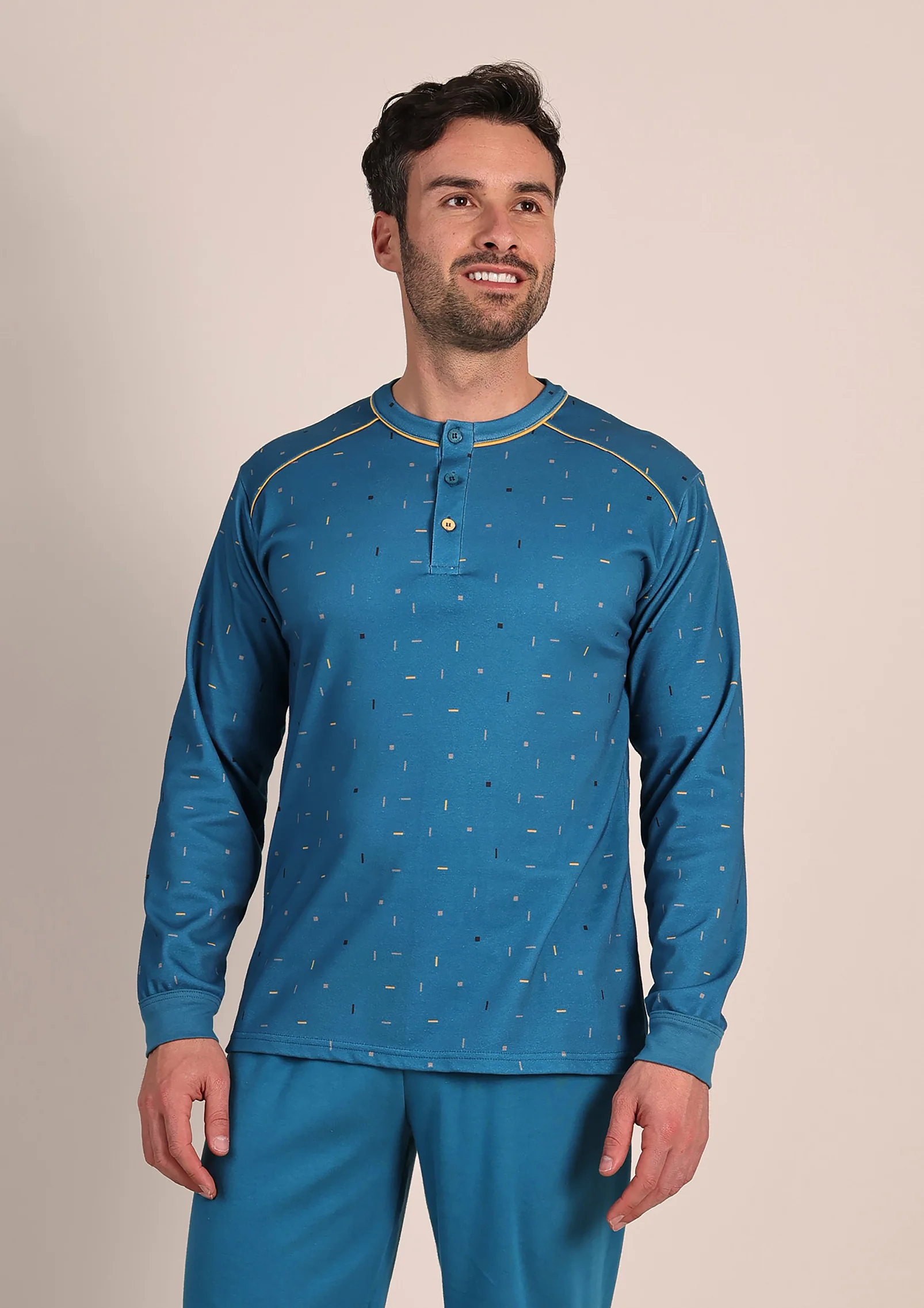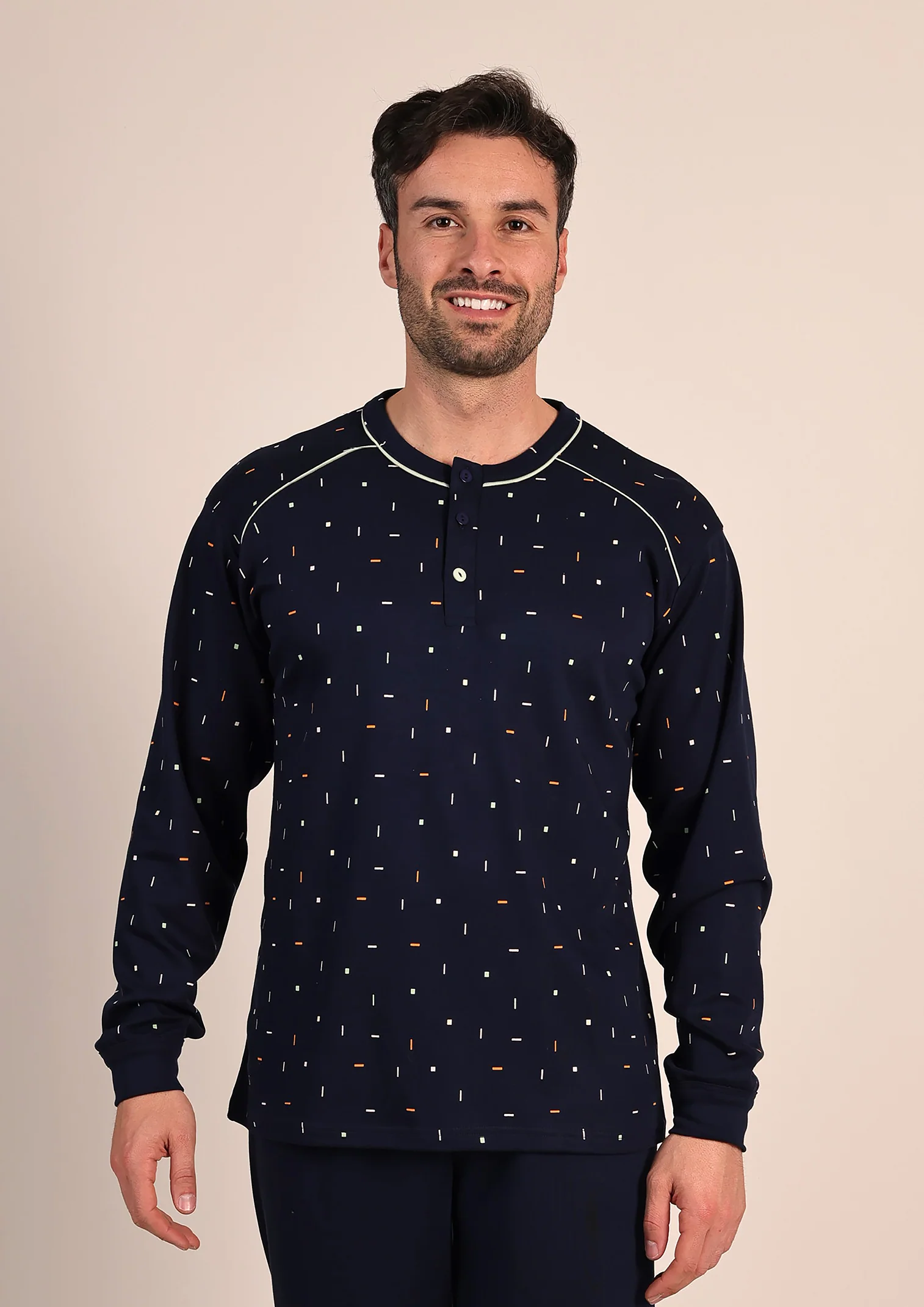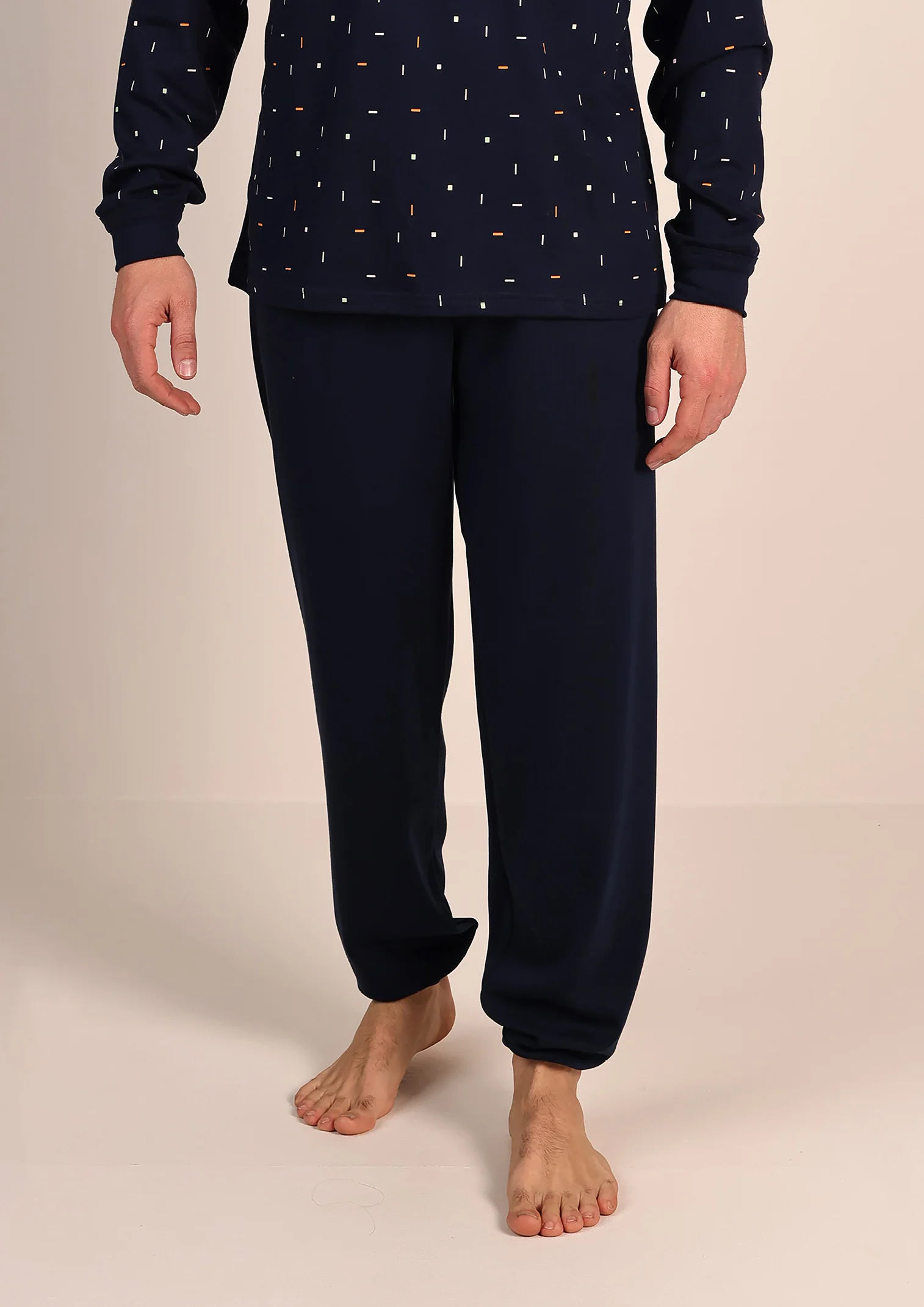 Comodo, pratico e ideale per le notti più fredde, questo pigiama da uomo in caldo cotone è pensato per offrire massimo comfort e stile. La maglia in fantasia aggiunge un tocco moderno e originale, mentre il pantalone tinta unita con polsino alla caviglia garantisce una vestibilità stabile, evitando che salga durante il sonno.