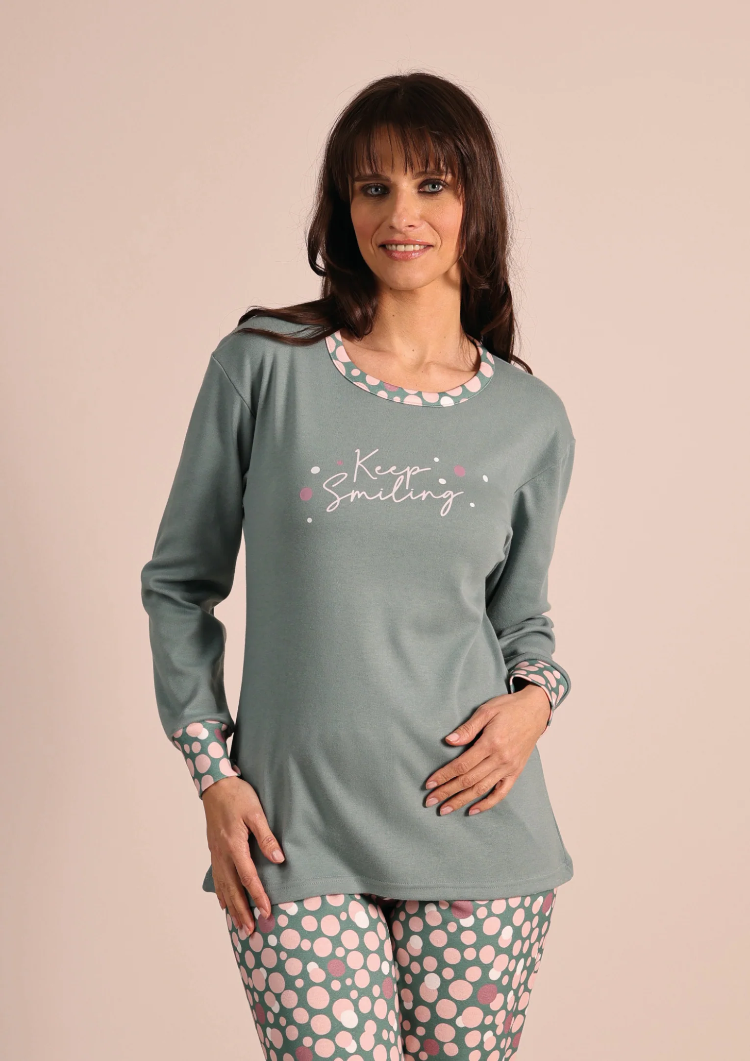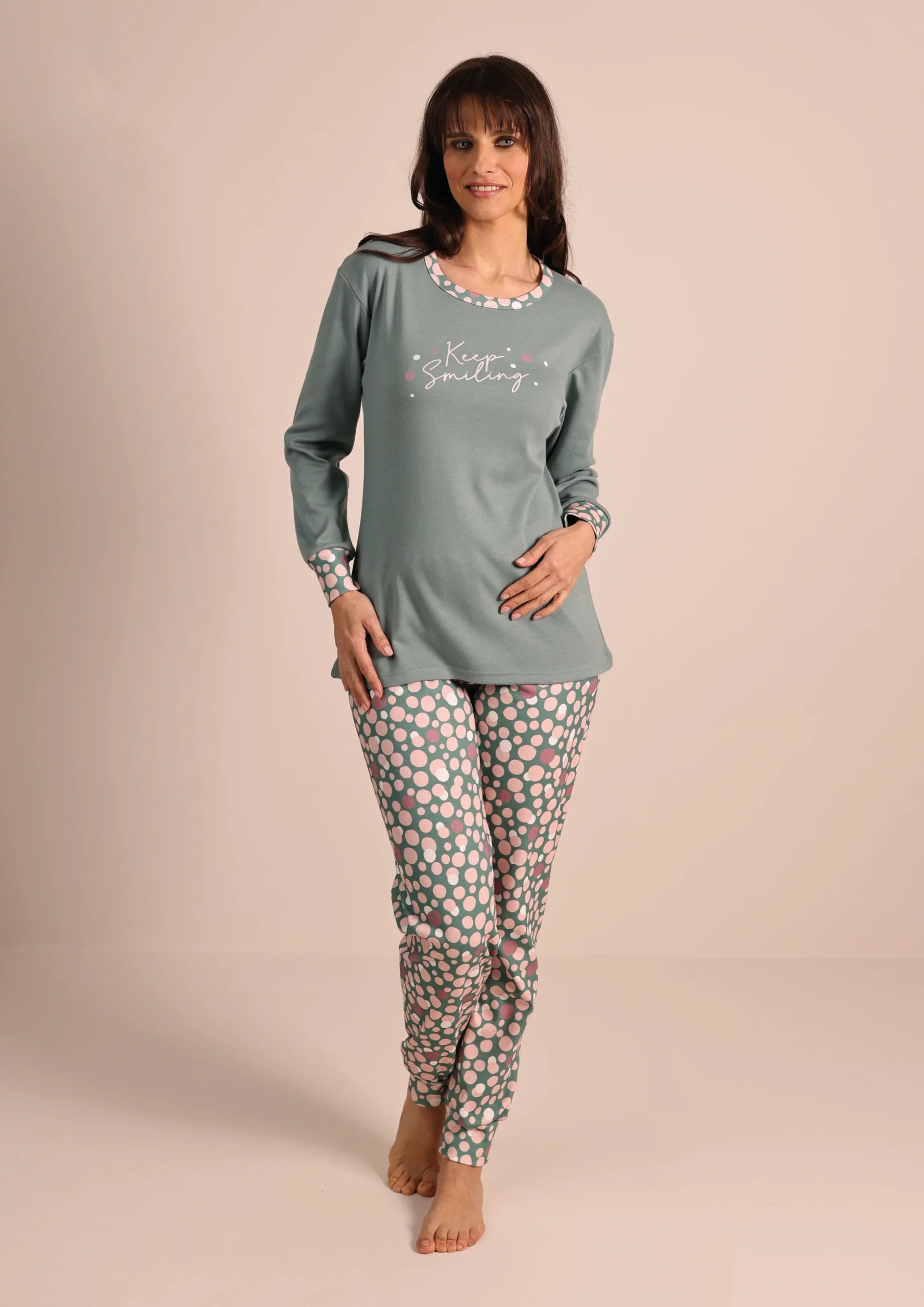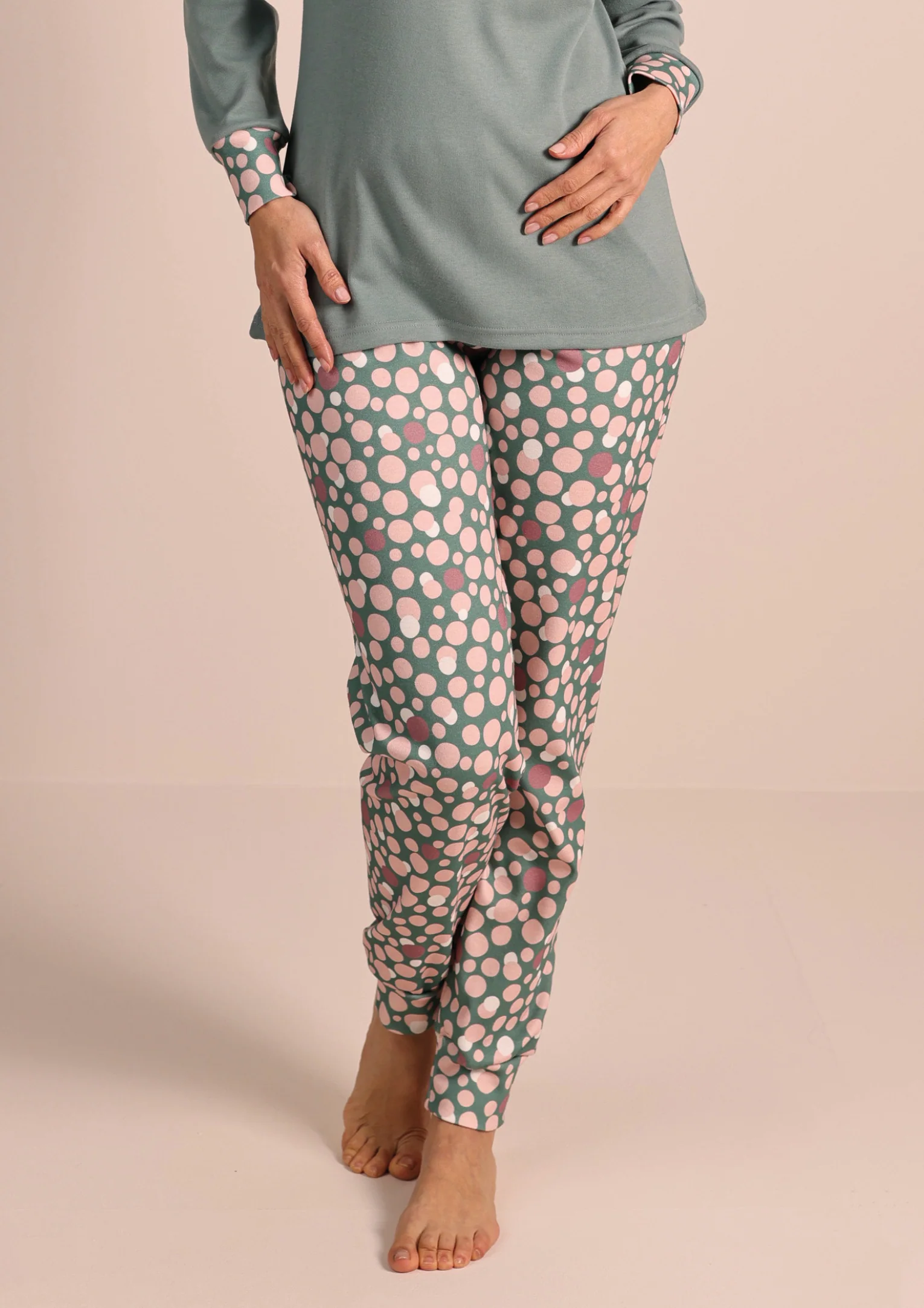 Avvolgente, comodo e perfetto per le serate fredde: questo pigiama da uomo in caldo cotone unisce praticità e stile. La pantalone in fantasia pois aggiunge un tocco vivace, mentre la maglia tinta unita con polsino garantisce una vestibilità ottimale, restando fermo senza salire durante la notte.