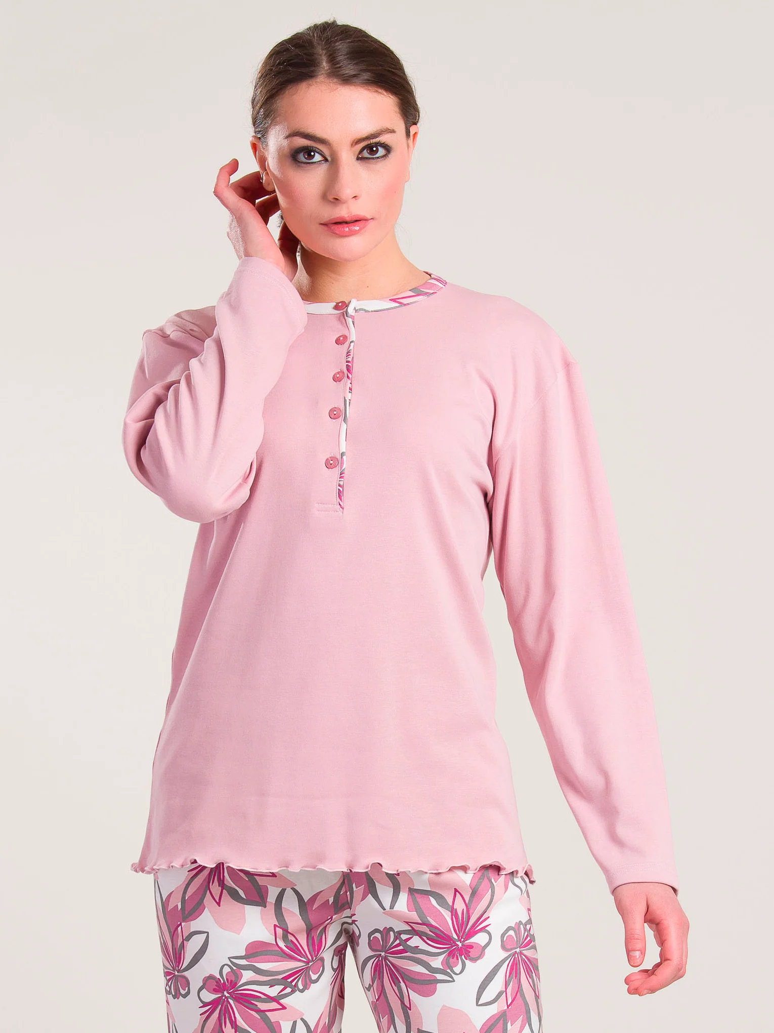 Concediti il massimo comfort con questo raffinato pigiama firmato Gary, pensato per coccolarti nelle serate di relax e durante il sonno. Realizzato con cura, questo completo combina uno stile casual e moderno. La maglia, in una delicata tonalità rosa, è caratterizzata da un elegante scollo a serafino con bottoncini che aggiungono un tocco di vivacità al design semplice ma sofisticato. I pantaloni, impreziositi da una stampa a a fiori, portano allegria al tuo guardaroba da notte, garantendo al contempo la massima libertà di movimento grazie alla morbida fascia in vita e alla linea rilassata.