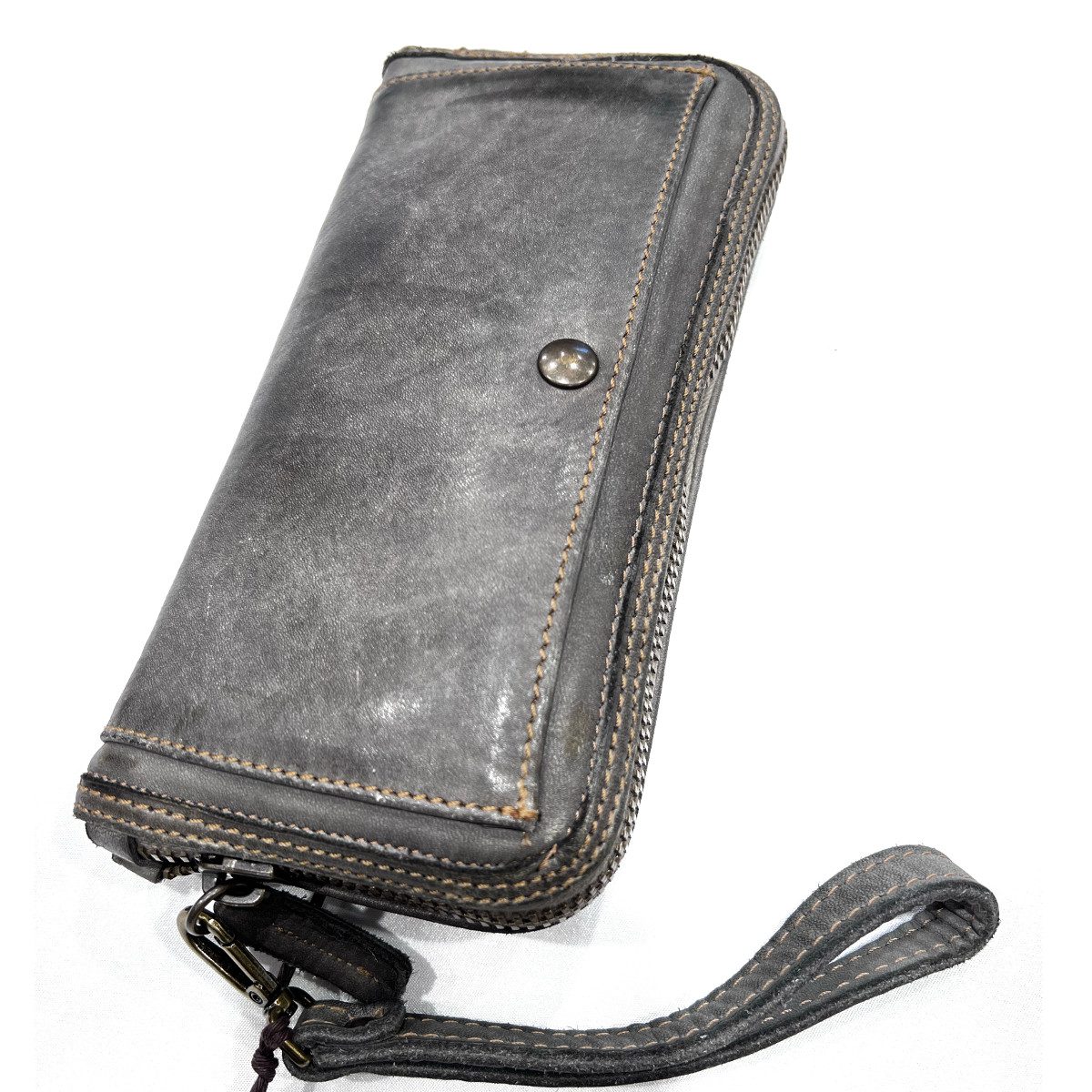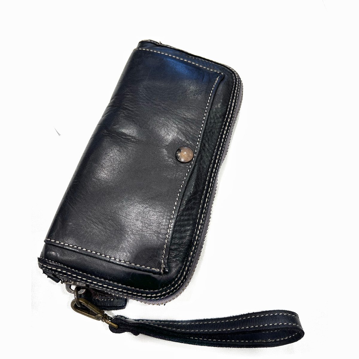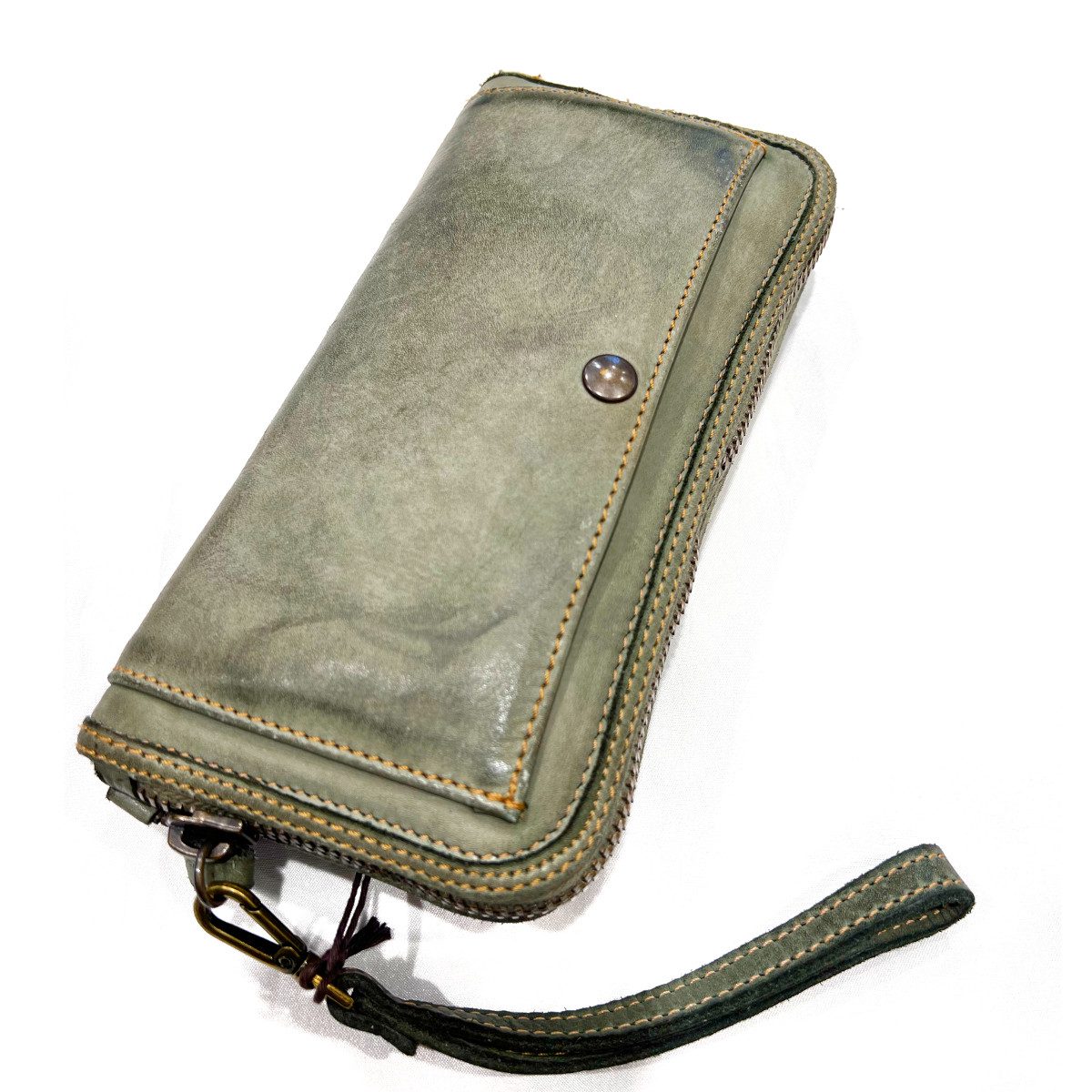 Questo portafoglio è realizzato da artigiani italiani, il vitello è tinto in capo, lavorazione che conferisce morbidezza al pellame e unicità  delle sfumature e del prodotto stesso. la costruzione interna è realizzata interamente in pelle, cioè non ha ha nessuna parte in tessuto. ( Non sono prodotti in serie, ogni prodotto è diverso) Questo portafoglio zip allround donna è caratterizzato da una piccola tasca con  bottone frontale e un tasca con zip sul retro. misure 22×11