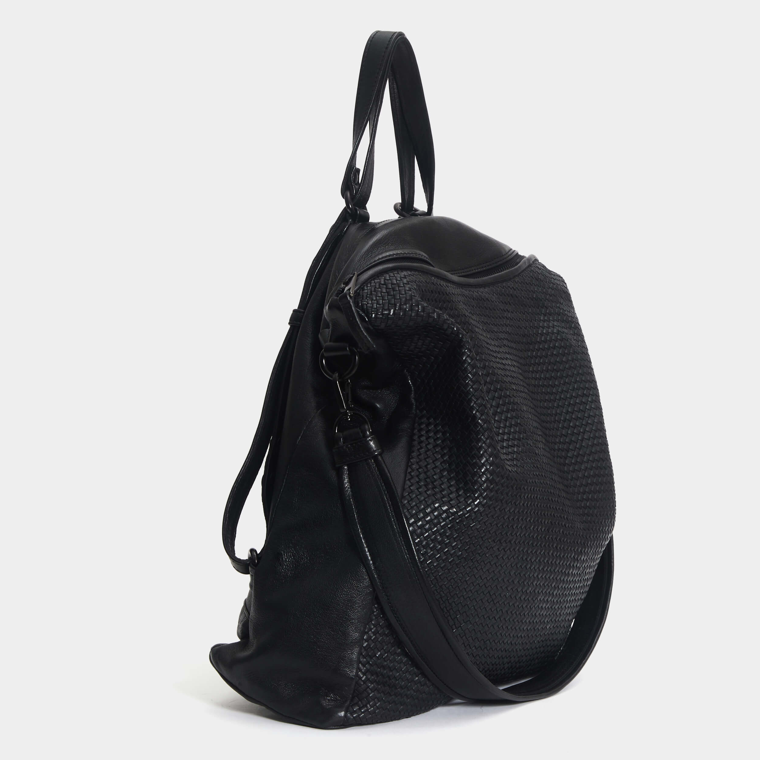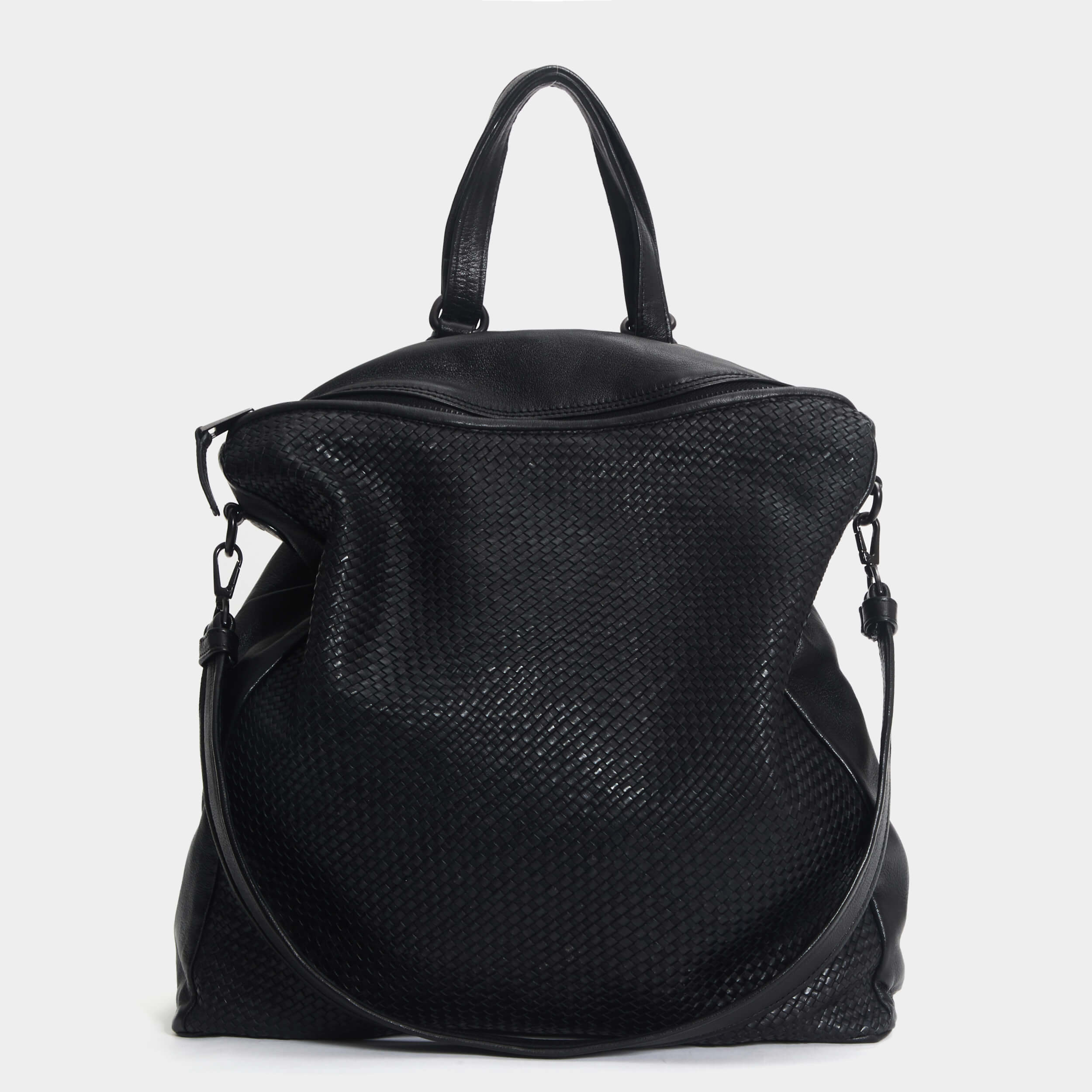 Altezza 40 cm Larghezza 35 cm Profondità 14 cm Composizione: Vitello. Zaino in pelle con tracolla. Fronte in pelle intrecciata. Chiusura con cerniera zip. Due tasche posteriori con zip. Spallacci in pelle con fibbia regolabile. Manico e tracolla in pelle. Fodera in cotone. Made in Italy.