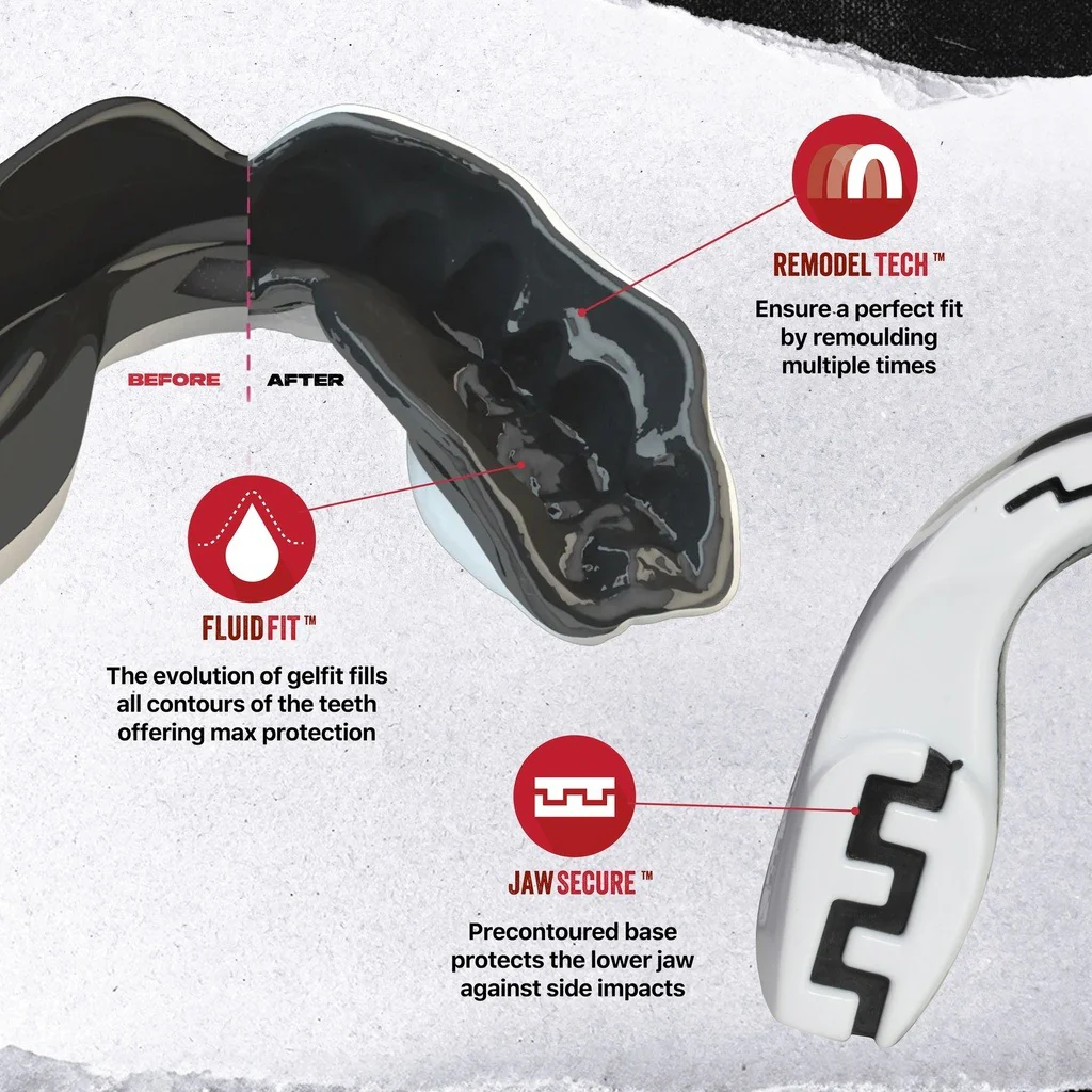 Dank der innovativen Fluid Fit™ Technologie passt sich der Zahnschutz wie ein Clip an deine Zähne an – für sicheren Halt ohne Einschränkungen beim Atmen oder Sprechen. So kannst du dich voll und ganz auf dein Training konzentrieren.