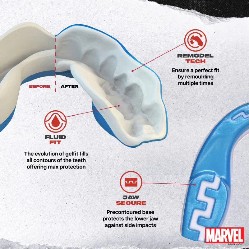 Mit dem auffälligen Captain America Design auf der Frontfläche kombinierst du patriotischen Style mit funktionalem Schutz. Wie alle Modelle der Marvel Series von SAFEJAWZ steht auch dieser Zahnschutz für „Protection with Personality“ – weil Charakter auch im Ring zählt.
