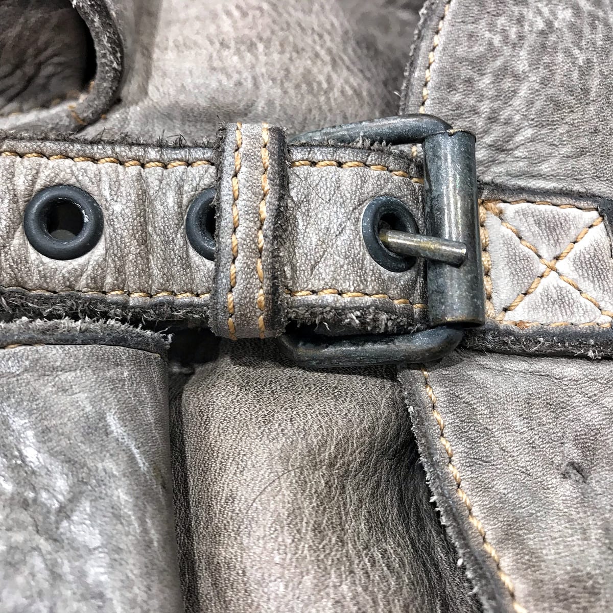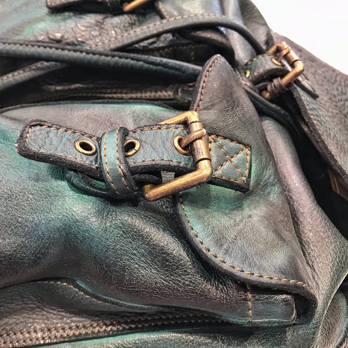 Il tinto in capo è una lavorazione che conferisce morbidezza al pellame e unicità delle sfumature e del prodotto stesso.(Non sono prodotti in serie, ogni prodotto è diverso).In questa lavorazione non c’è controllo sul esito del prodotto finale.Questa borsa è in pelle borchiata sulla parte frontale e liscia dietro, con manico e con tracolla lunga regolabile.Questo zaino è in classico “zaino a tre tasche”, uno degli zaini piu venduti al mondo.In questo caso è stata voluta seguire la tradizione e disegno, dando allo zaino chiusure a fibia ( senza magnete).Esternamente ci sono due tasche molto contenitive per in cui si possono comodamente inserire cellulari, sigarette, chiavi, fazzoletti ecc ecc.La patta è anche essa a chiusura fibia e oltretutto sotto che la possibilità di strozzare apertura con lacci in pelle con cravattino per fermarlo.Sul retro si apprezza la semplicità e l ‘ uso delle doppie cuciture che danno anima ala costruzione dello stesso.Le tracolle sono regolabili.